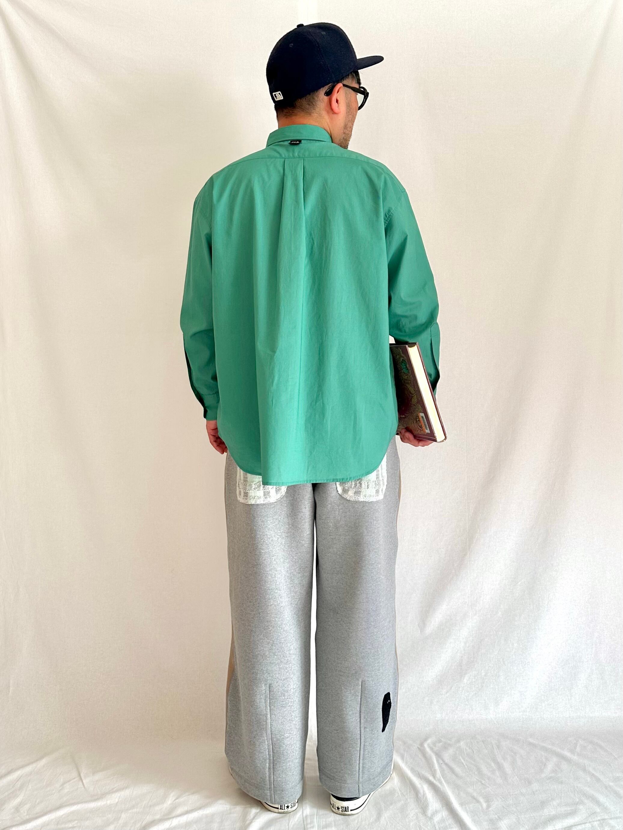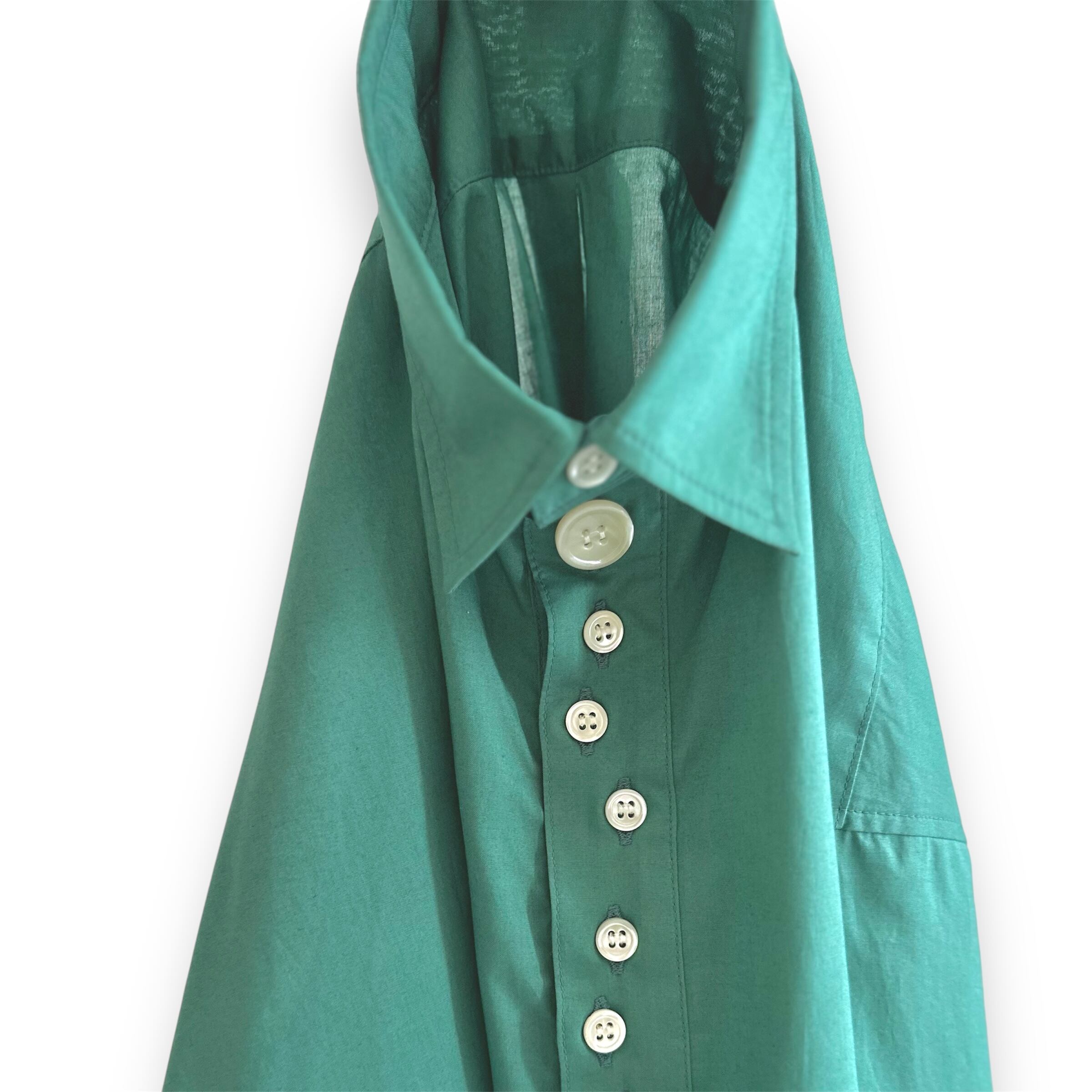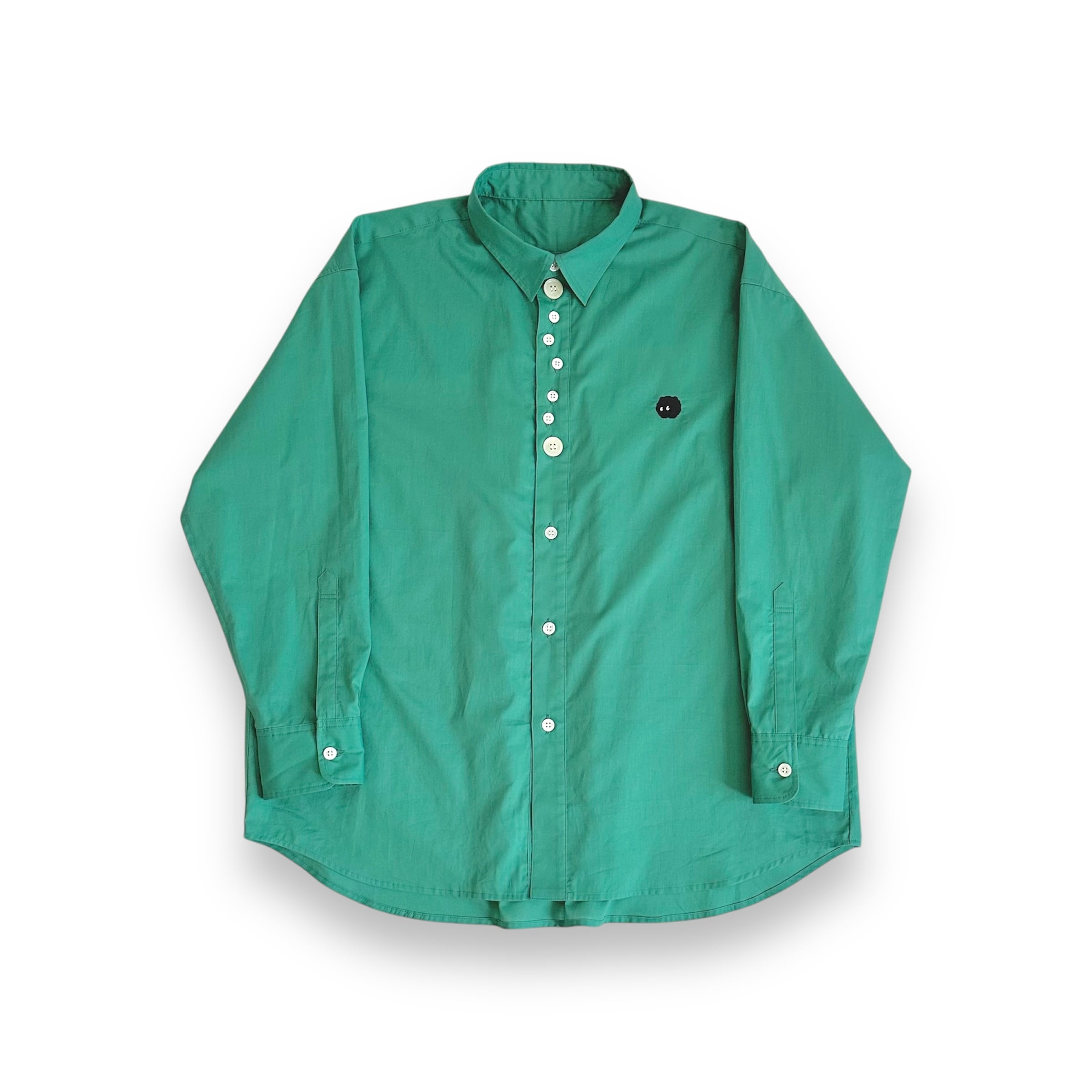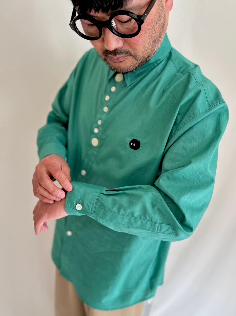 薄手の60sコットンローン素材を使用したきれい色のシャツ。大きさの異なる高瀬貝ボタンがランダムに配置され、遊び心を感じられるデザイン。“This is not a cat.”の人気モチーフ「モジャ」の小さなフラット刺繍が胸にさりげなく施されているのもポイントです。