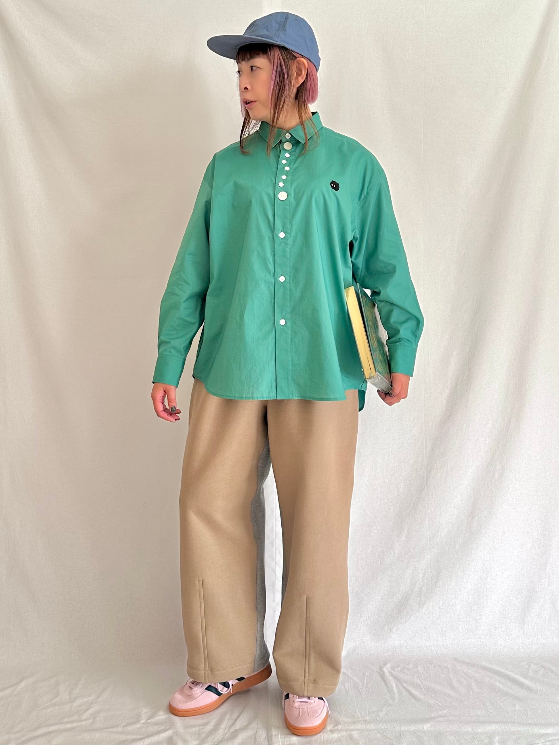 ・薄手のコットンローン素材でつくったきれい色のシャツ。メンズライクなデザインと、軽やかな素材感の組み合わせが不思議とマッチして、大人っぽさのあるアイテムに仕上げました。“This is not a cat.”の人気モチーフ「モジャ」の小さなフラット刺繍が胸にさりげなく施されているのもポイントです。