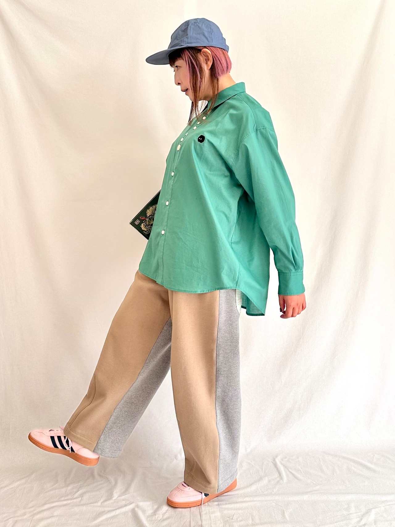 ・上にトップスを重ねてもかさばらず、オーバーシャツとして羽織としても着られるゆったりとしたサイズ感。リラックス感がありながら、メンズライクなシャツカラーやカフス仕立ての袖口のデザインなどのディテールがきちんと感を演出します。