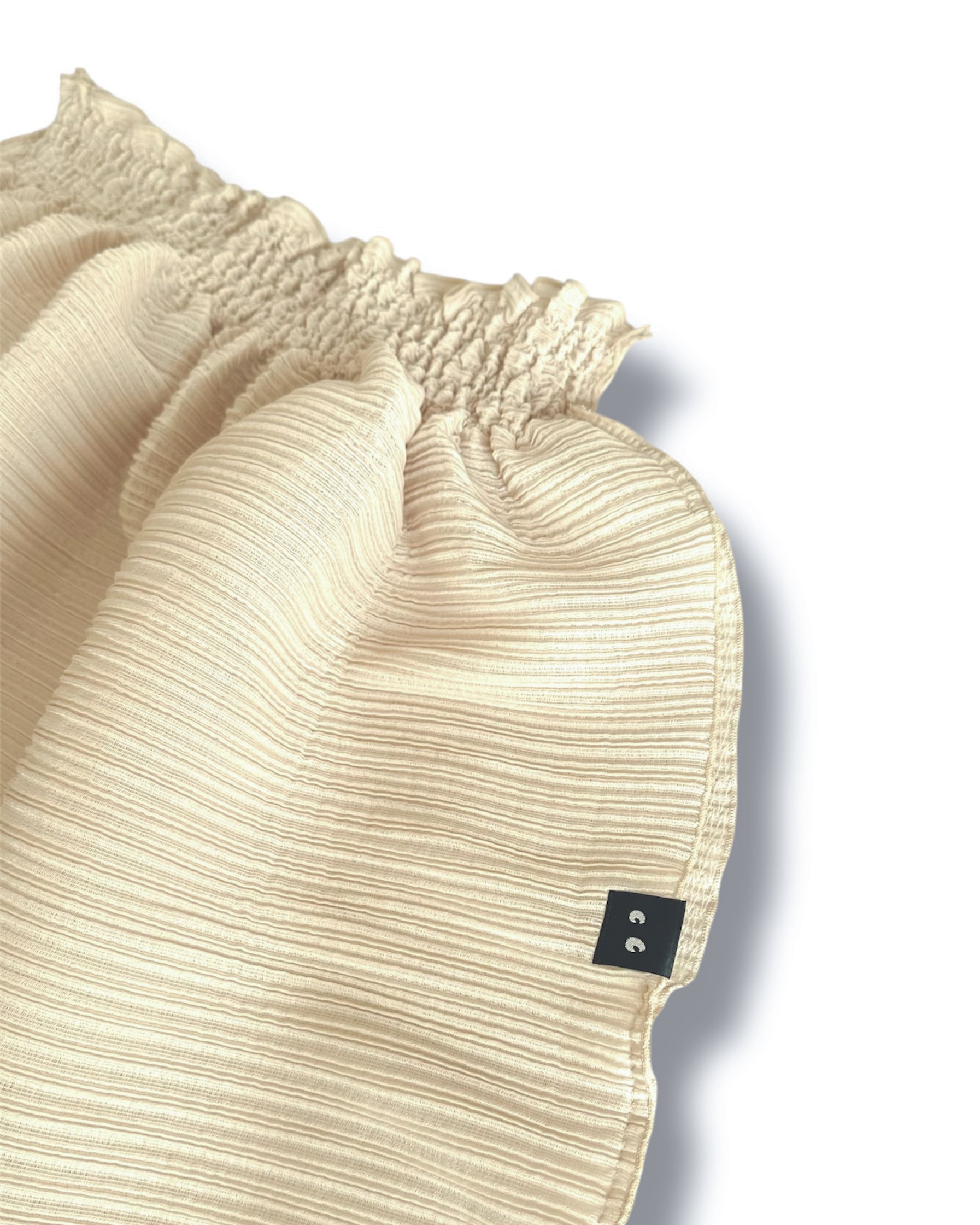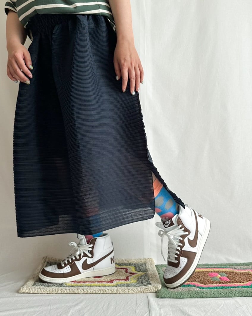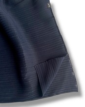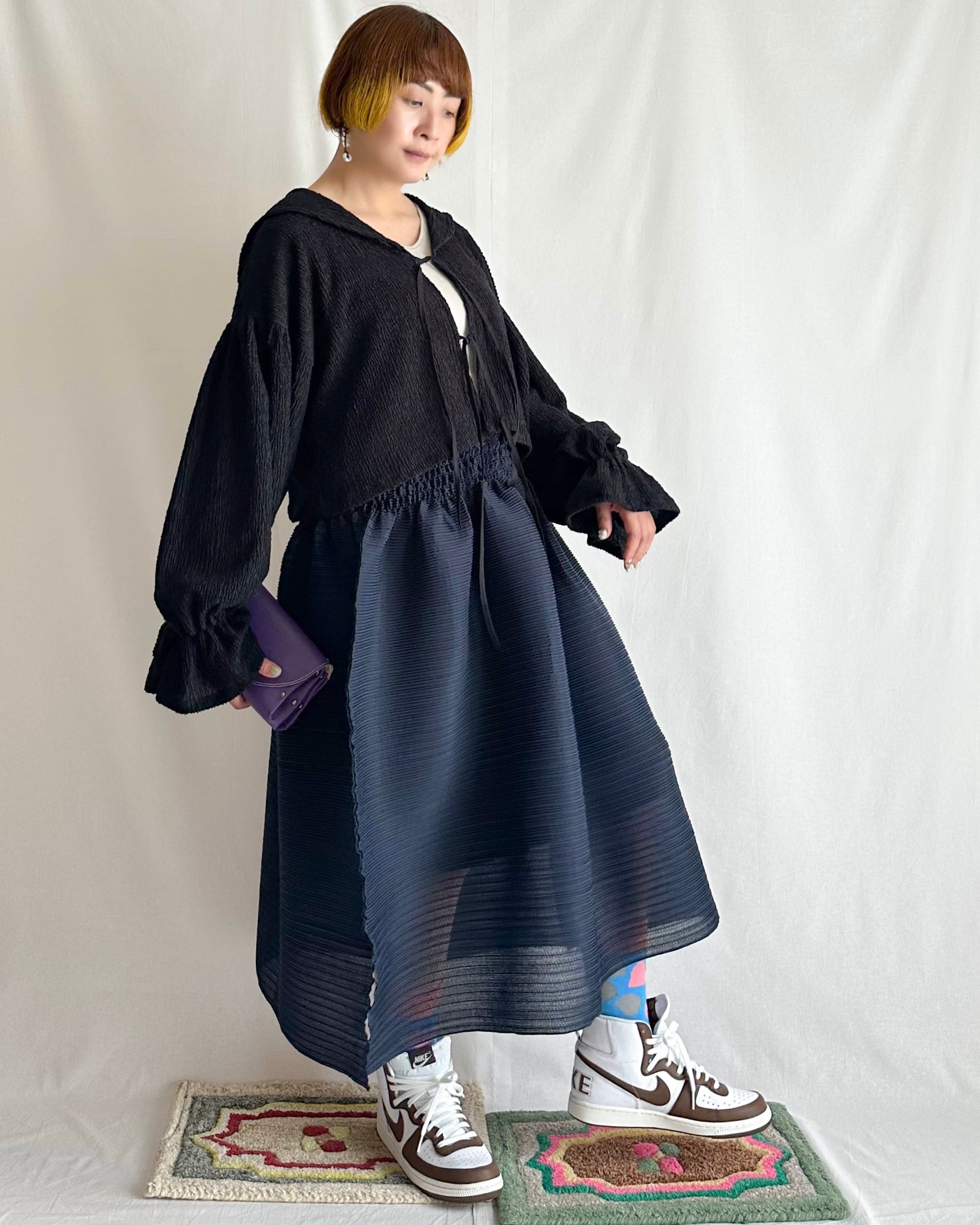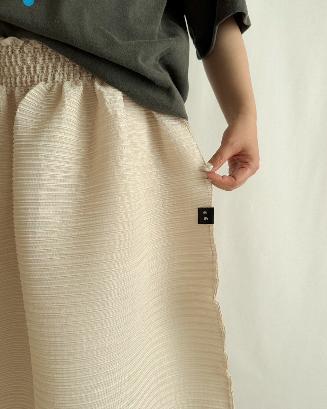 日本のものづくりの技術をもとに、特殊なカールマイヤー機で編み立てたリサイクルブルーゼを使用。プリーツ加工をしなくても、編み地だけで縦畝のような表情を生む、軽やかなジャージ素材です。この生地をあえて横方向に使うことで、伸縮性とキックバック性が生き、着て動くたびに上下にはずむようなリズムを楽しめます。