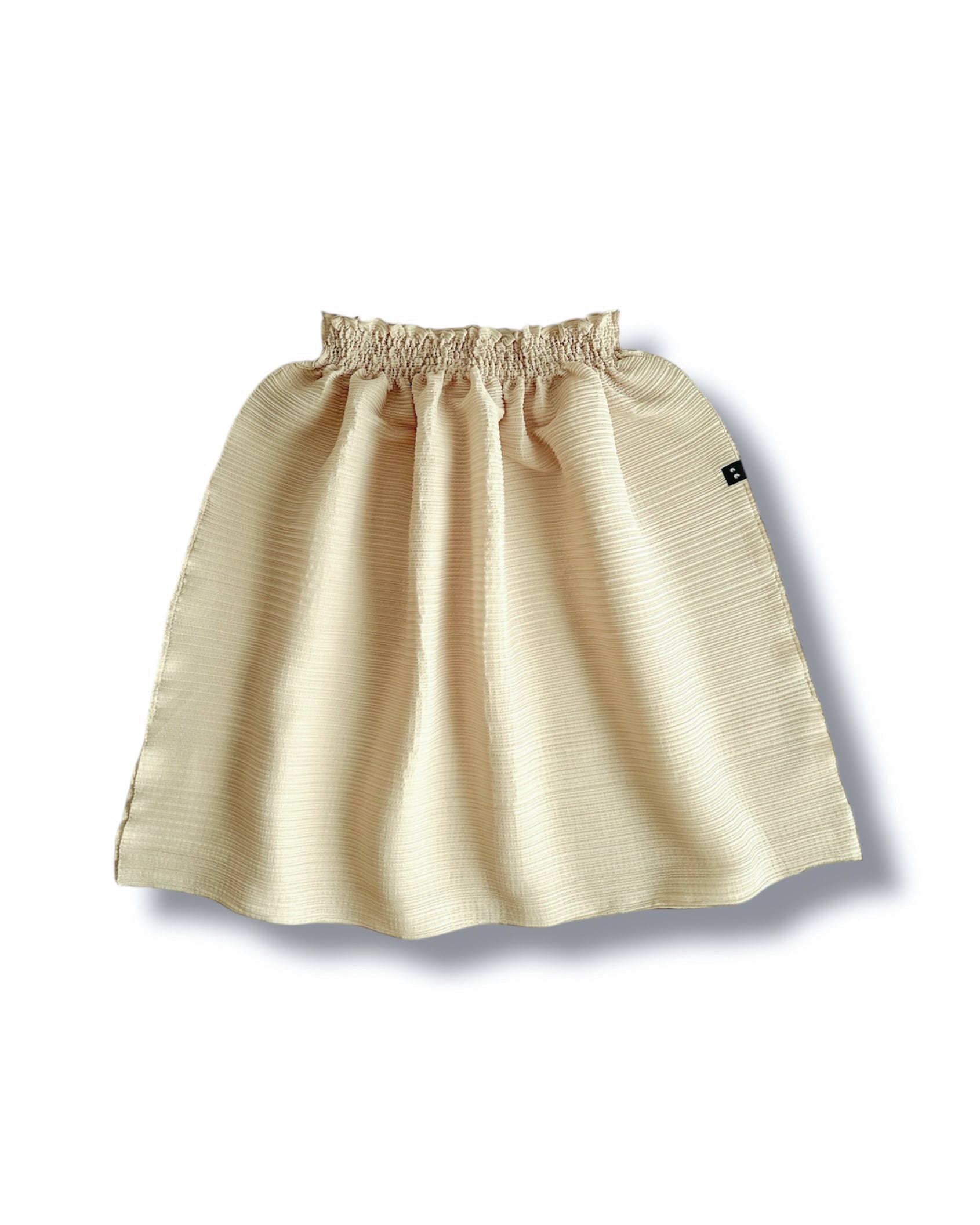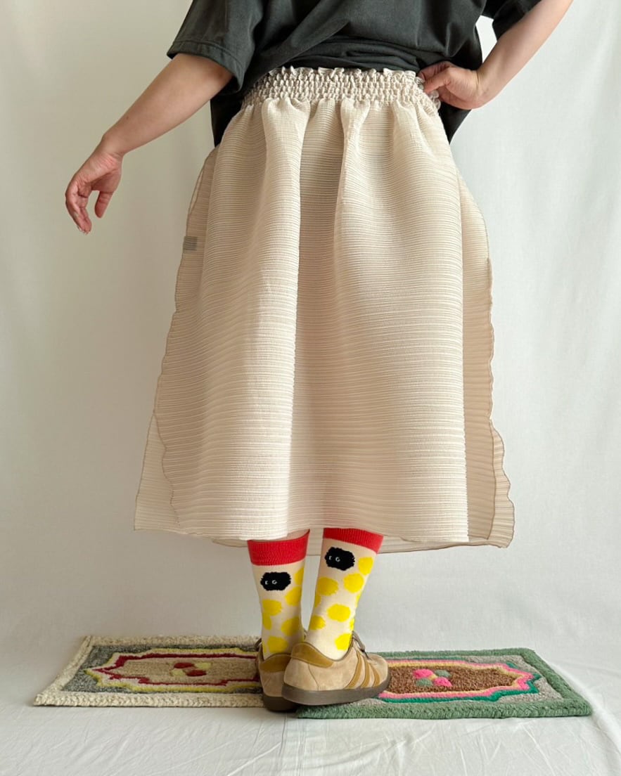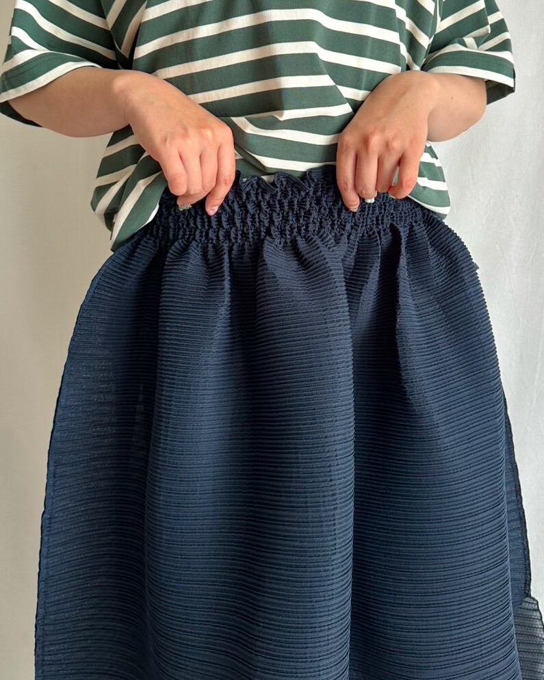 ウエストにギャザーを寄せることで生地にほどよいハリが生まれ、ふわっと空気をまとったようなシルエットに。動くたびに軽やかに揺れるボリューム感が、装いにやさしい華やかさを与えます。