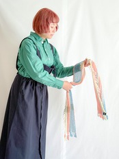 ・今回のミニストールは、シャトル織機と遜色のない風合いのいい織物がつくれるレピア織機で織られたもの。その最大の特徴であるふさ状の耳を生かして、左右上下にフリンジをデザイン。軽やかに風に揺れる様子は、さりげない華やかさと、動きのある表情をプラスします。