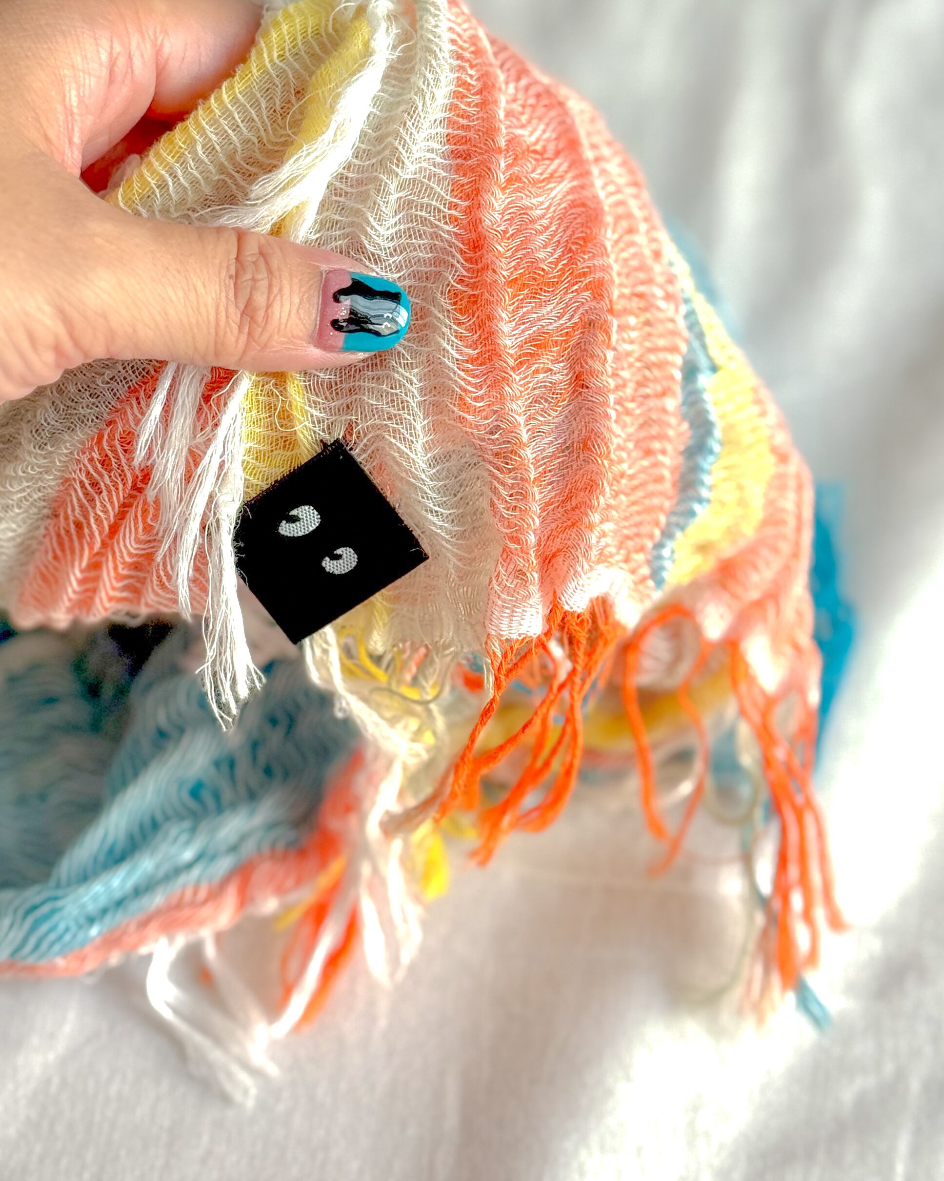 ・つつみこまれるような光をイメージした配色デザイン。ターコイズブルーやオレンジなどエネルギーのある色を緯糸に、オフホワイトを経糸に使って織ることで、肌になじむやさしい表情に。