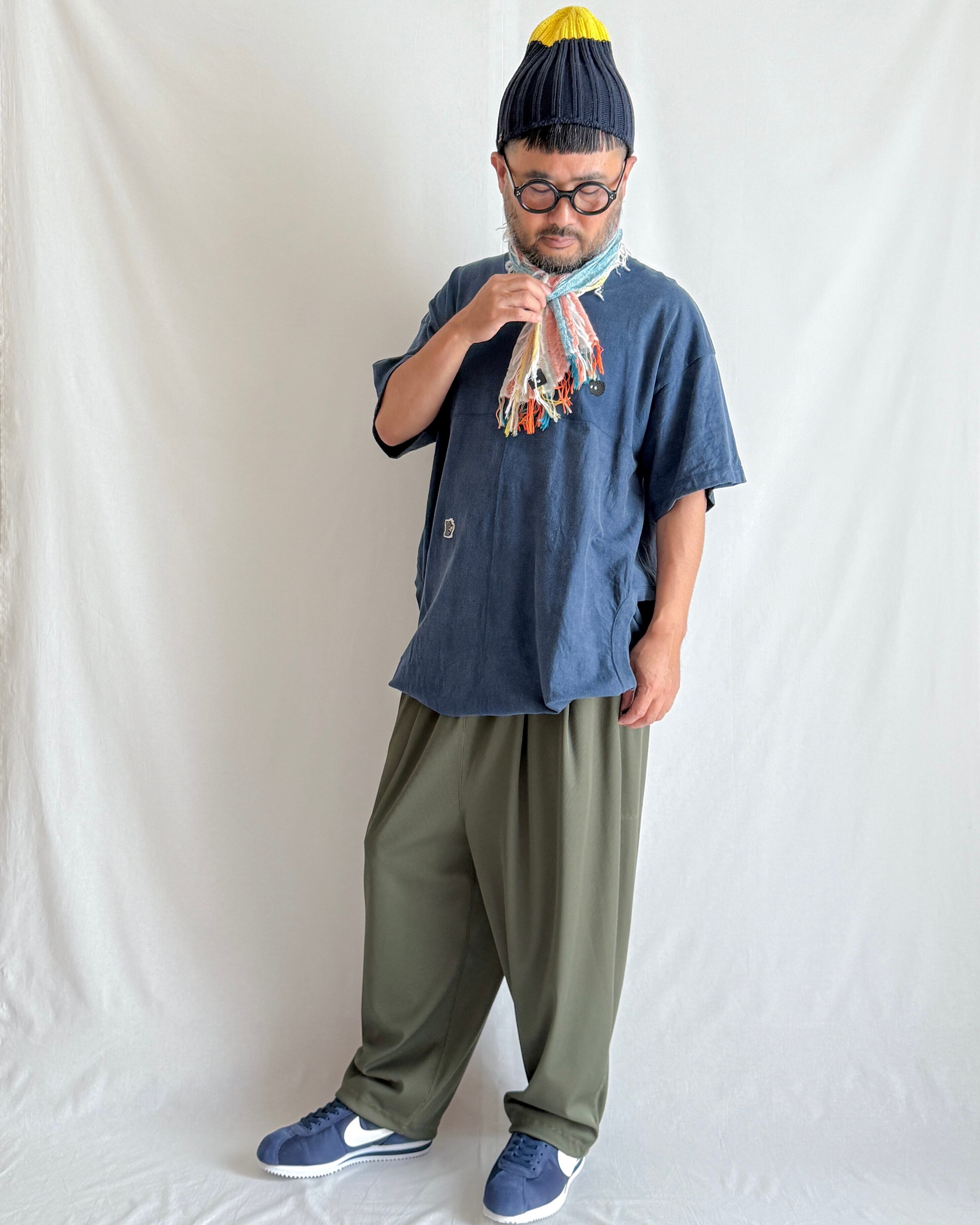 ・経糸と緯糸に太さの異なる綿コーマ糸を用い、右上がりと左上がりの綾織りを組み合わせた変化組織で、視覚的な動きを表現。タンブラー乾燥で仕上げることで、自然な揺らぎとふんわりとした風合いを持たせています。