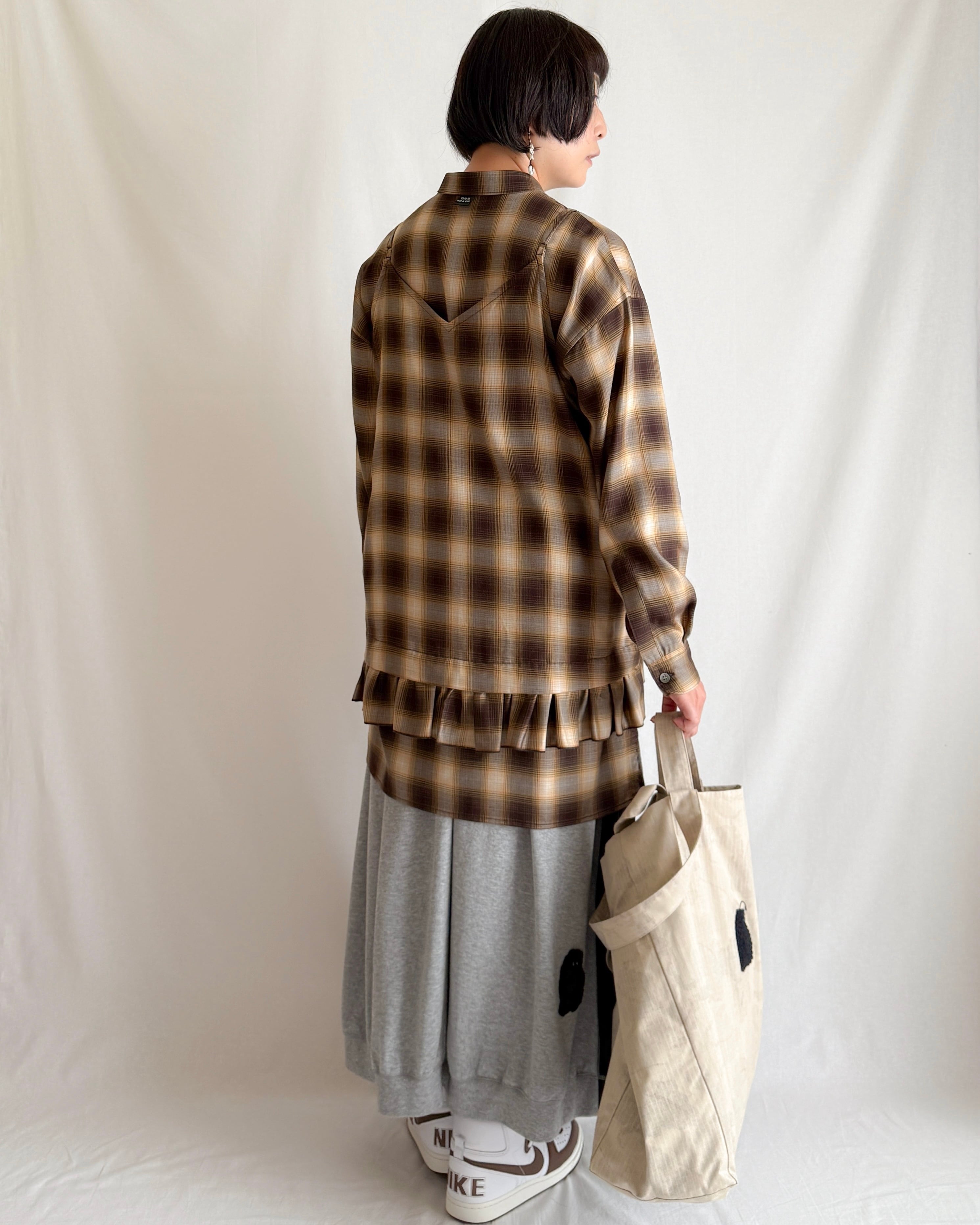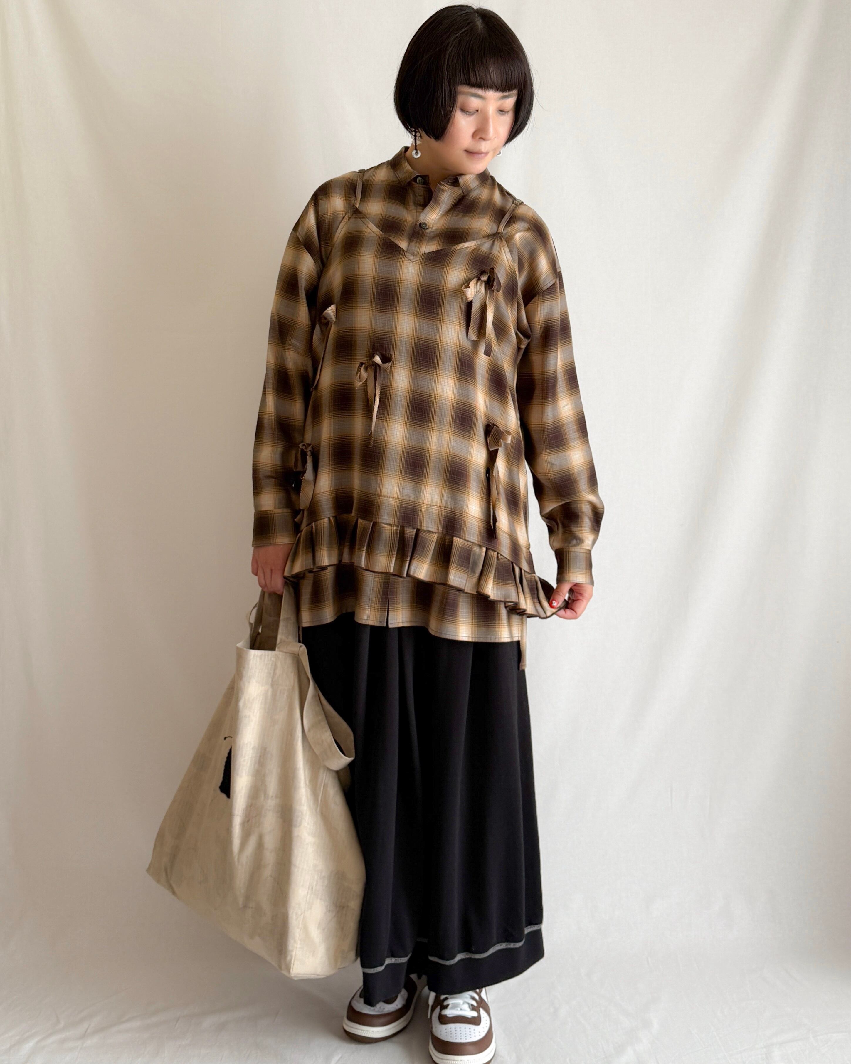 使った先染めのツイル素材。しなやかな落ち感とやわらかな風合い、自然な光沢感が特徴です。動くたびに生まれるドレープが、オンブレチェックの陰影と美しく調和します。オールシーズン着られる素材感も魅力です。