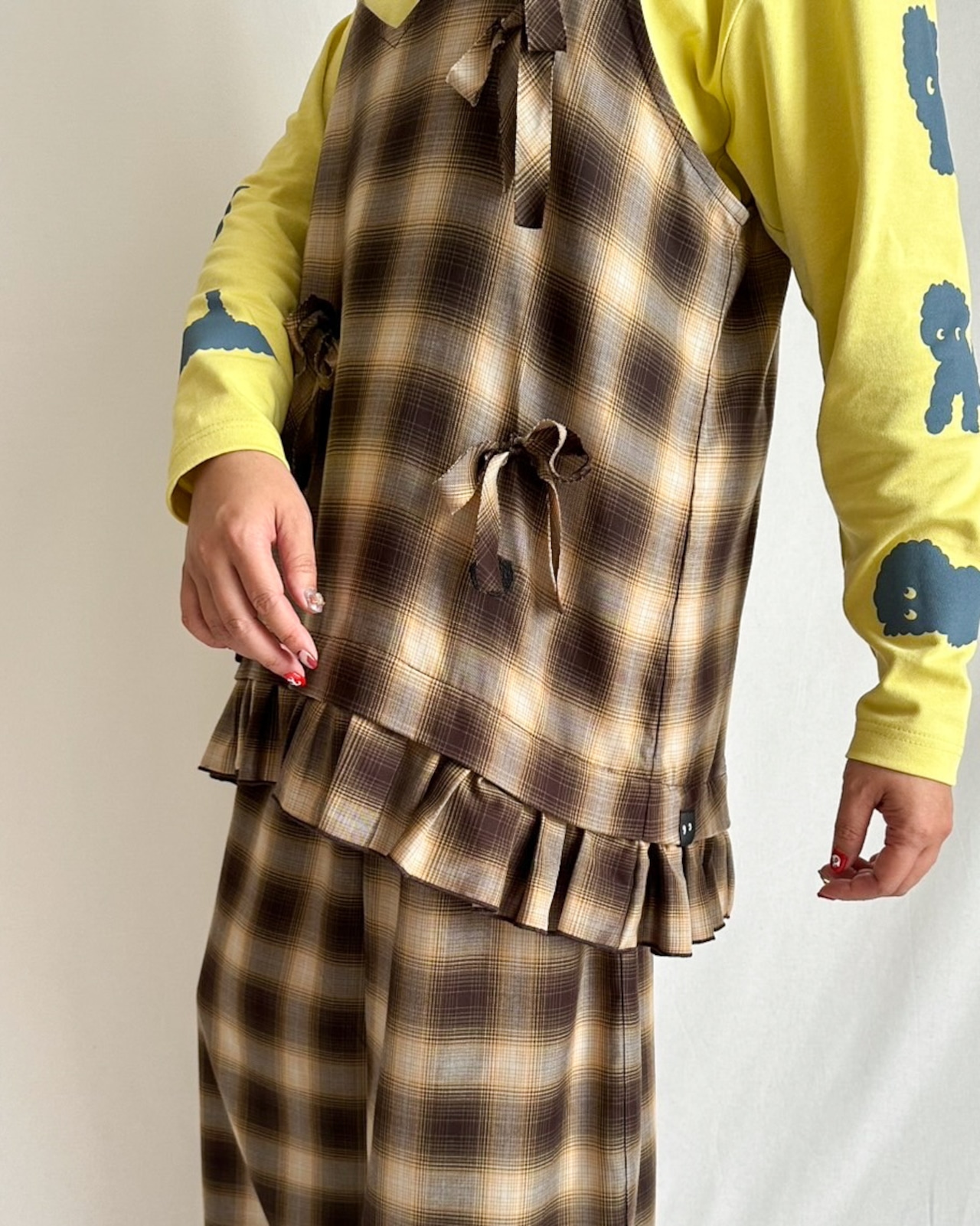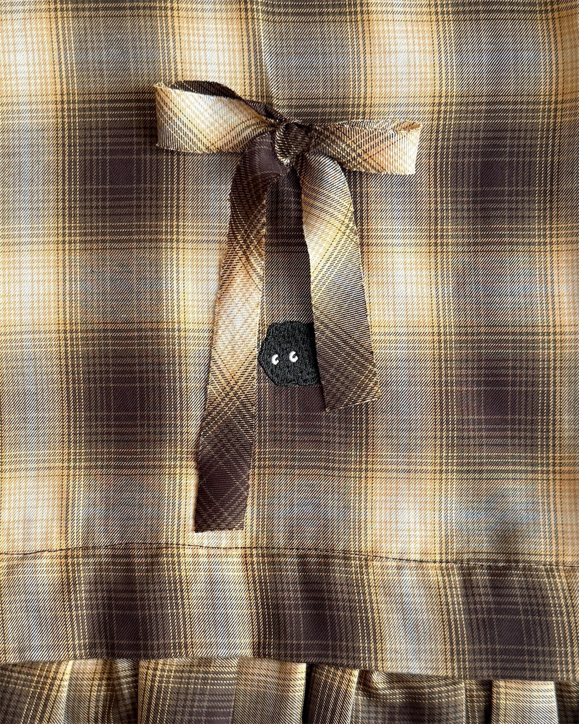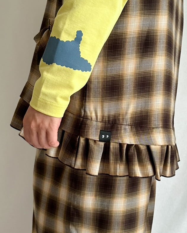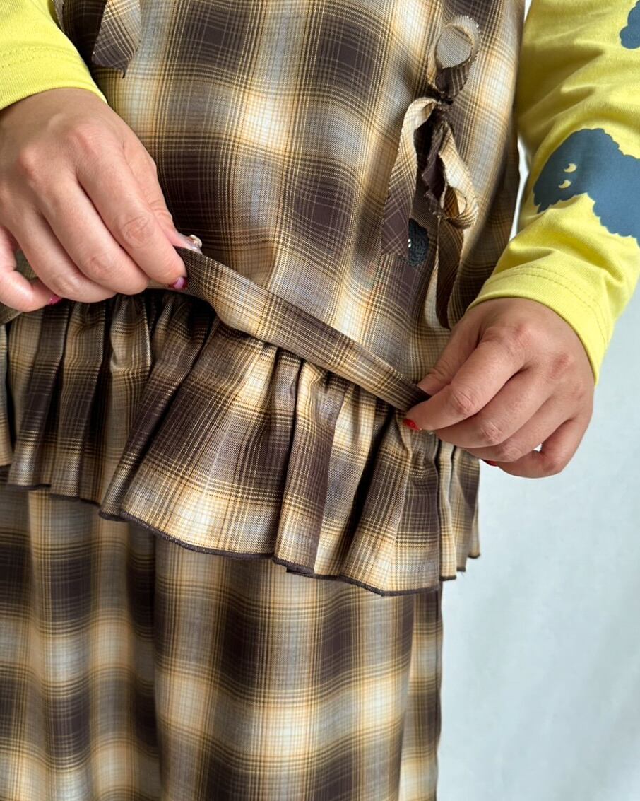前身頃にたたきつけた、共布のバイアステープ5本がデザインのポイント。リボンに結んでも、そのまま垂らしてもOK。チェック柄が斜めに加わることで、さりげない立体感と動きが生まれます。