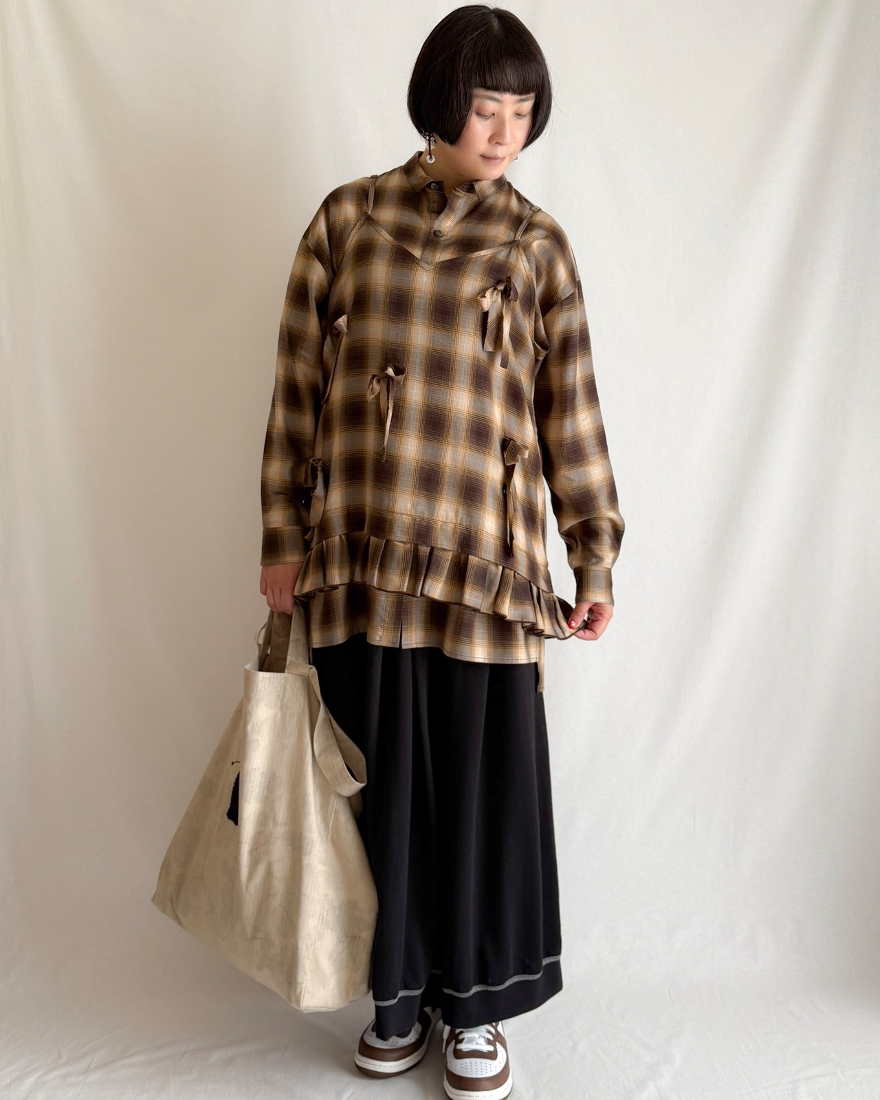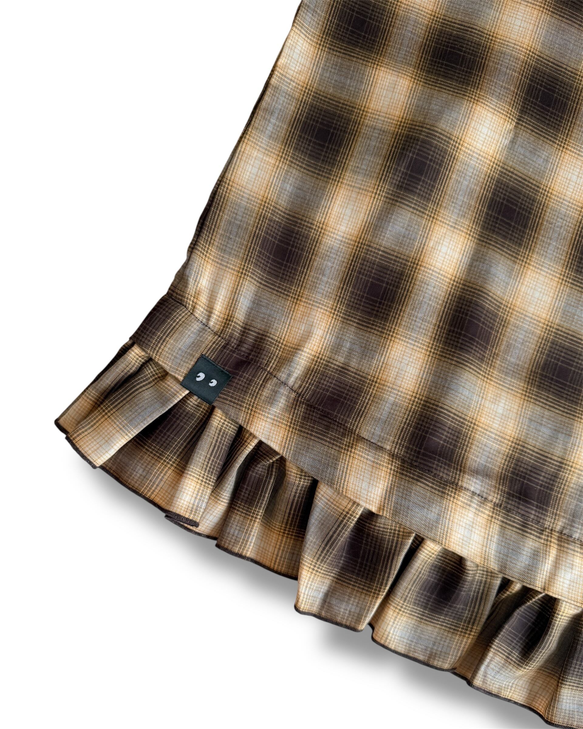 ブラウンをベースに、グレーのグラデーションとイエローのアクセントが効いたオンブレチェック。にじむような濃淡が生地に奥行きを生み、ラフすぎず、どこか落ち着いたムードをまとった、ニュアンスのある配色です。