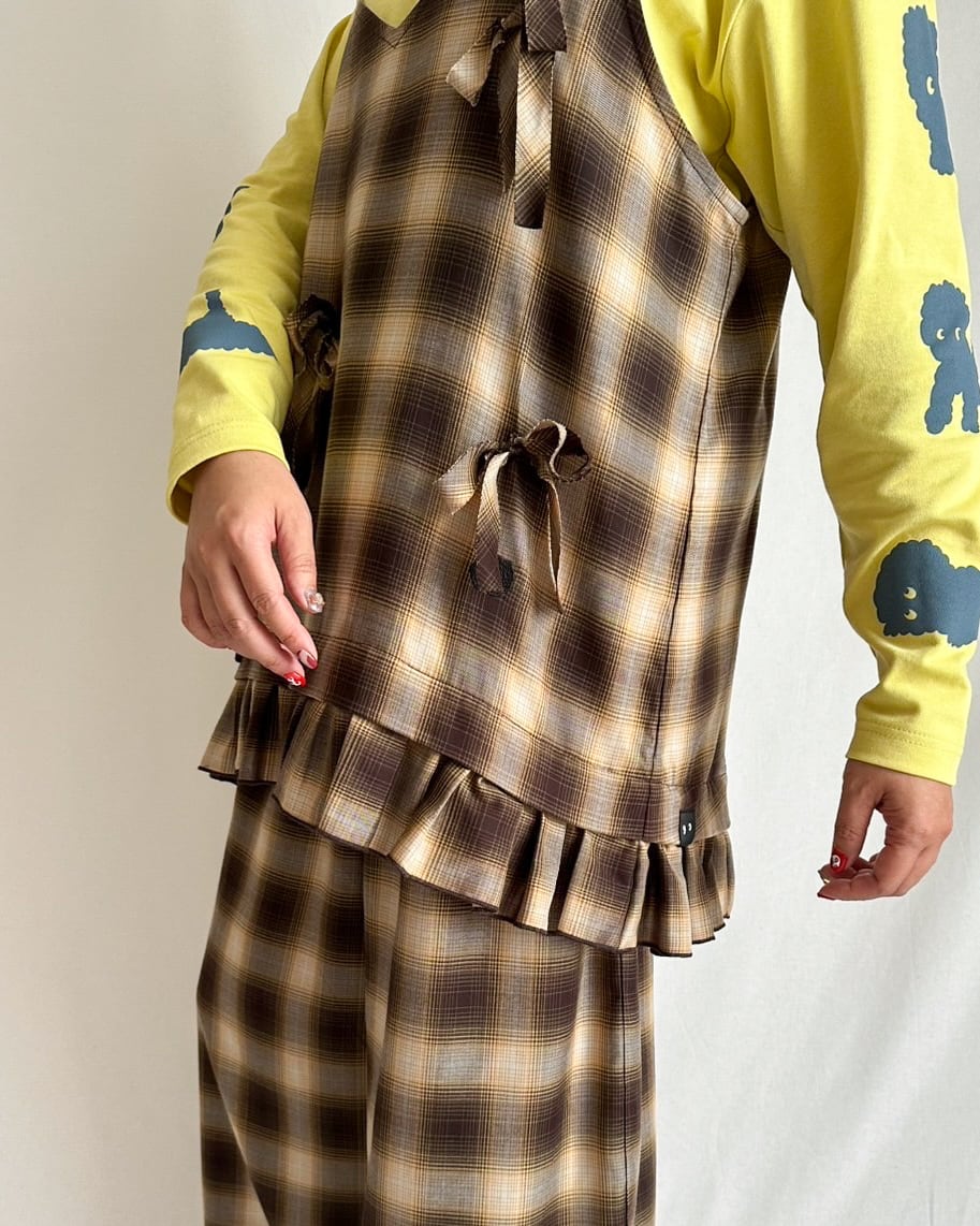 肩のストラップは調整できるアジャスターつき。華奢なストラップと裾のギャザーフリルが、オンブレチェックのラフな表情に抜け感をプラスしています。前後ともにVネックのデザインで、レイヤードしやすいバランスに仕上げ、季節を問わず活躍してくれます。