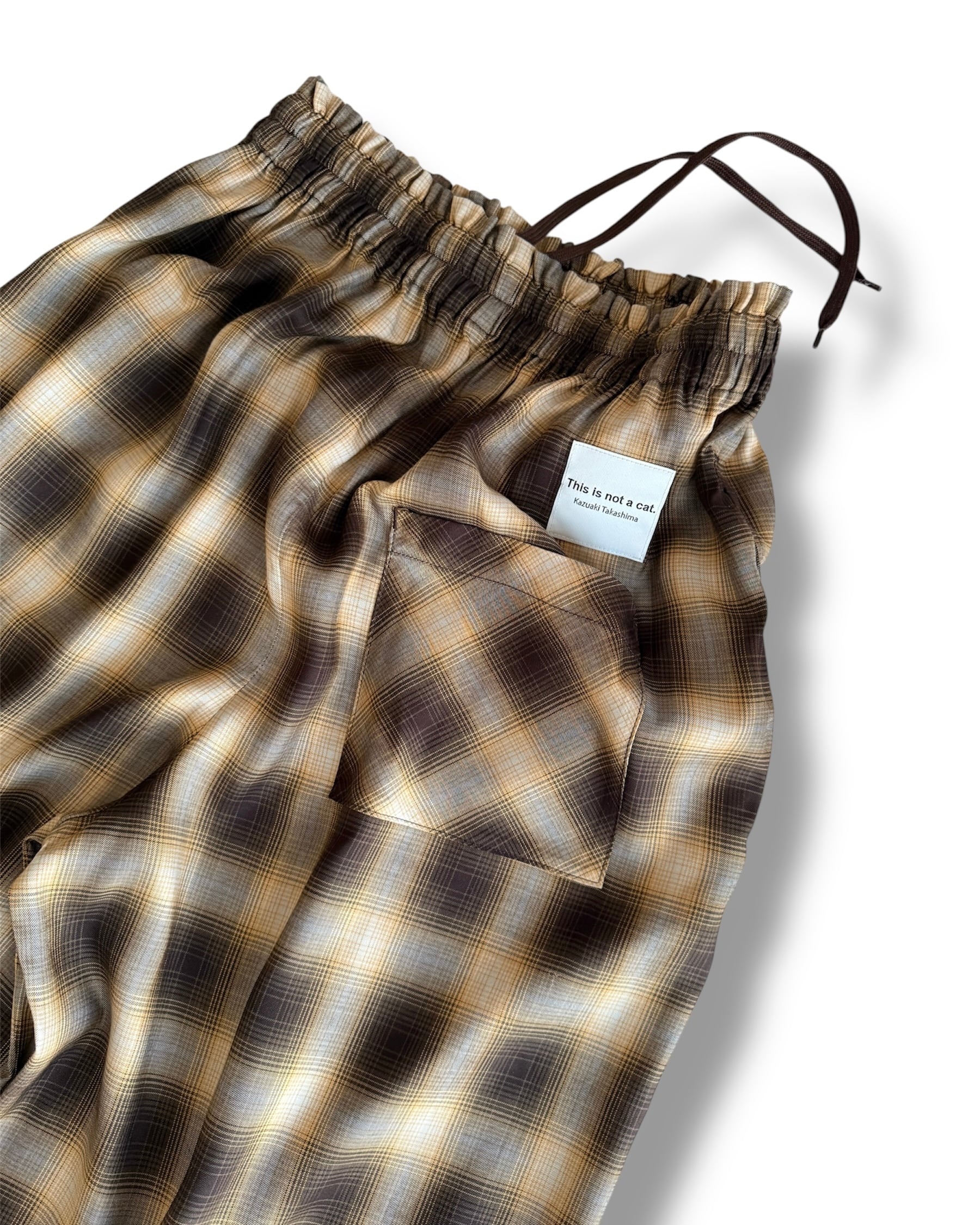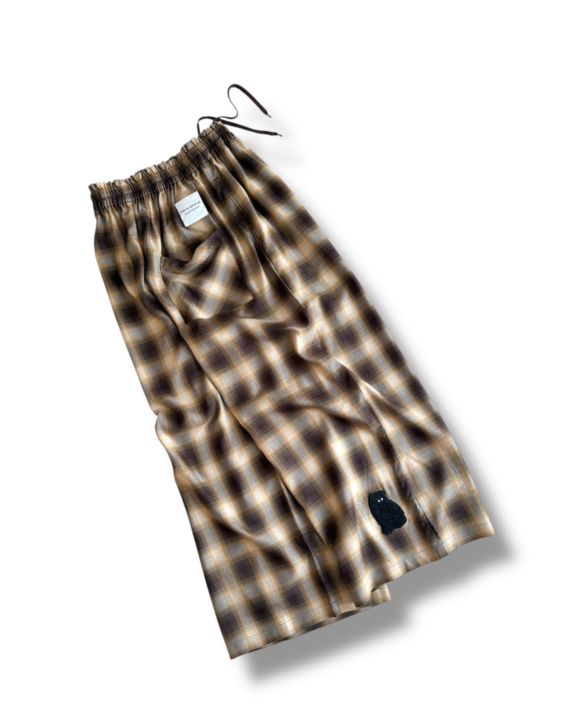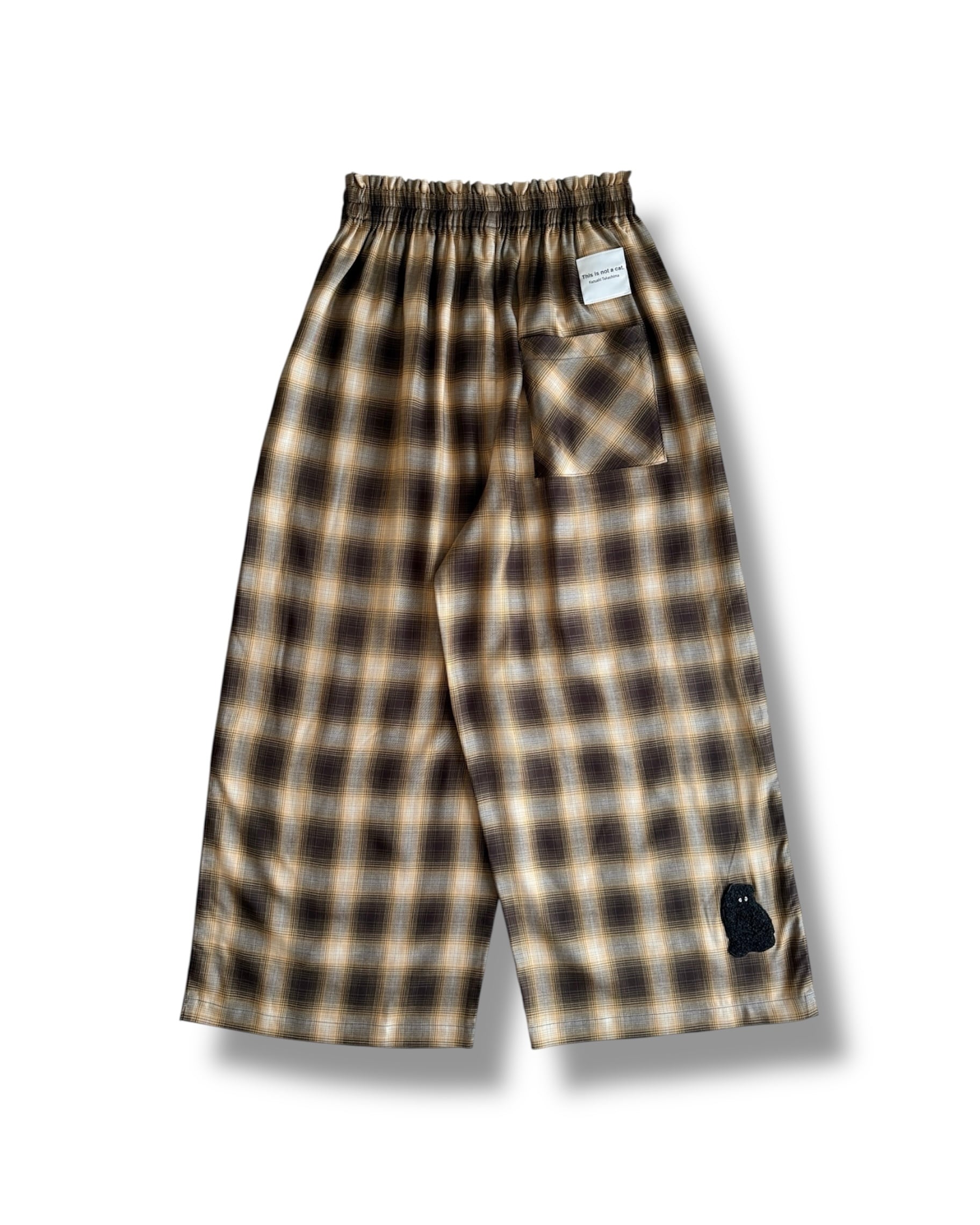 まるでシルクのようなテンセル素材で仕立てた、秋色オンブレチェックのワイドパンツ。ウエストにたっぷりギャザーが入ったリラックス感と、歩くたびに揺れるドレープが魅力です。全体的にシンプルなつくりながら、後ろポケットのバイアス使いや、右後裾の「モジャ」の刺繍など、さりげない遊び心もポイントに。