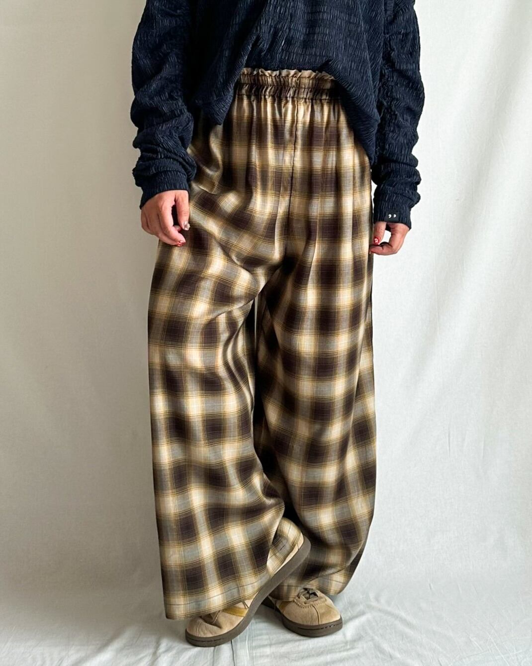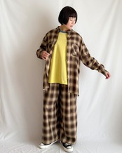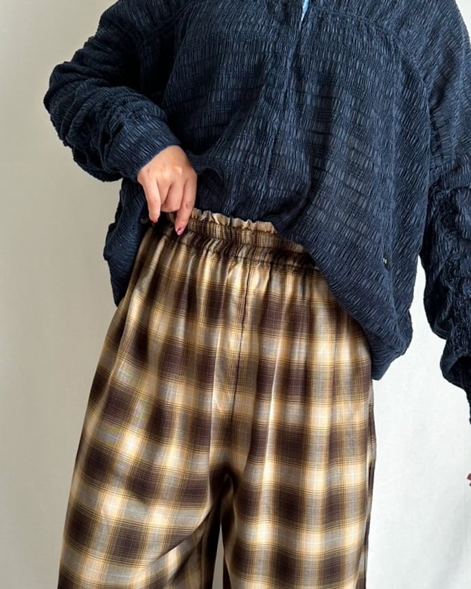 丈は長めのフルレングス。ワイドシルエットとテンセルのなめらかな風合いが生むドレープが、歩くたびにチェック柄の表情をゆらゆらと変え、着る人の雰囲気をぐっと引き立てます。
