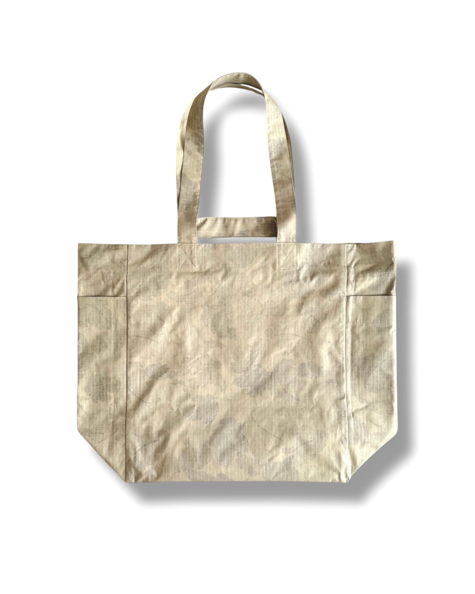 表地には、リーフカモプリントのコットンリップストップの”裏面”をあえて使用。格子状の織り模様がほんのり浮かびあがり、ハリ感がありつつもナチュラルな表情が魅力です。裏地には、ボーダーのコットン天竺素材を使用。リバーシブルで使えて、コーディネートや気分に合わせて楽しめる仕様です。どちらも服地に使われる素材を採用することで、コーディネートに自然と馴染むカジュアルなバッグに仕上がっています。