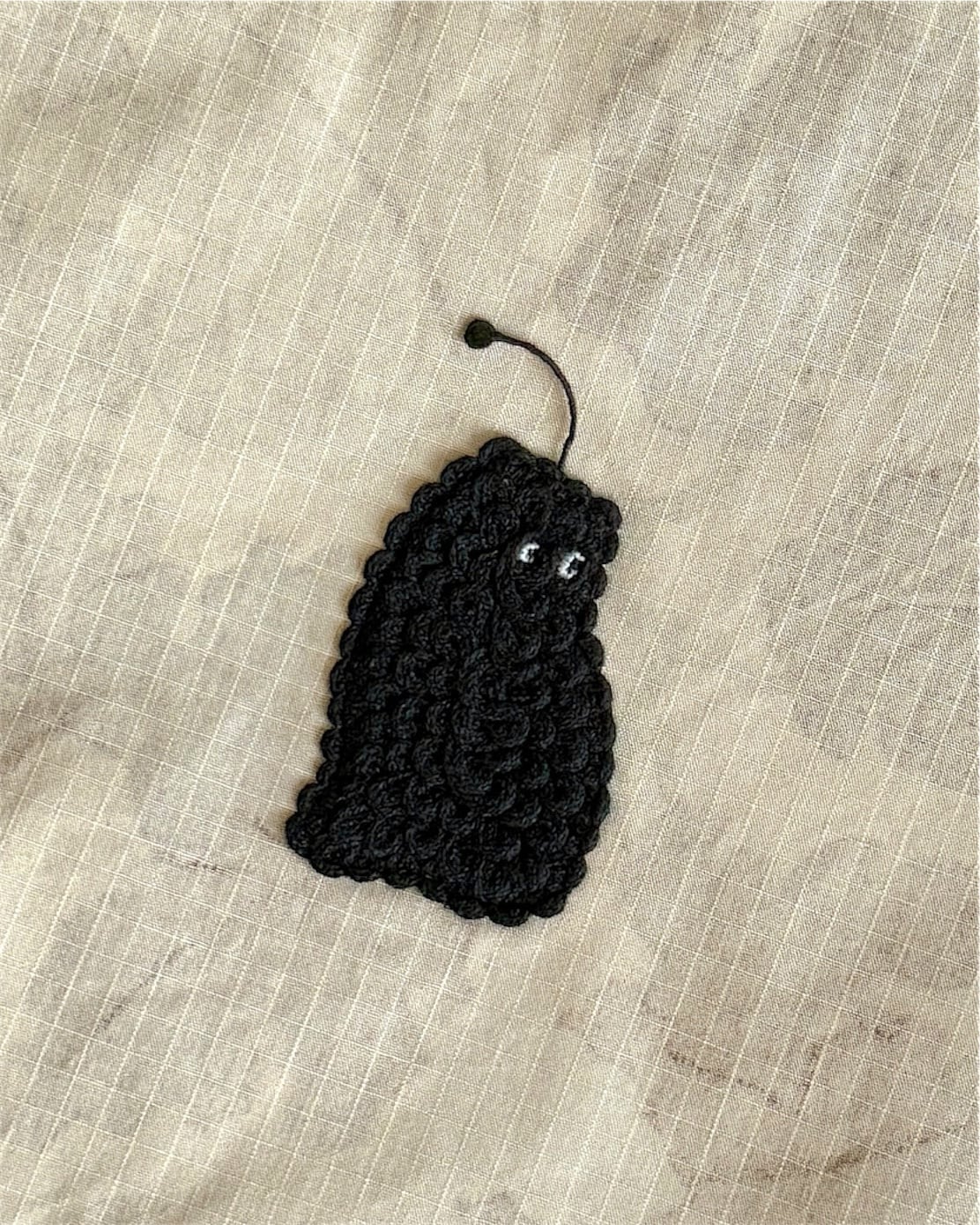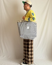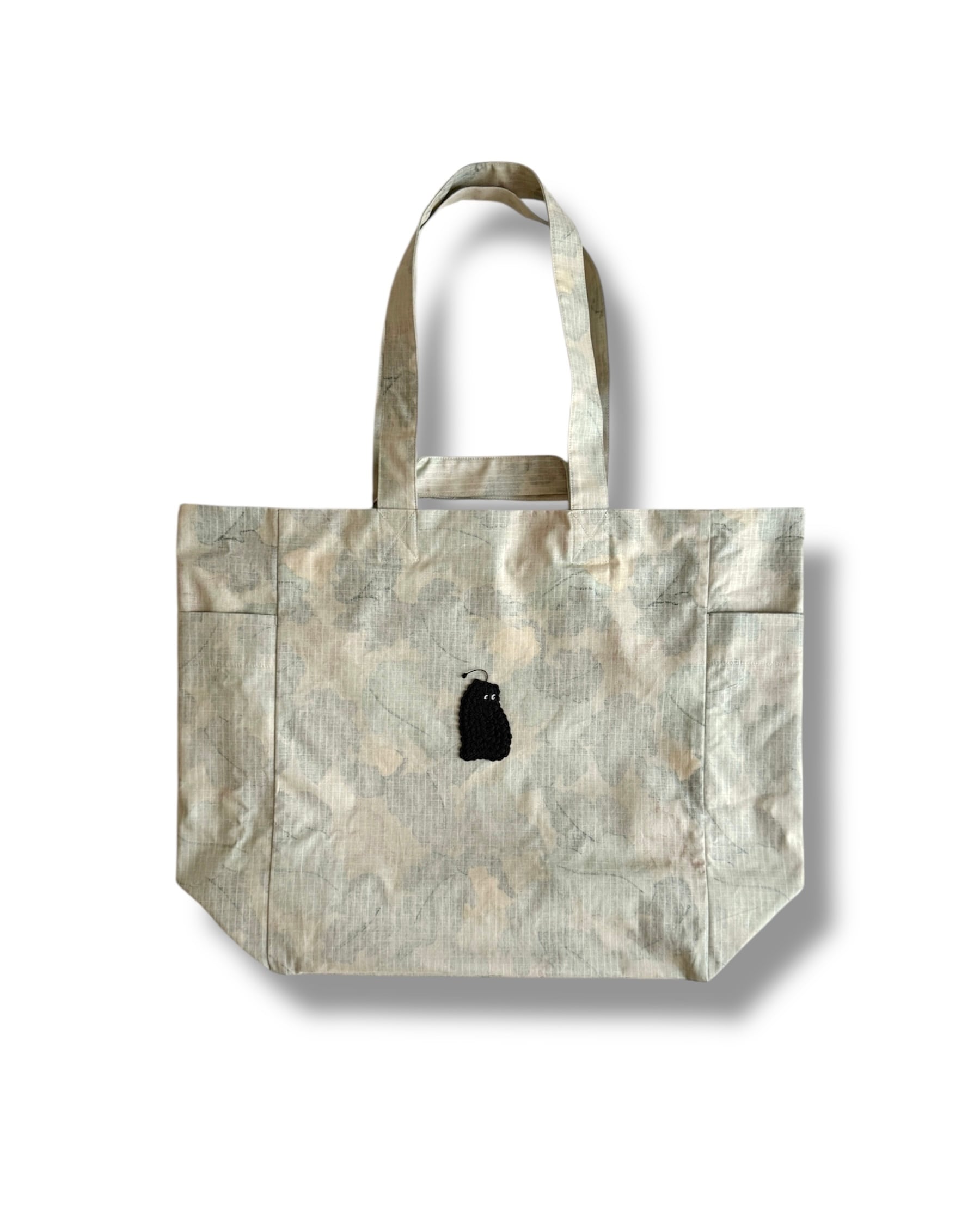 リーフカモ柄とボーダー柄を組み合わせた、リバーシブル仕様のトートバッグ。荷物の出し入れのたびにちらりと見えるボーダーの裏地が、さりげない遊び心を感じさせます。前面にたたきつけたブラックの「モジャ」のレース刺繍モチーフが、全体のバランスを引き締めるワンポイントに。