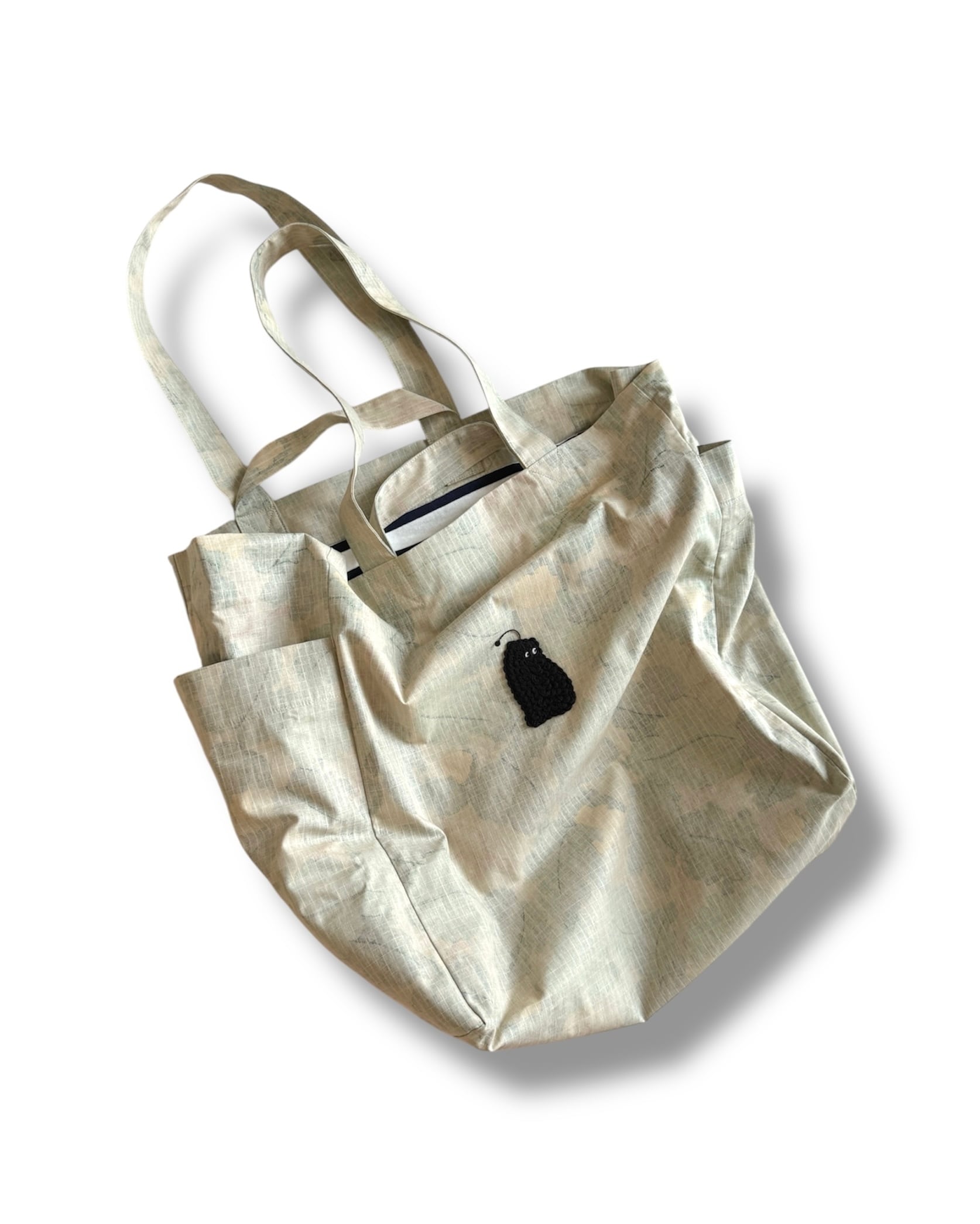 荷物が多い日にも、ちょっとした旅行のお供にもぴったり。肩掛け・手持ちの2way仕様で、使い勝手のいいリバーシブルトートです。表はやわらかなリーフカモ、裏地は気分が上がるボーダー柄。前面についたブラックの「モジャ」のレース刺繍モチーフが、全体のバランスを引き締めるワンポイントになっています。