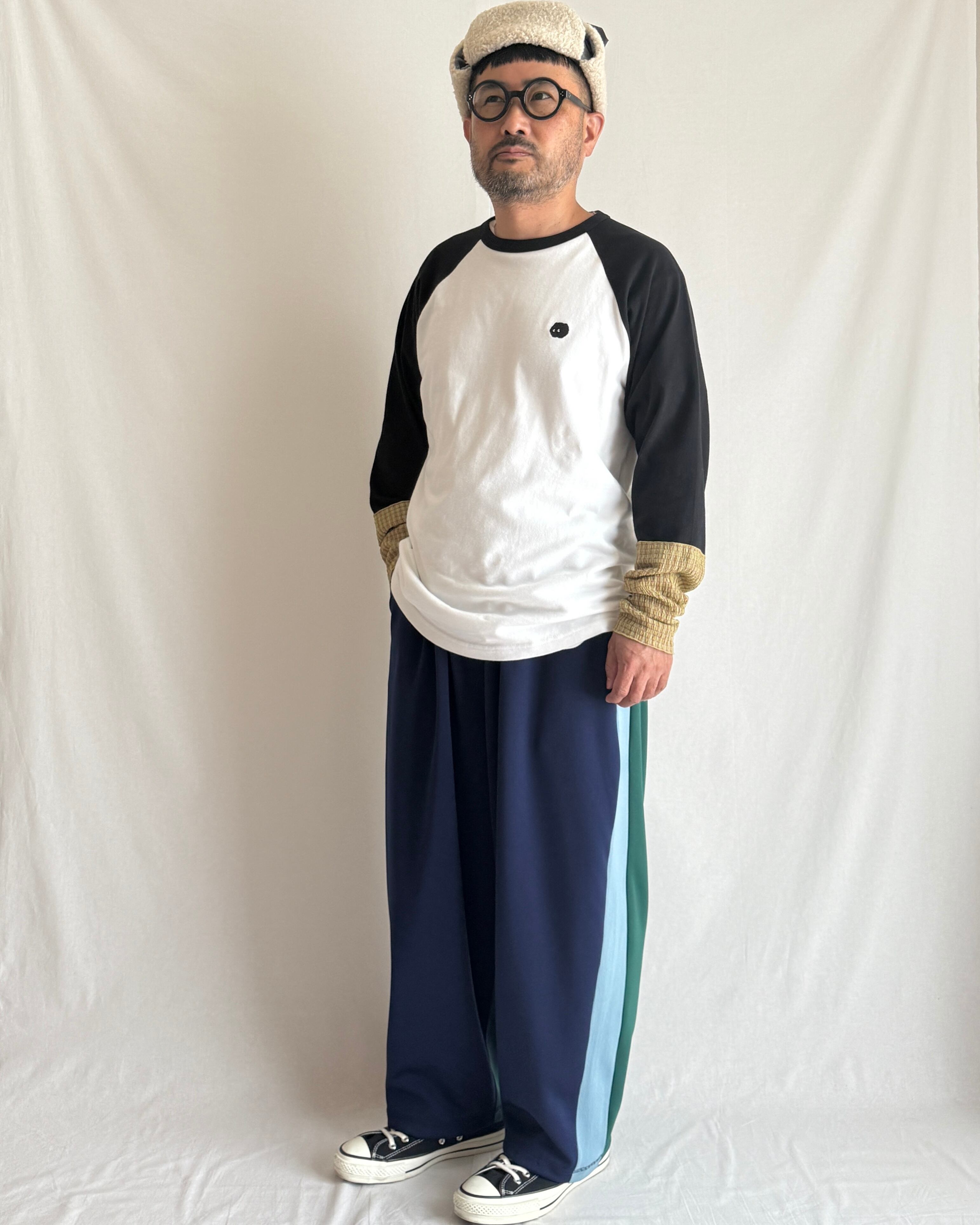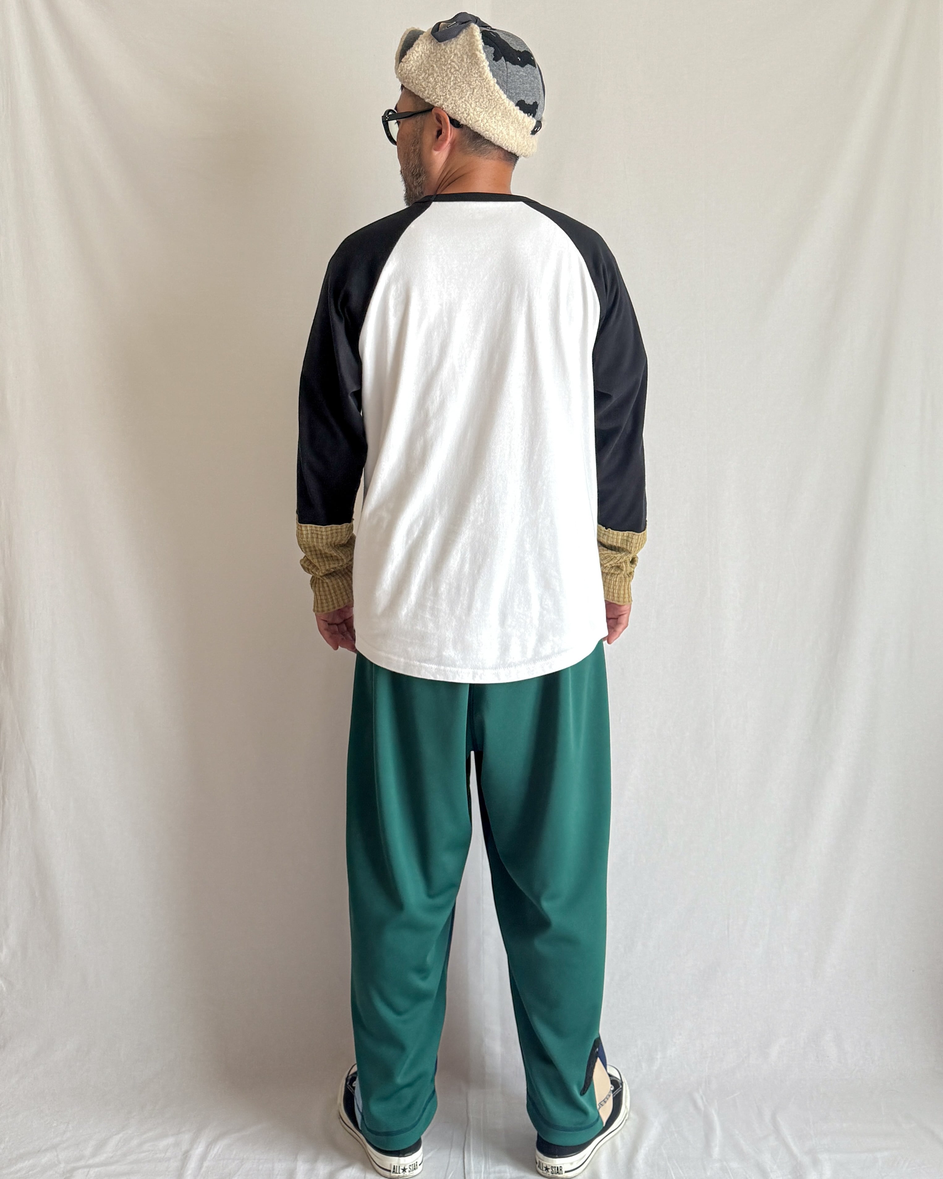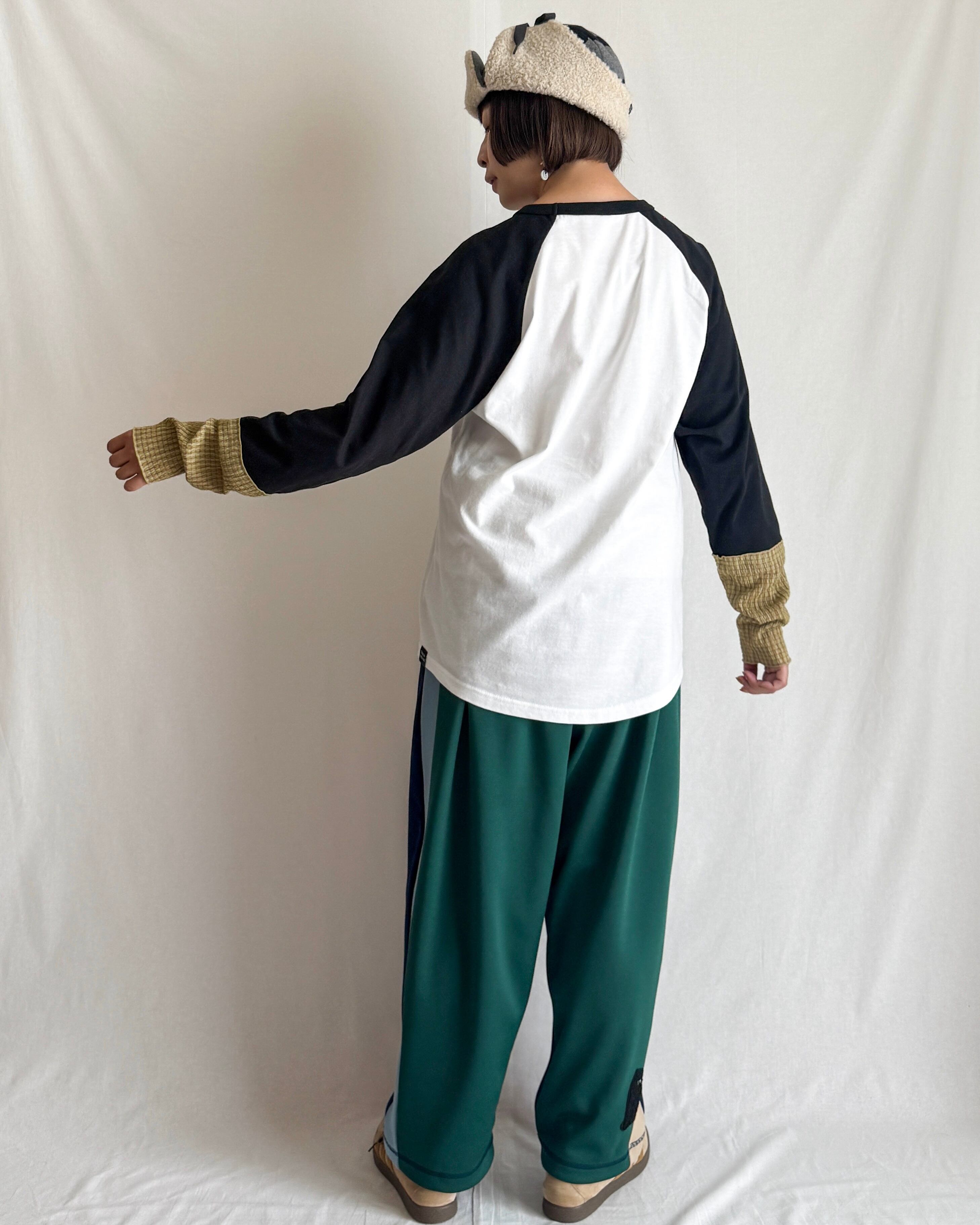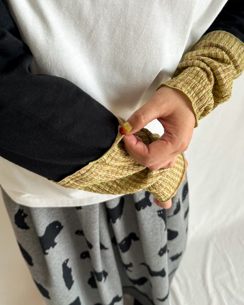 ラグランTシャツの袖口にくしゅっとした異素材をドッキング。ホワイト×ブラックのベーシックな配色に、アップルグリーン×ブラウンレッドのチェック柄がアクセントになった、レイヤード風のデザインTです。