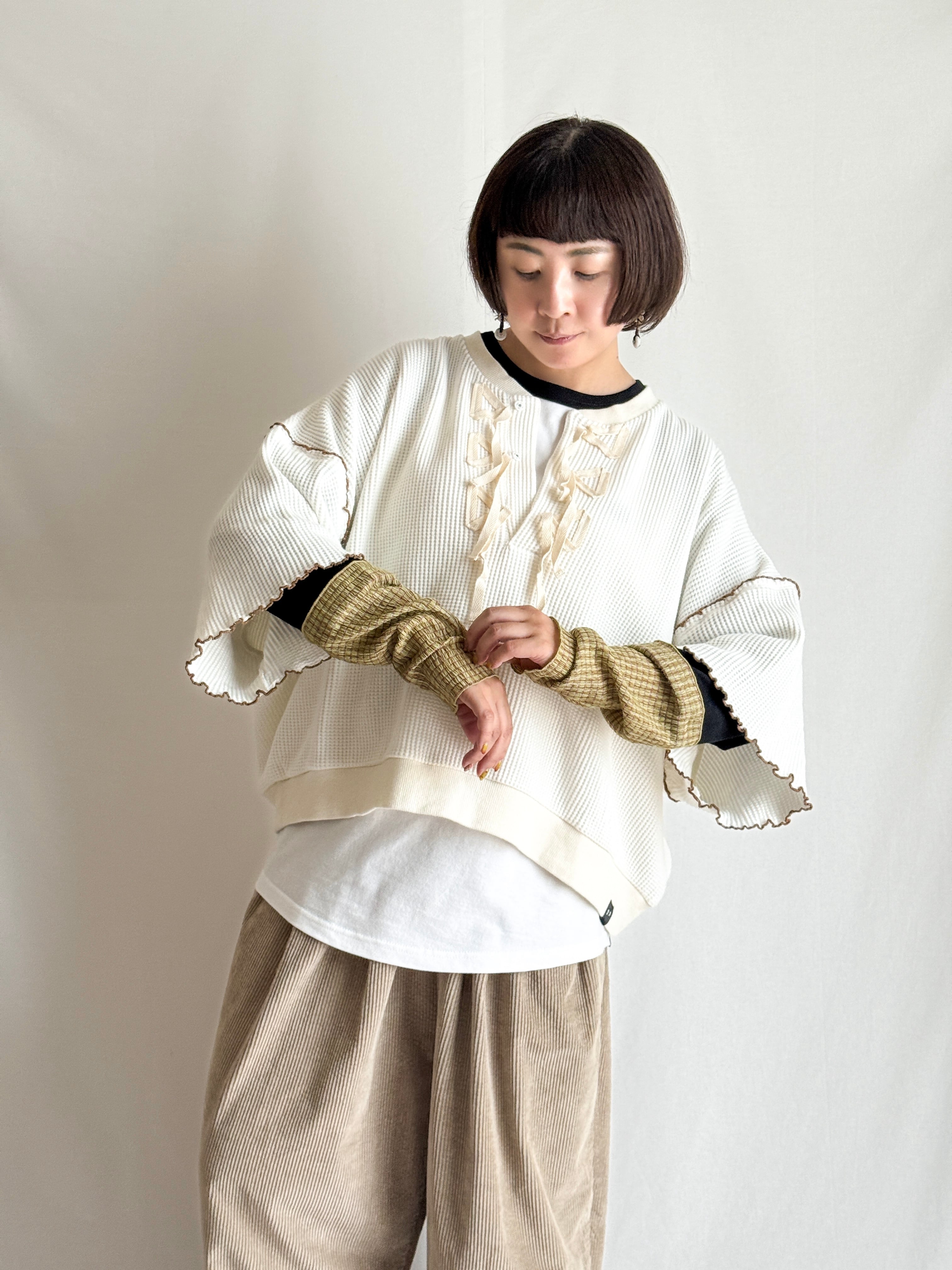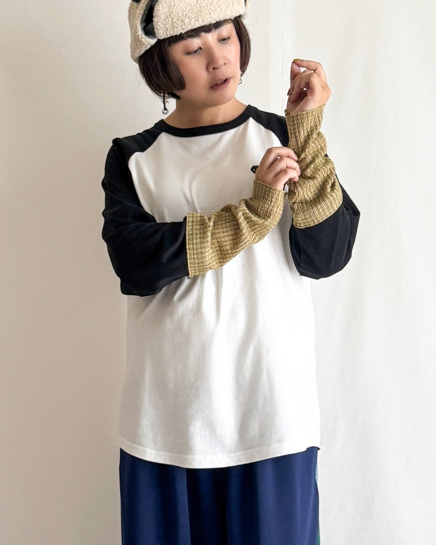 「アームカバーをつけてるみたい!袖口をくしゅくしゅさせて、レイヤードを遊ぶレトロミックスなラグランT。」
