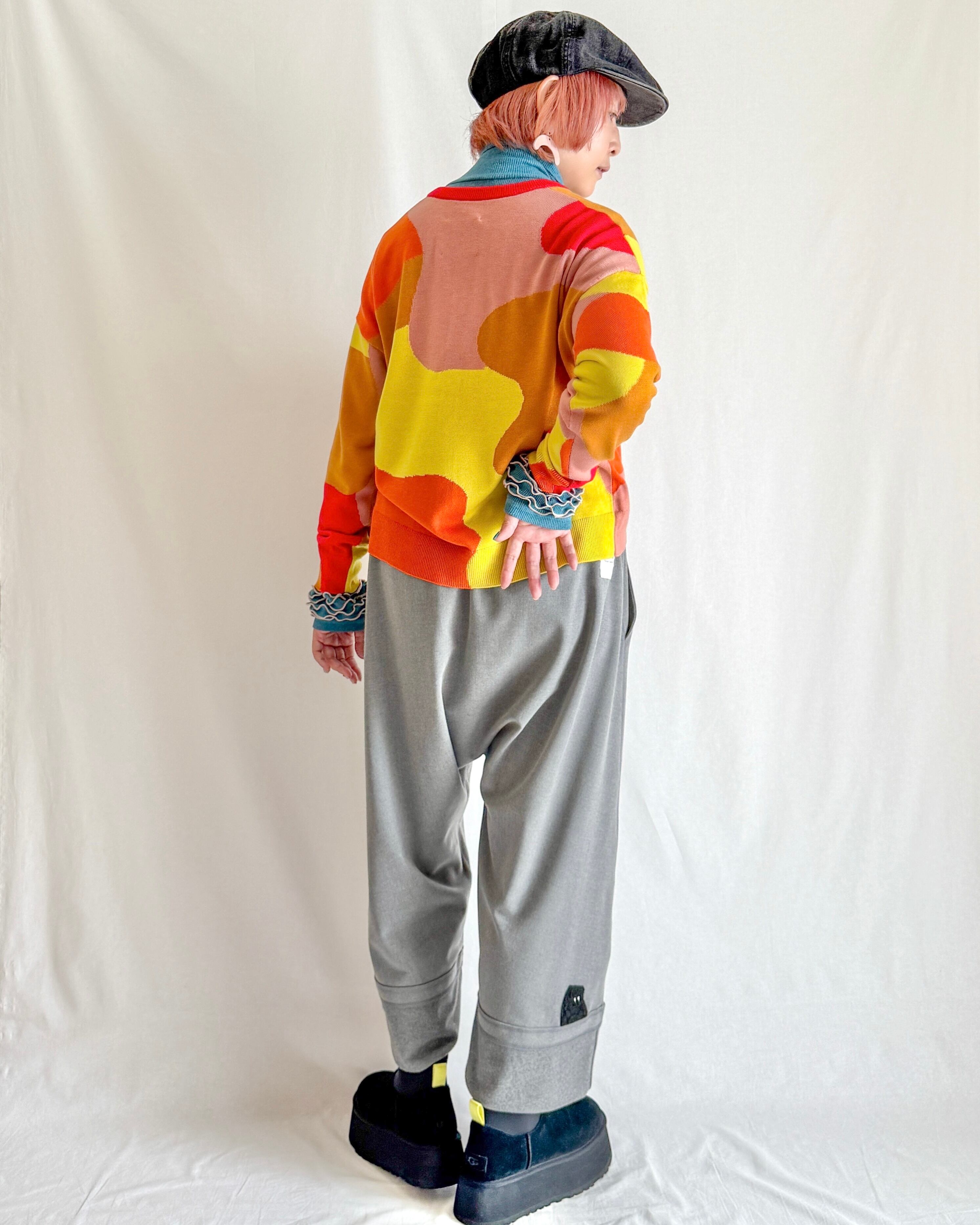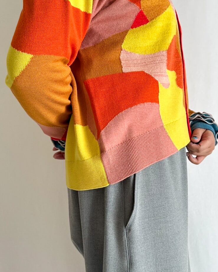レトロなムードをまとう「モジャ」が、左右にちょこんと佇むニットカーディガン。その曖昧なフォルムに溶けこむよう、色と形をピースのように組み合わせた多色のインターシャ編みで表現。どこか遊び心を感じられるポップなウォームカラーの配色で仕上げました。