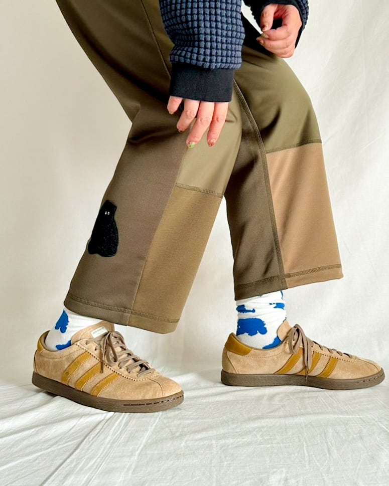 ・カラーは、足元にちょっと遊び心がほしいときにぴったりな〈オフホワイト×ブルー〉。スニーカーにもローファーにもよく映えるカラーリングです。