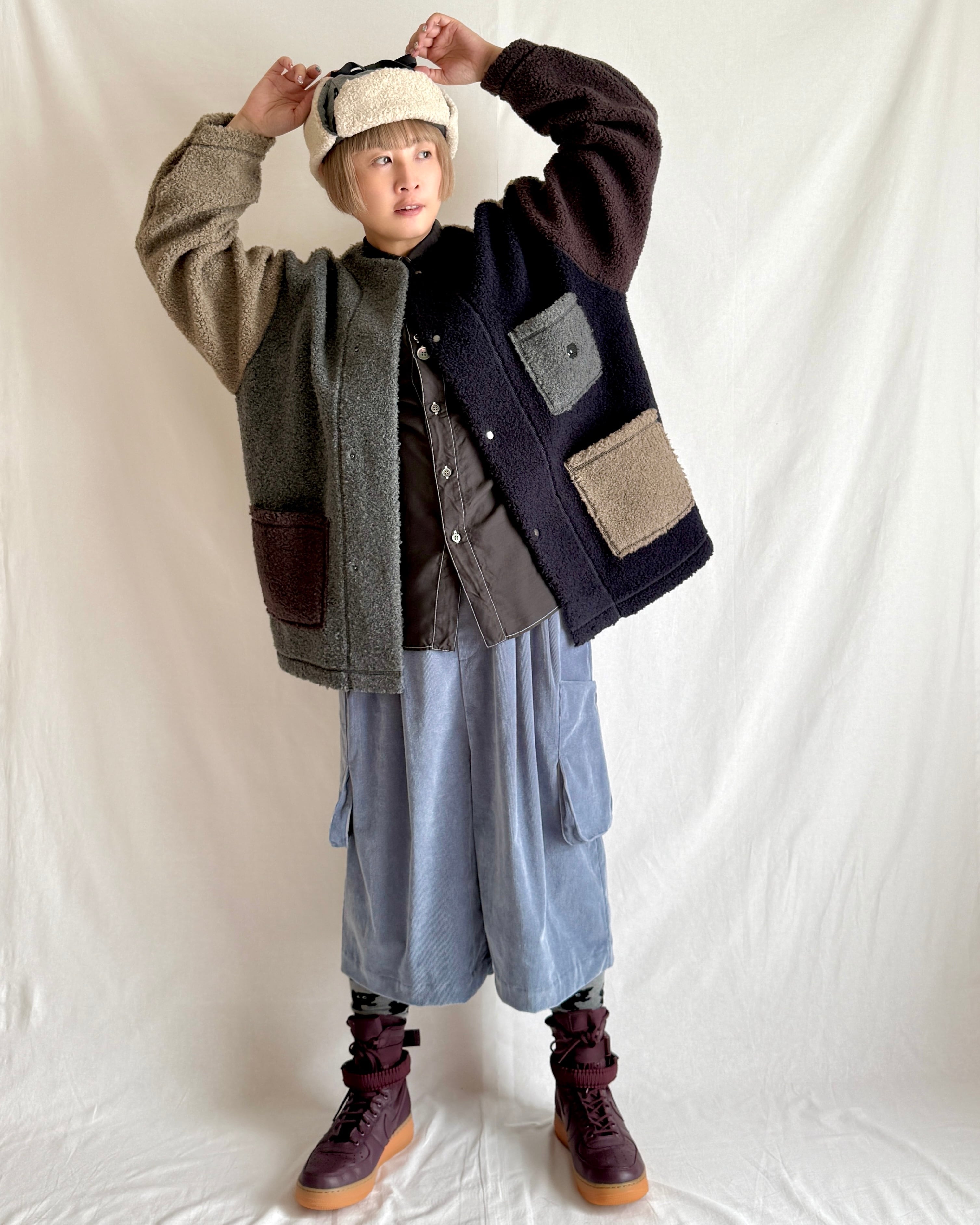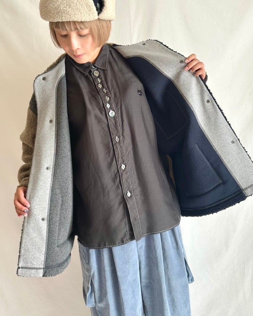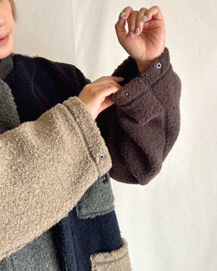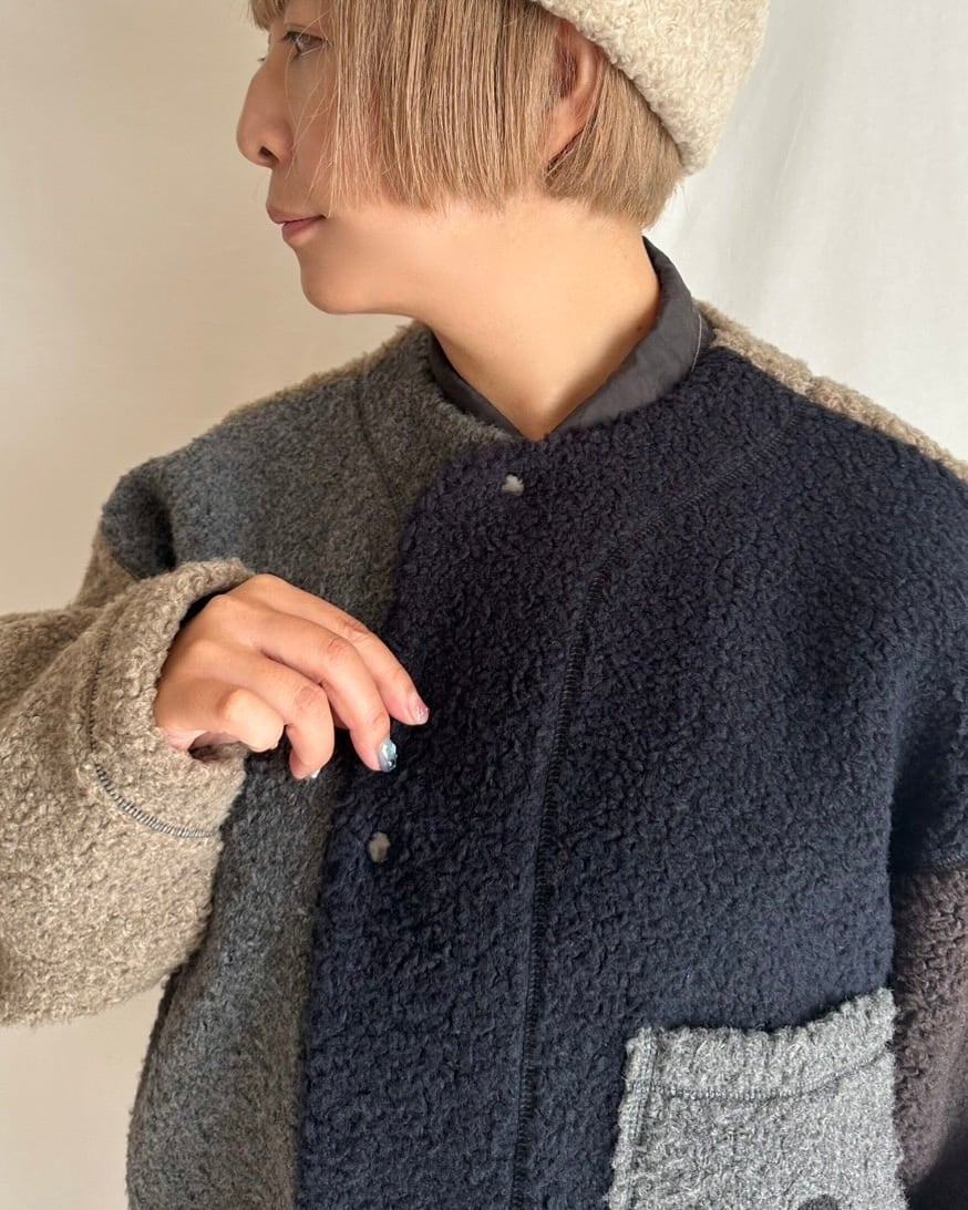 まるで動物の毛並みのように表情豊かなウール混のボア素材。見た目に反して軽い着心地と、やわらかい肌触りが特徴です。