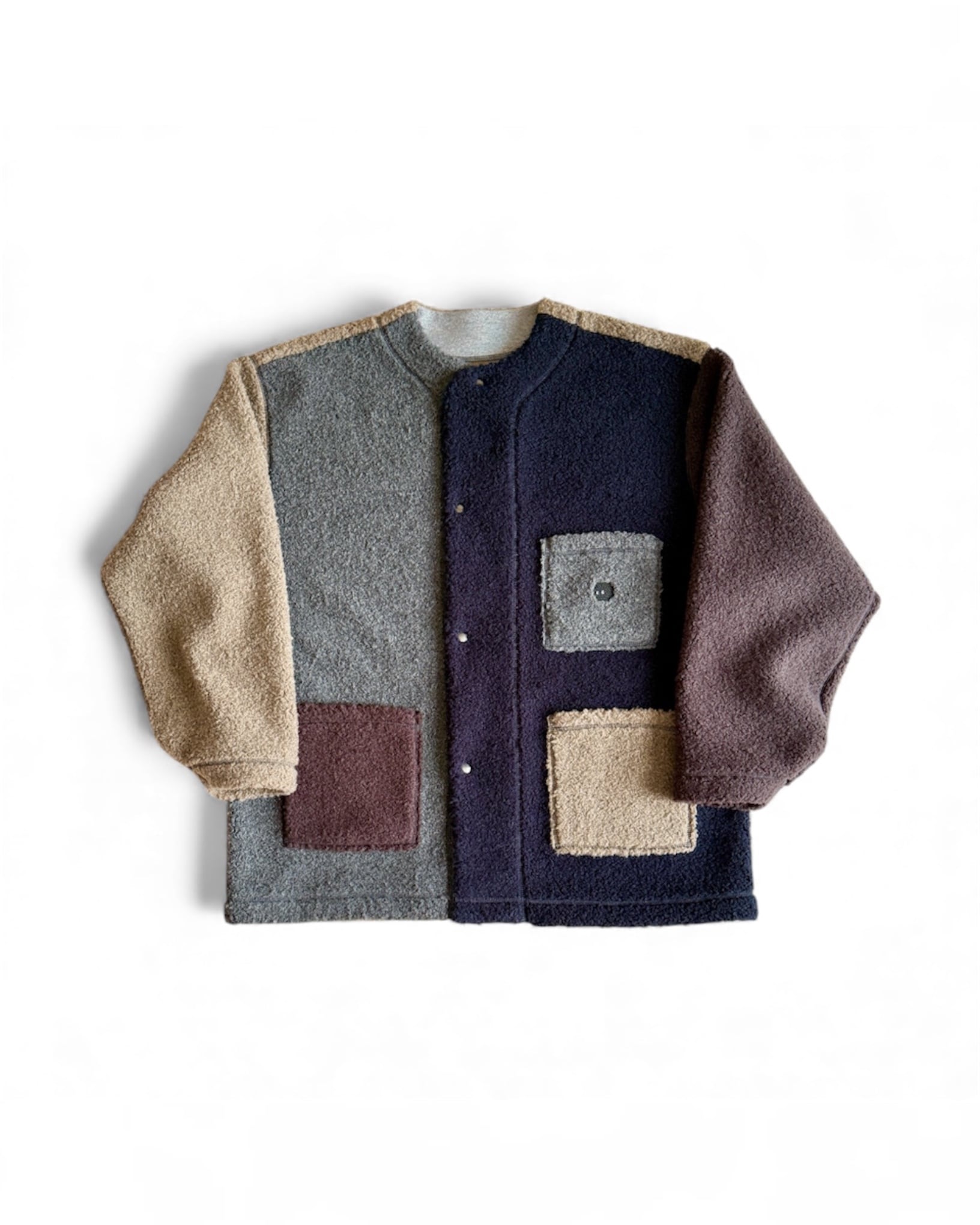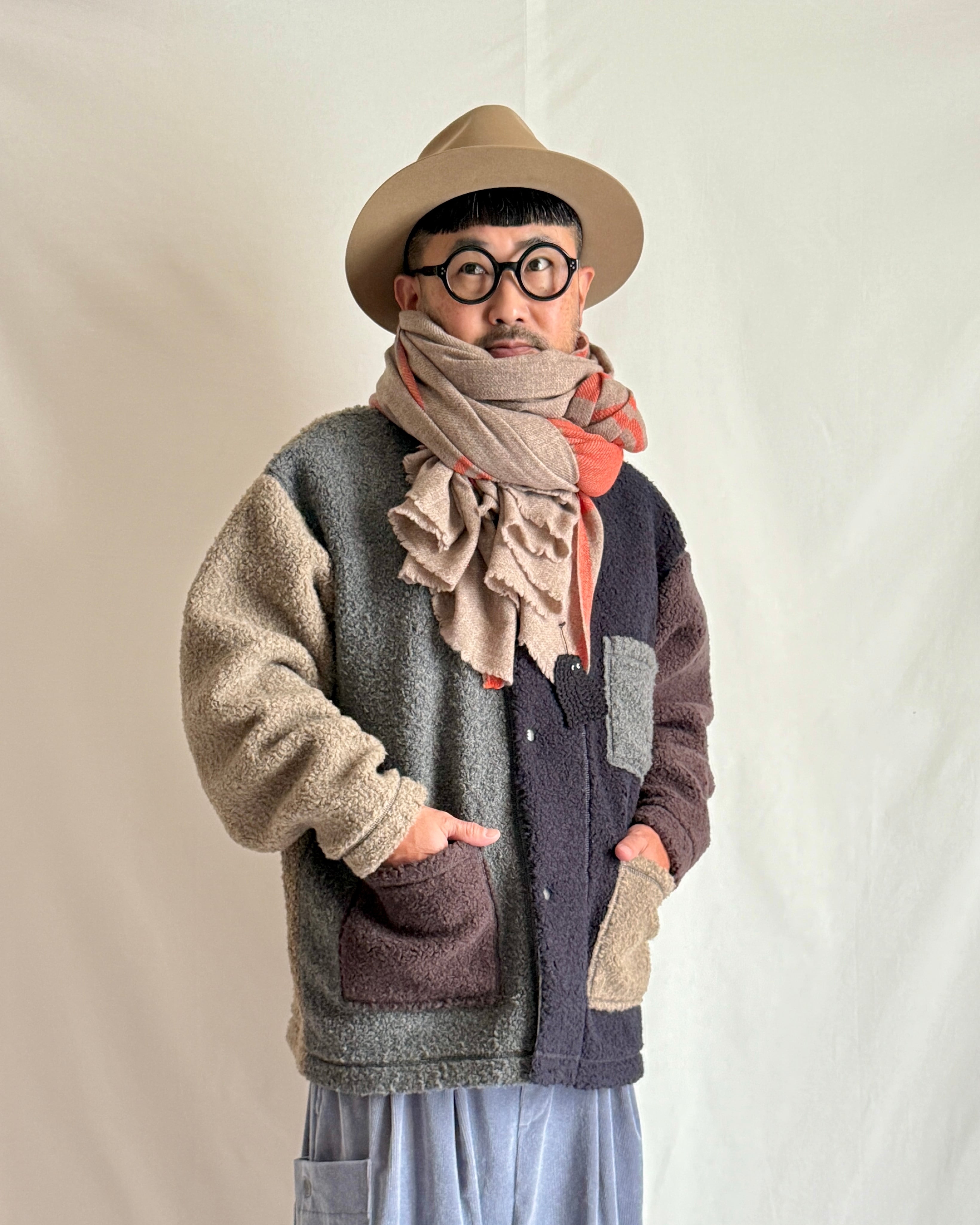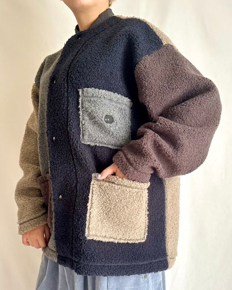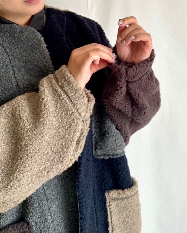 ・グレー、ネイビー、ベージュ、ブラウンの4色のボアを、パーツでドッキングしたクレイジーパターン。ベーシックカラーでまとめたあたたかみのある配色です。