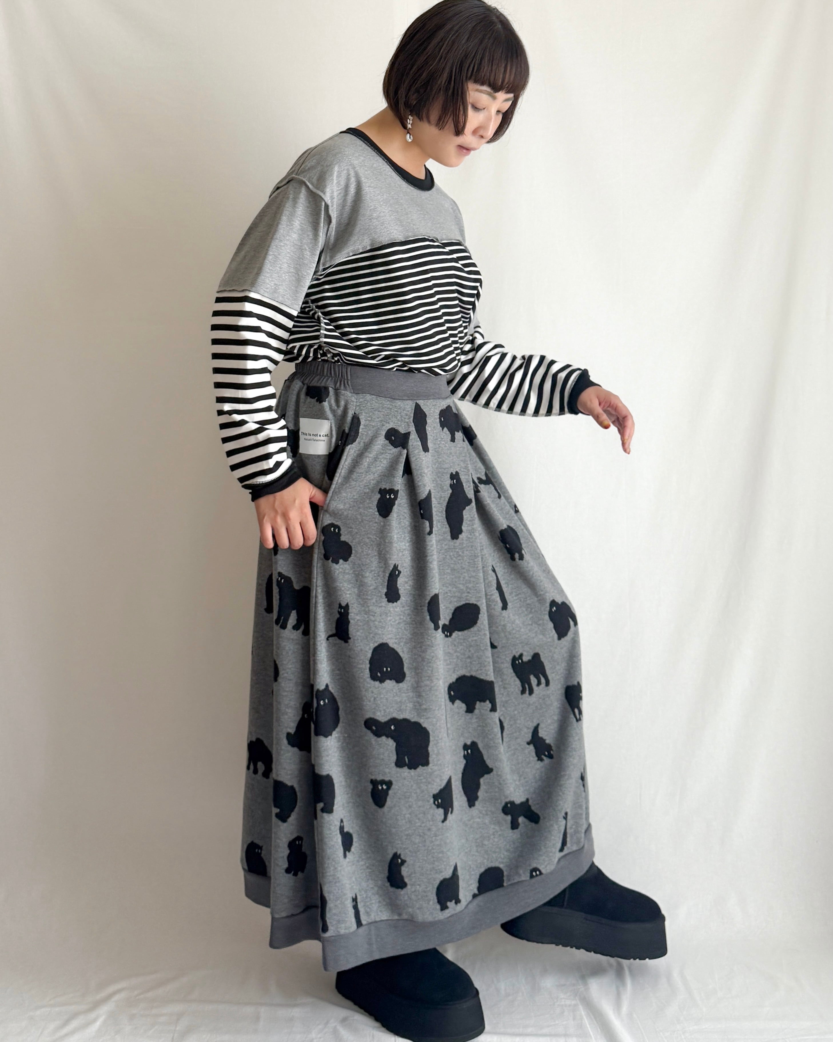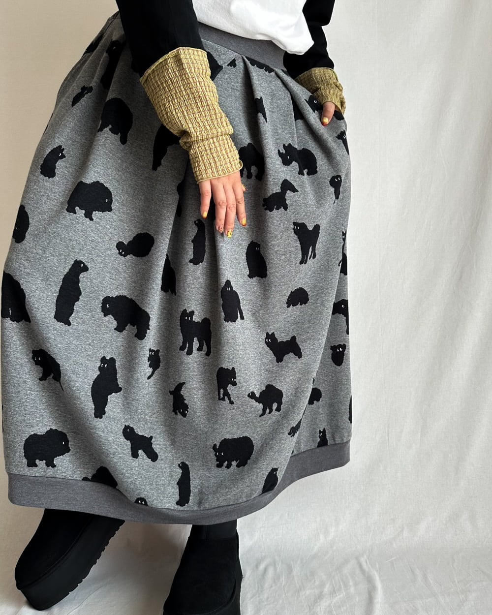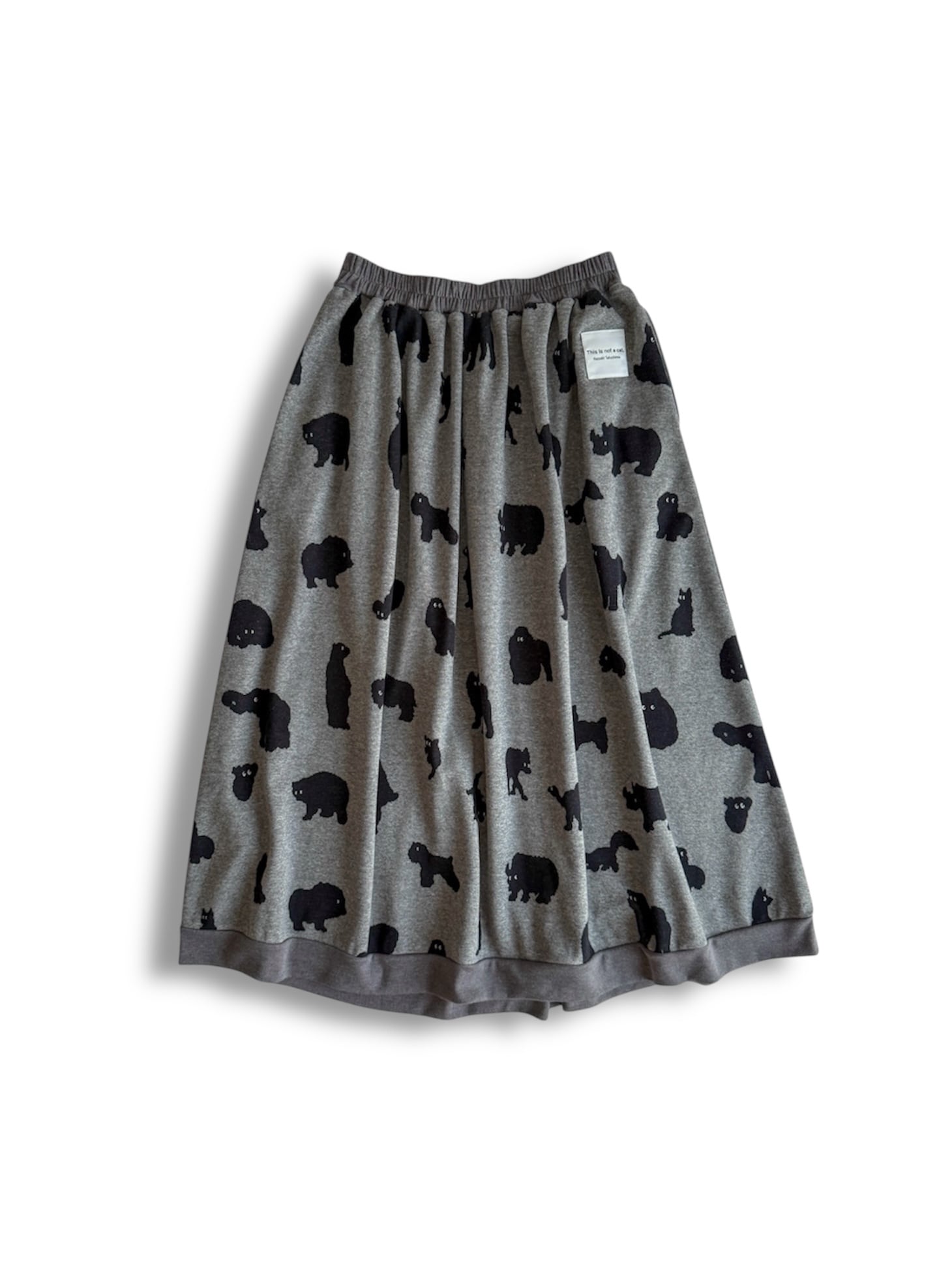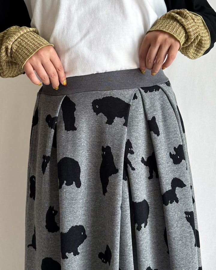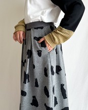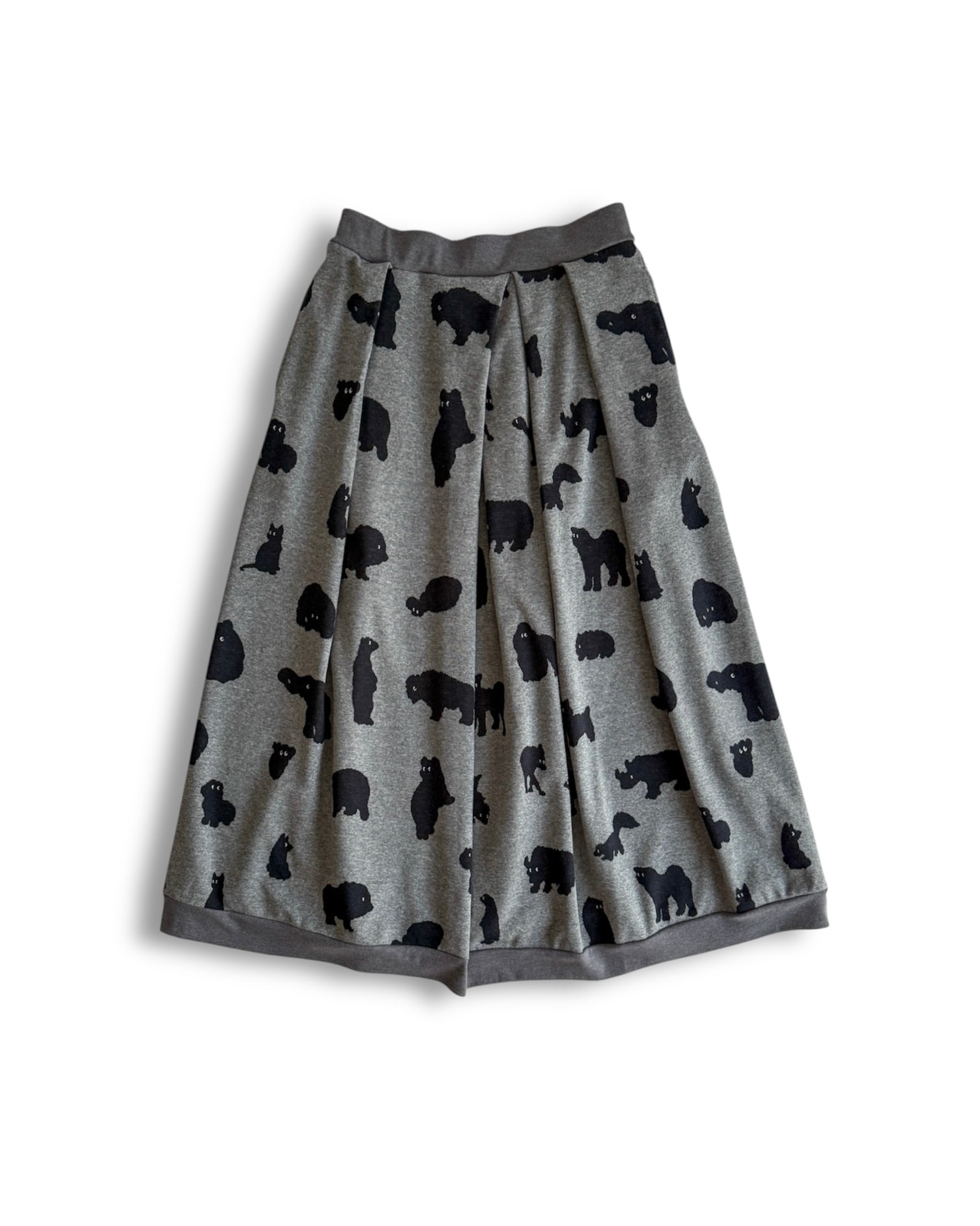 “This is not a cat.”をテーマに、たかしまがモノクロで描く動物たちのドローイングをダブルジャガードで表現したテキスタイルシリーズ。たっぷりと生地を使ったスカートは、前ウエストのランダムなタックと裾リブがつくる自然なバルーンシルエットが特徴。見る人の想像力をかきたてるアートを、日常着として贅沢に楽しめる特別なスカートです。