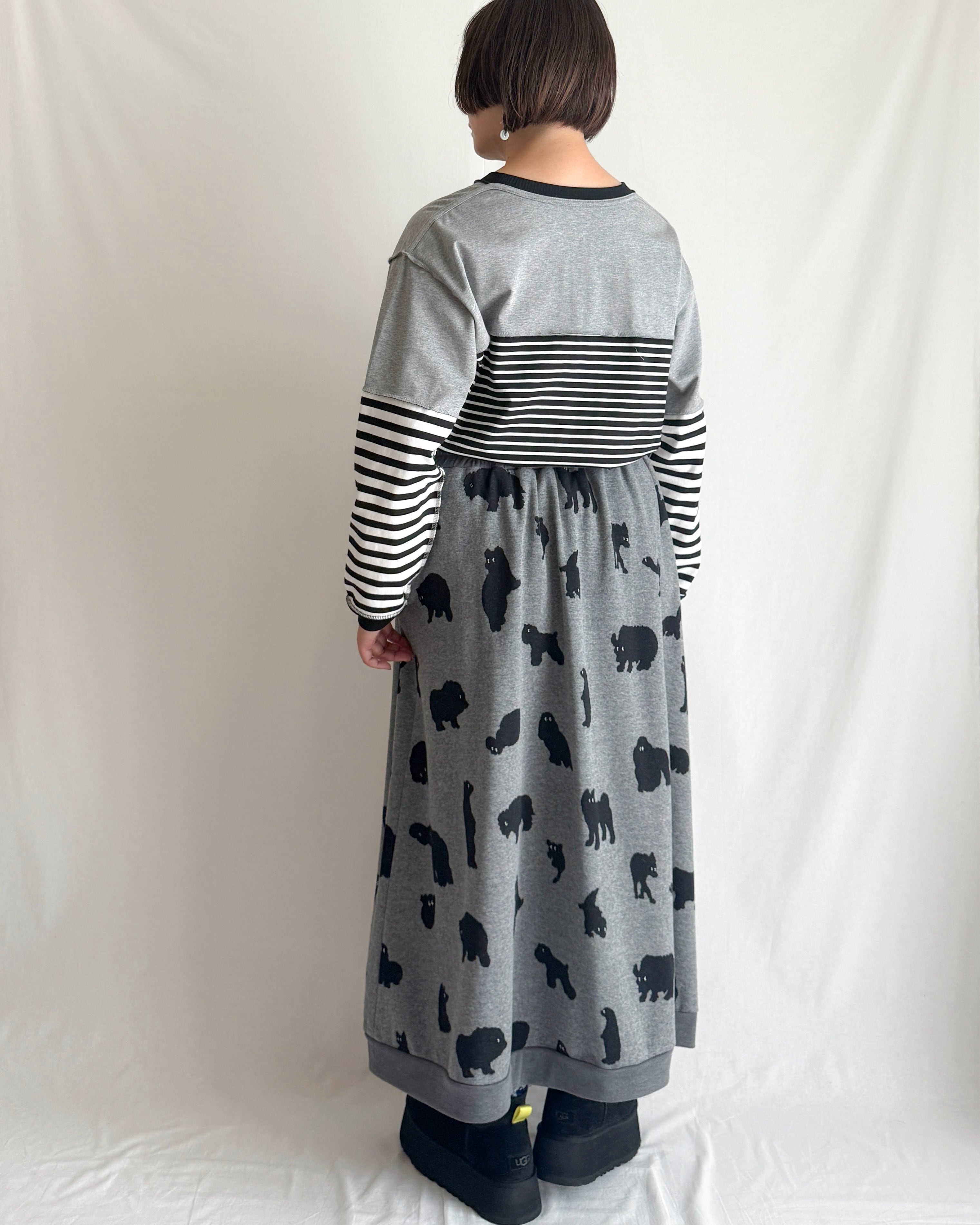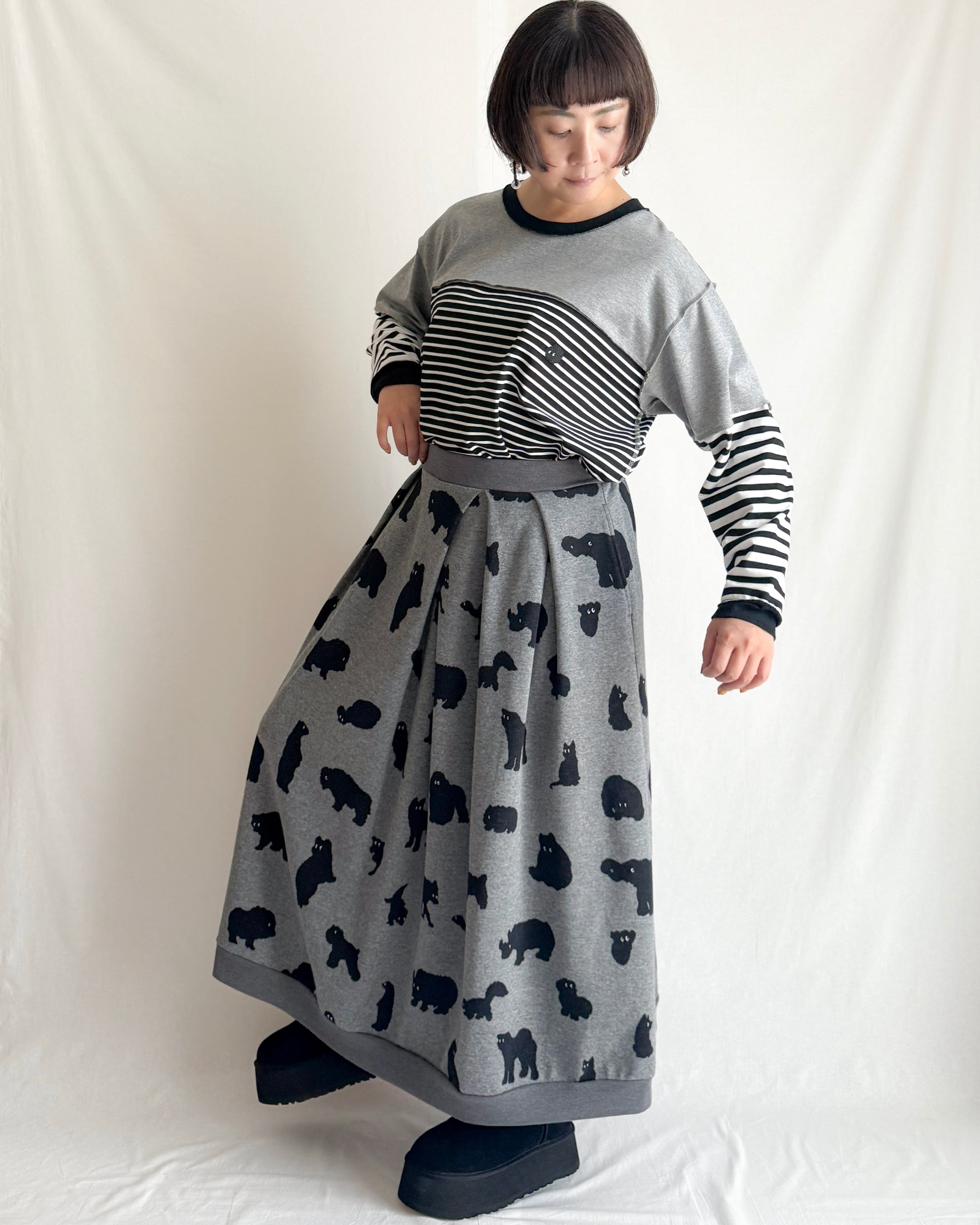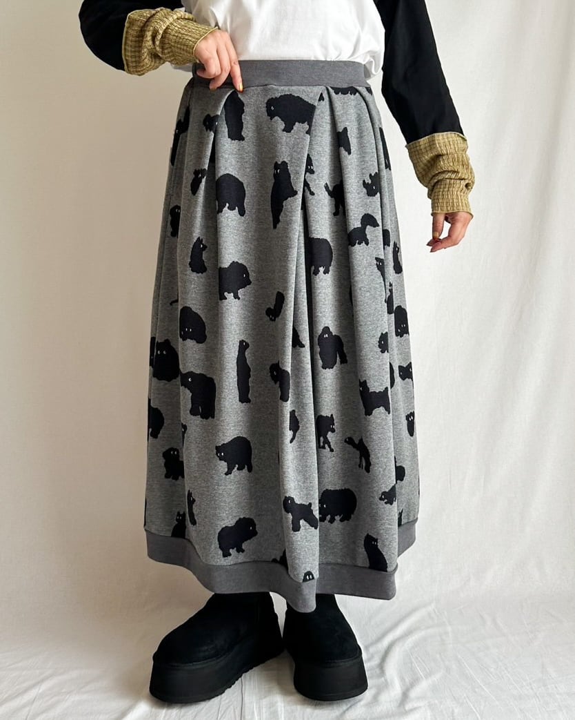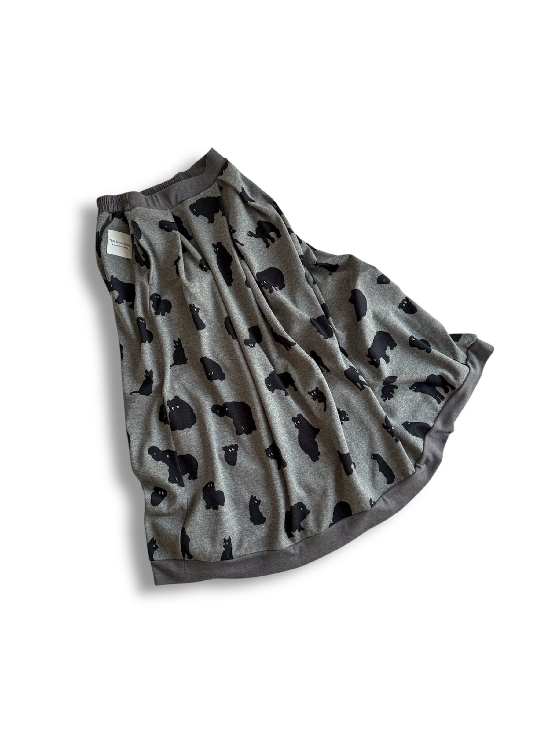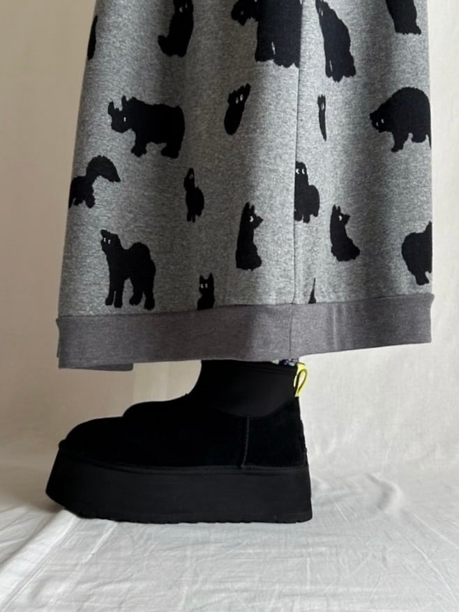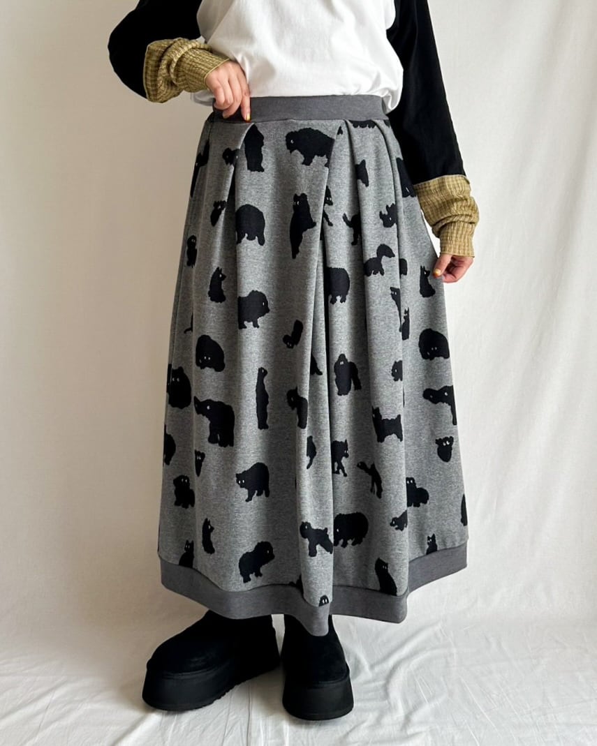 “This is not a cat.”をテーマに、たかしまがモノクロで描く動物たちのドローイングをダブルジャガードで表現したテキスタイルシリーズ。たっぷりと生地を使ったスカートは、前ウエストのランダムなタックと裾リブがつくる自然なバルーンシルエットが特徴。見る人の想像力をかきたてるアートを、日常着として贅沢に楽しめる特別なスカートです。