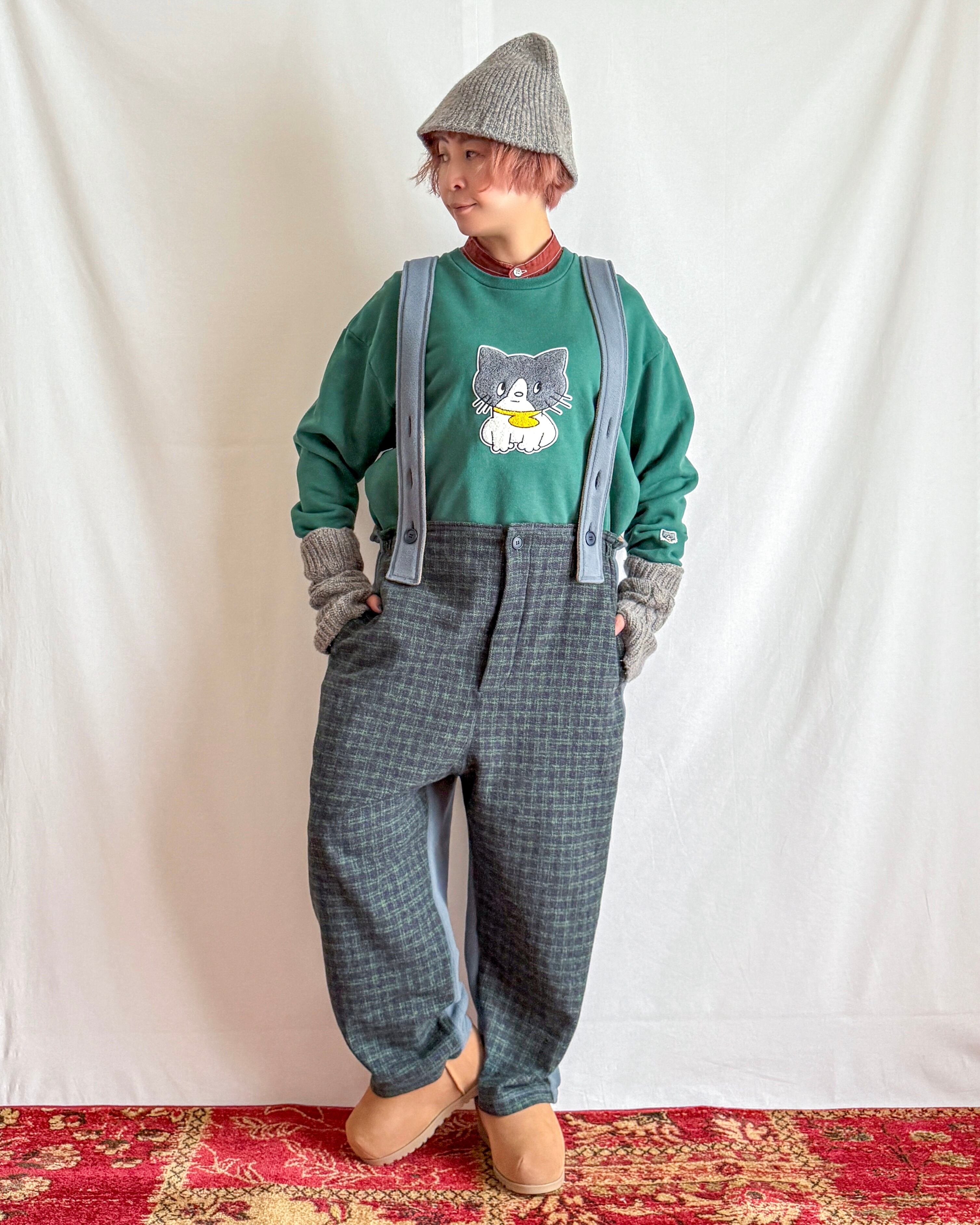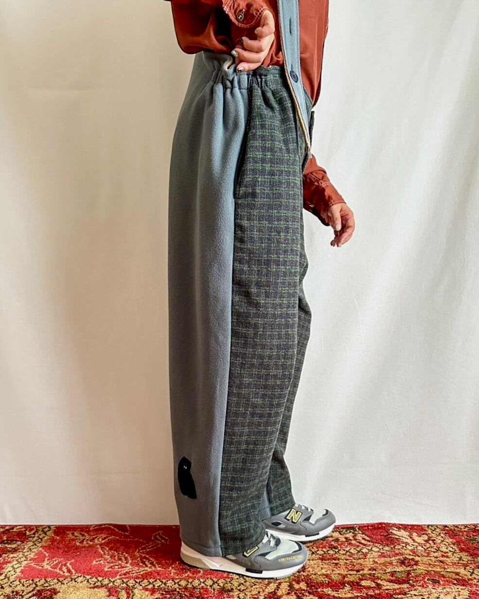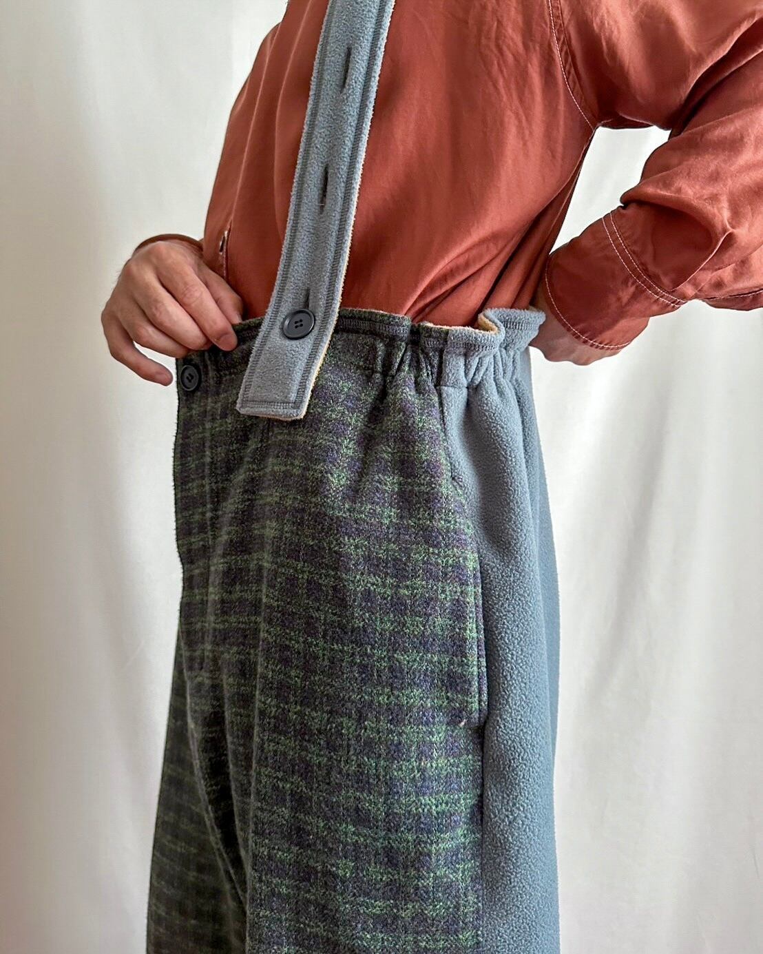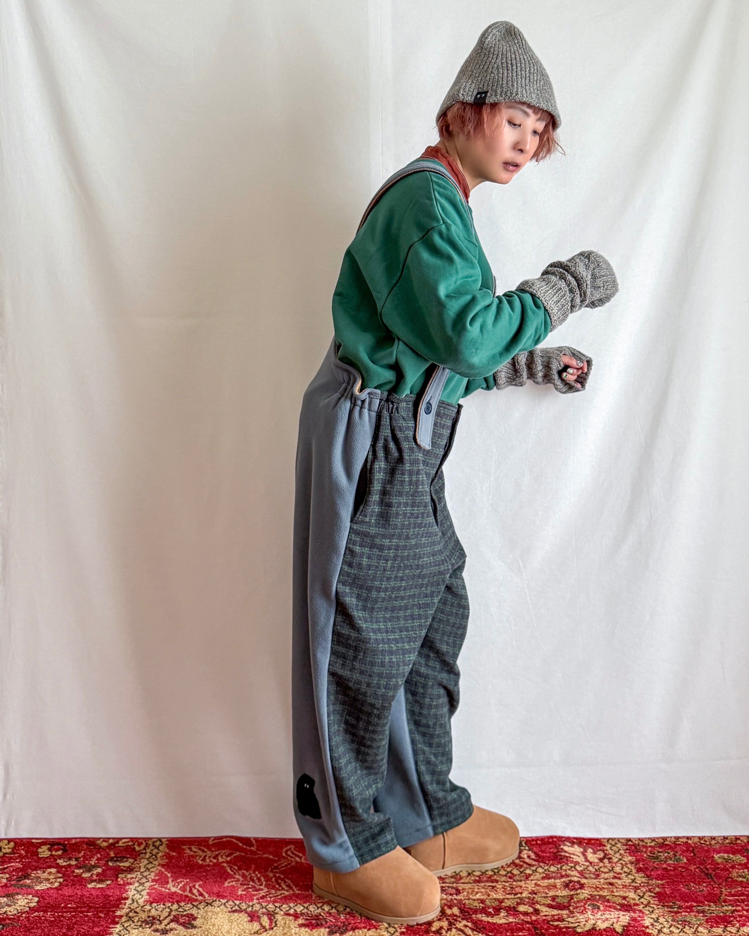 ・ネイビー×グリーンのガンクラブ風チェックに、「MOJA FLEECE BIG HOODIE」と同じブルーグレーのマイクロフリースを合わせることで、モダンであたたかな印象に仕上げました。