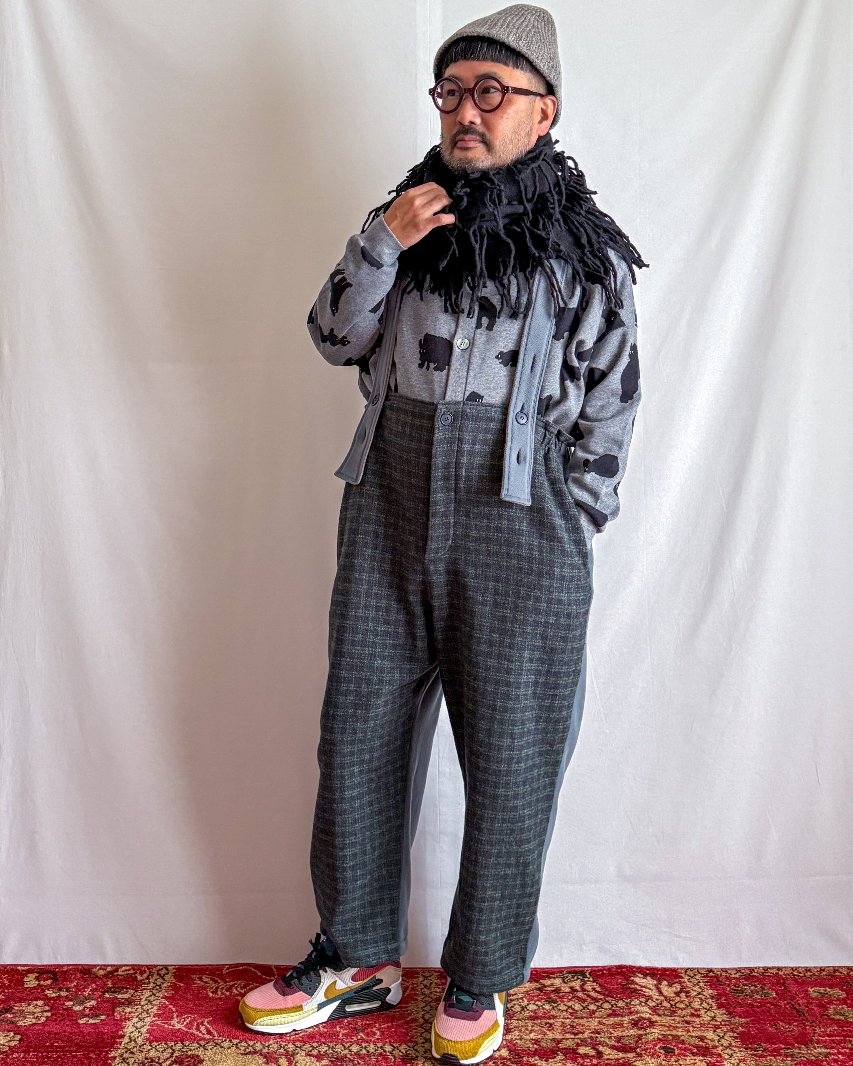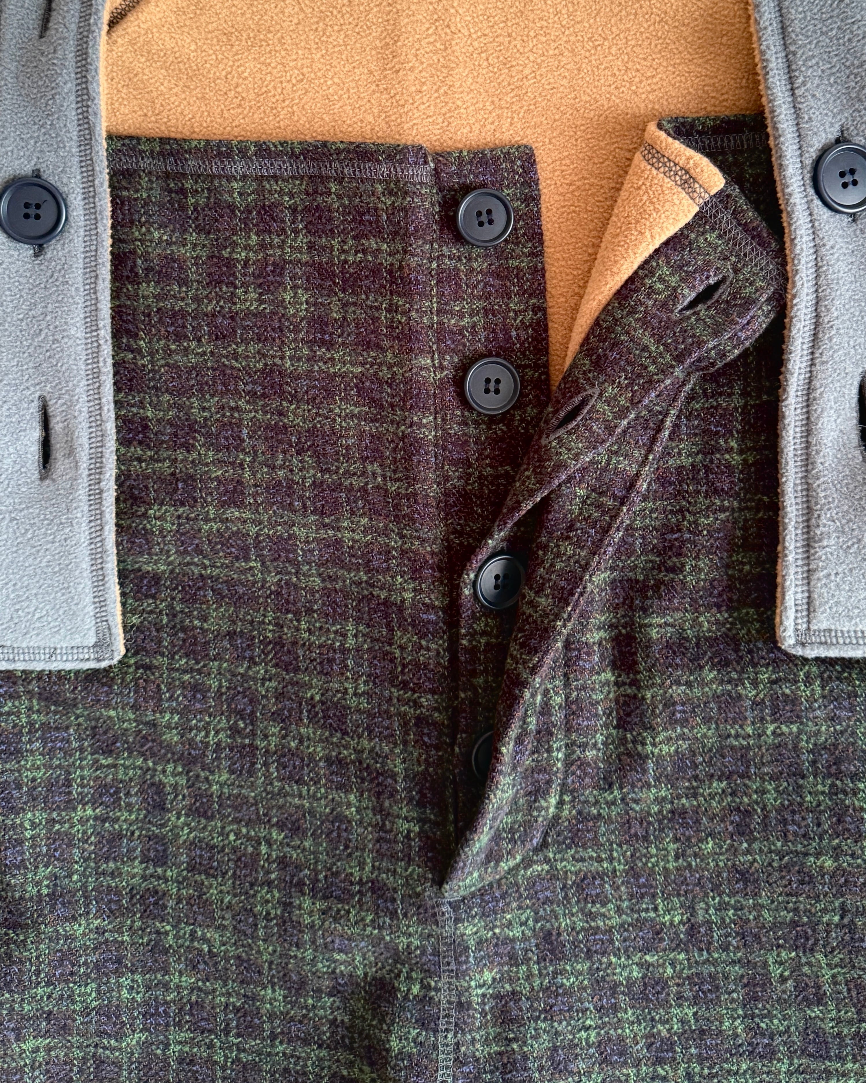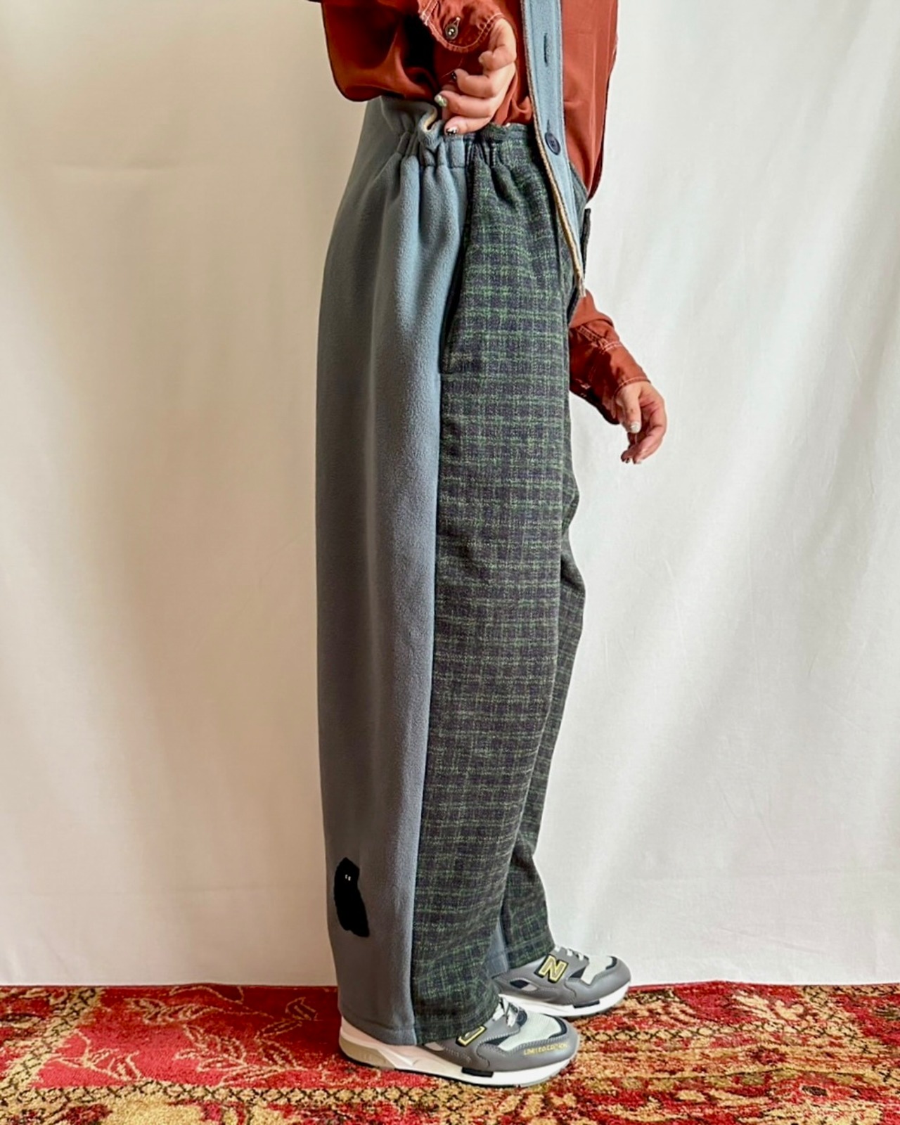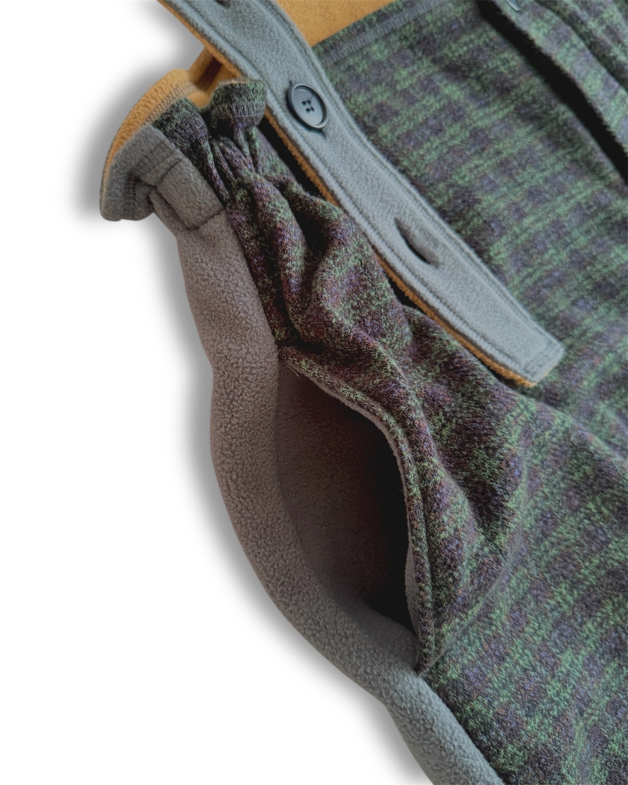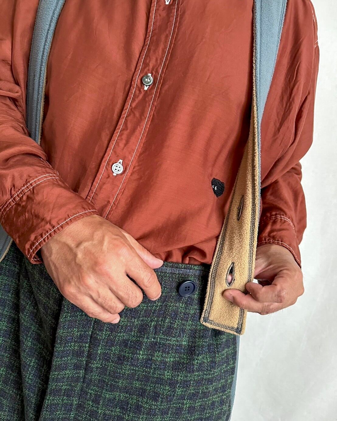 ・ネイビー×グリーンのガンクラブ風チェックに、「MOJA FLEECE BIG HOODIE」と同じブルーグレーのマイクロフリースを合わせることで、モダンであたたかな印象に仕上げました。