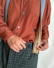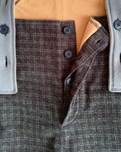 ・前立ては比翼仕立てで、大きめのボタンが並んだデザイン。ボタンを開けなくても、パンツと同じ感覚で着脱できるつくりになっています。