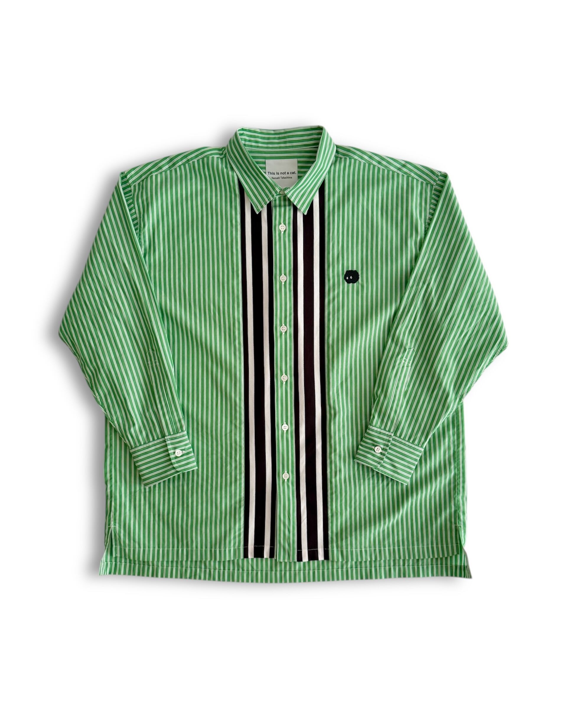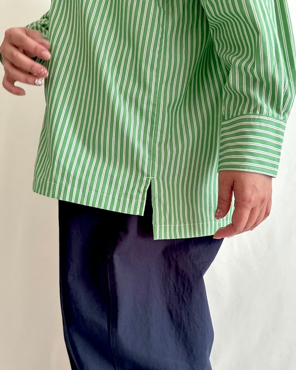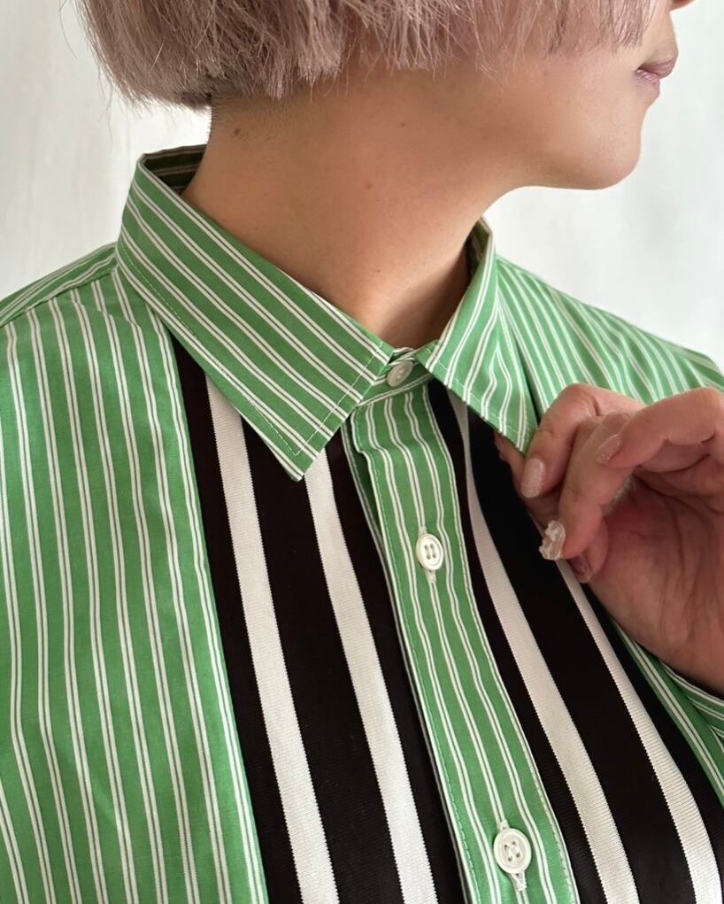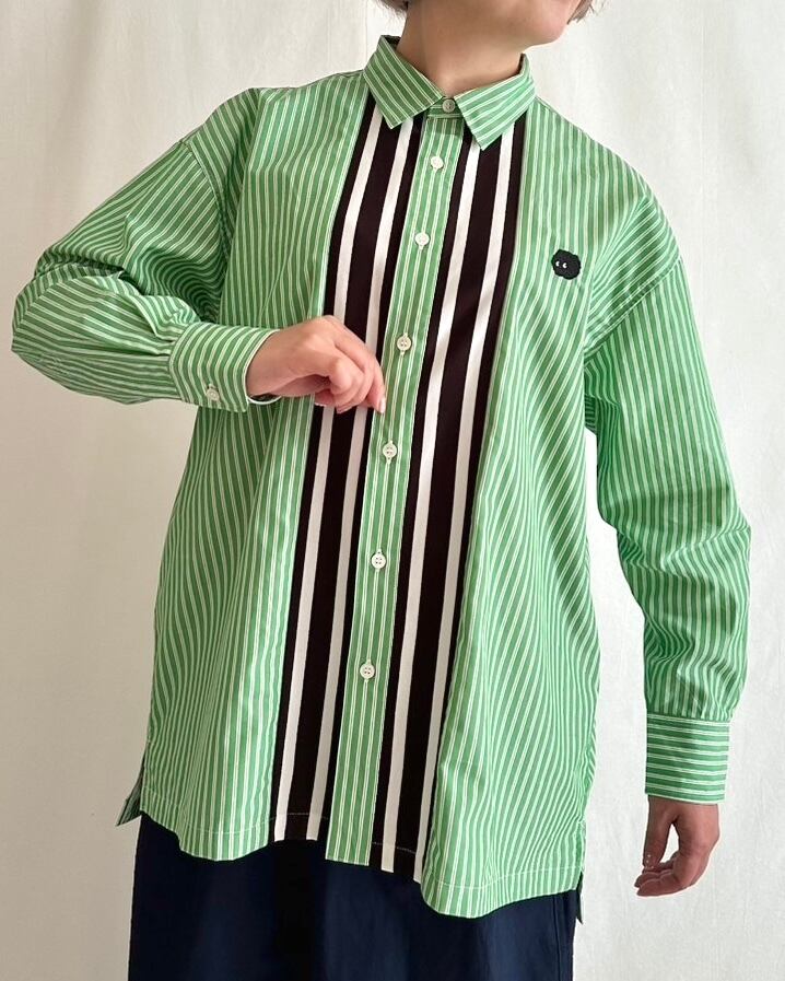 ・リズミカルなグリーン×ホワイトのストライプに、太ピッチのボーダーを大胆に縦使いしてドッキング。爽やかさの中に、ブラック×オフホワイトのコントラストを効かせ、ストライプinストライプの遊び心を楽しめる1枚に仕立てました。