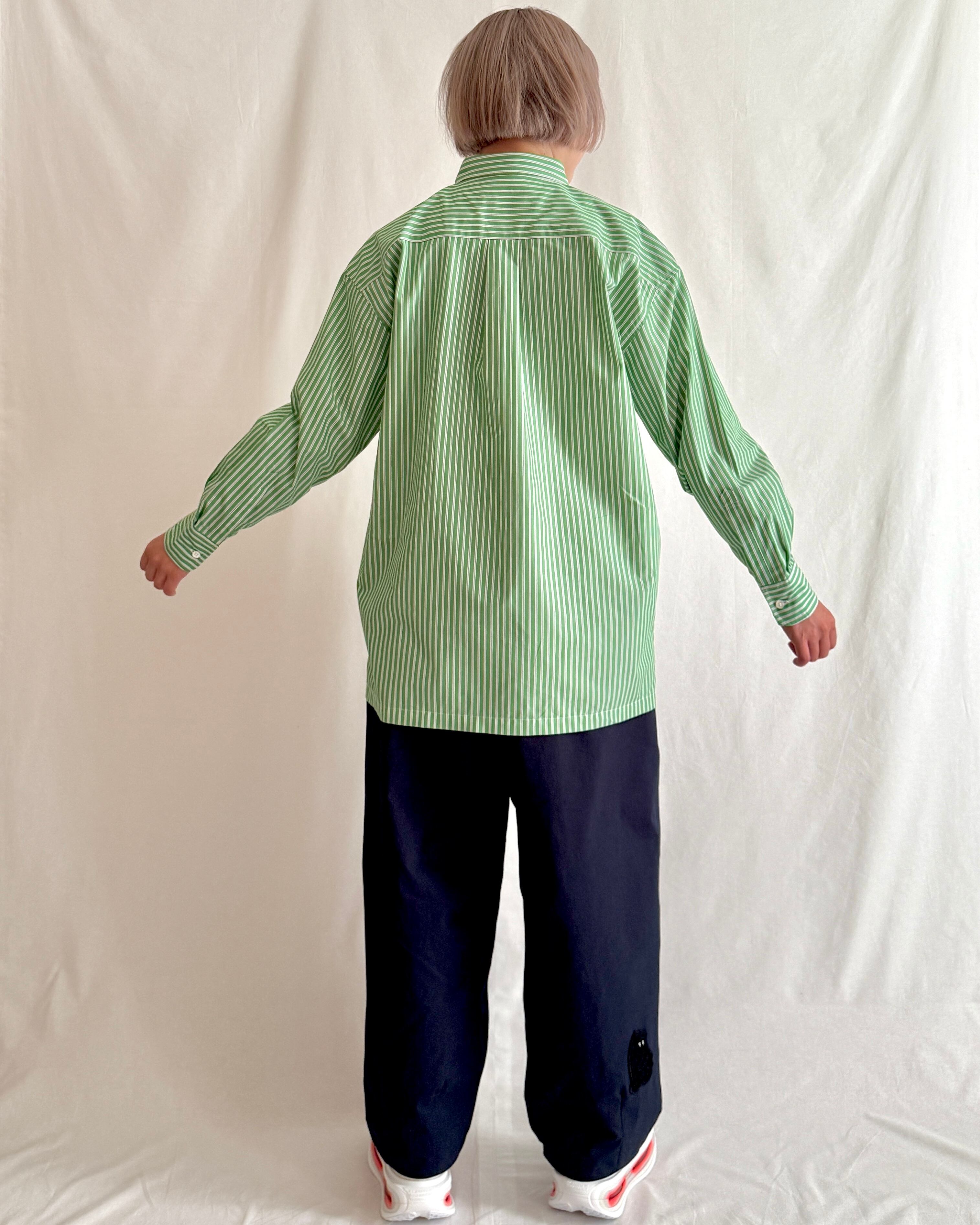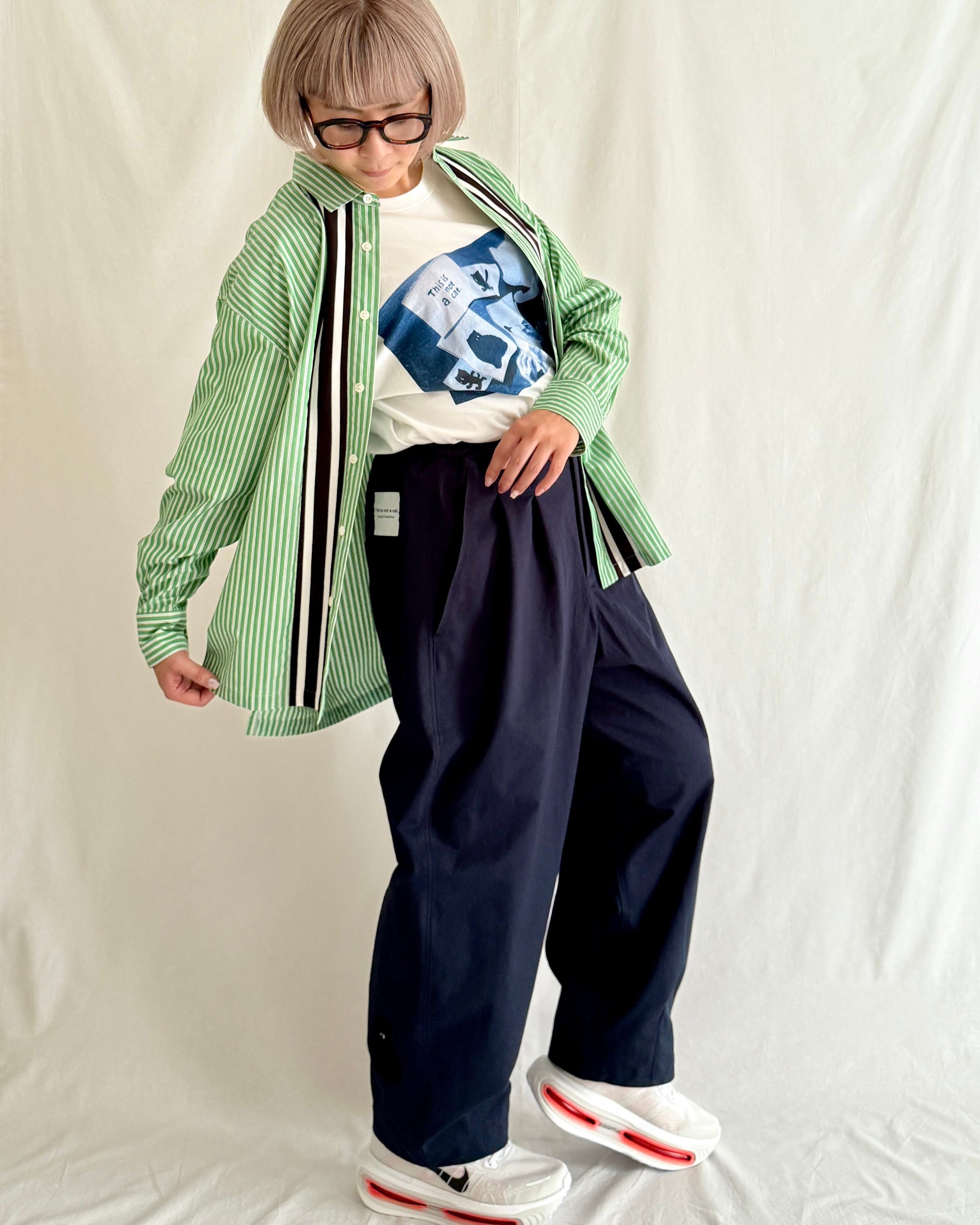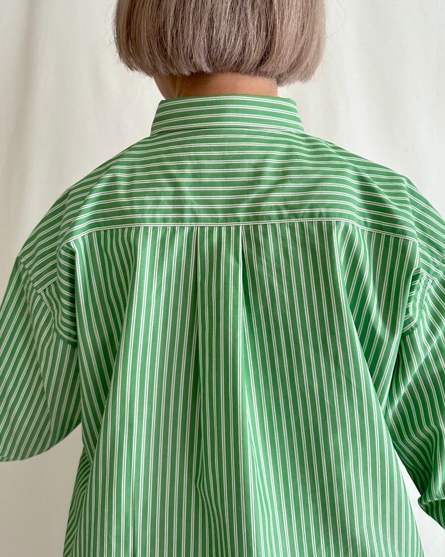 ・リズミカルなグリーン×ホワイトのストライプに、太ピッチのボーダーを大胆に縦使いしてドッキング。爽やかさの中に、ブラック×オフホワイトのコントラストを効かせ、ストライプinストライプの遊び心を楽しめる1枚に仕立てました。