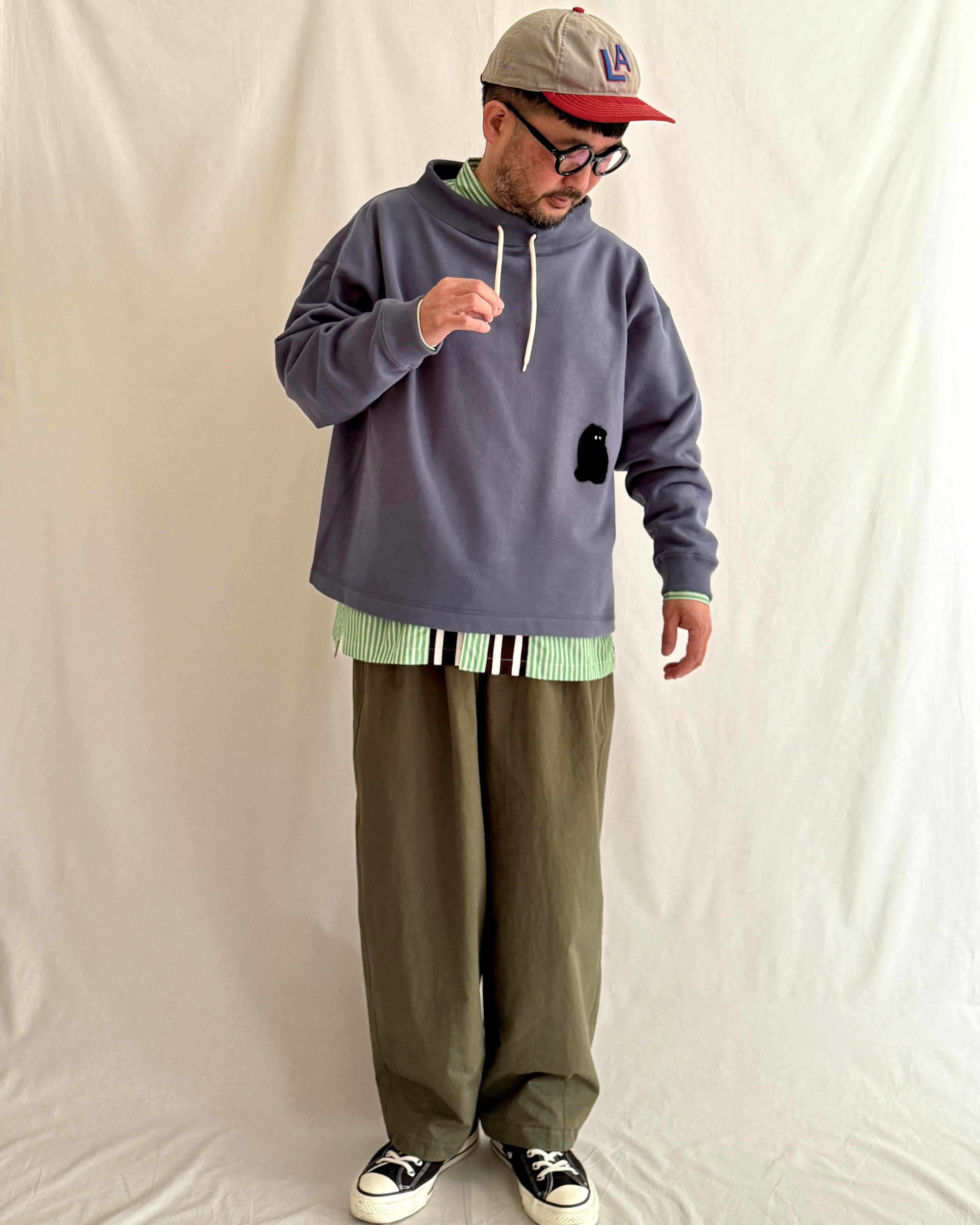 ・メインに使用したのは、シーズンを問わず着回せる、程よい厚みの裏毛素材。裏側のパイル状の編み地が、空気を含んであたたかさをキープして、蒸れにくいのが特徴。いつでも気持ちよく着られる、コットン100%のベーシックな素材です。