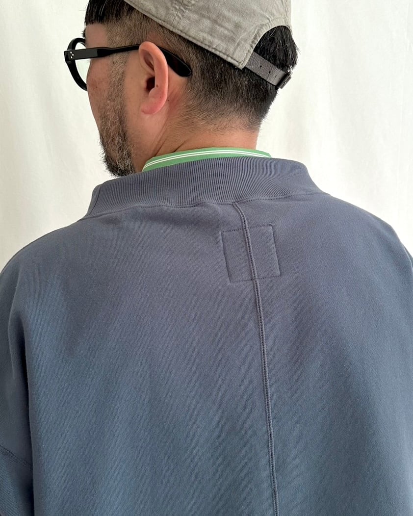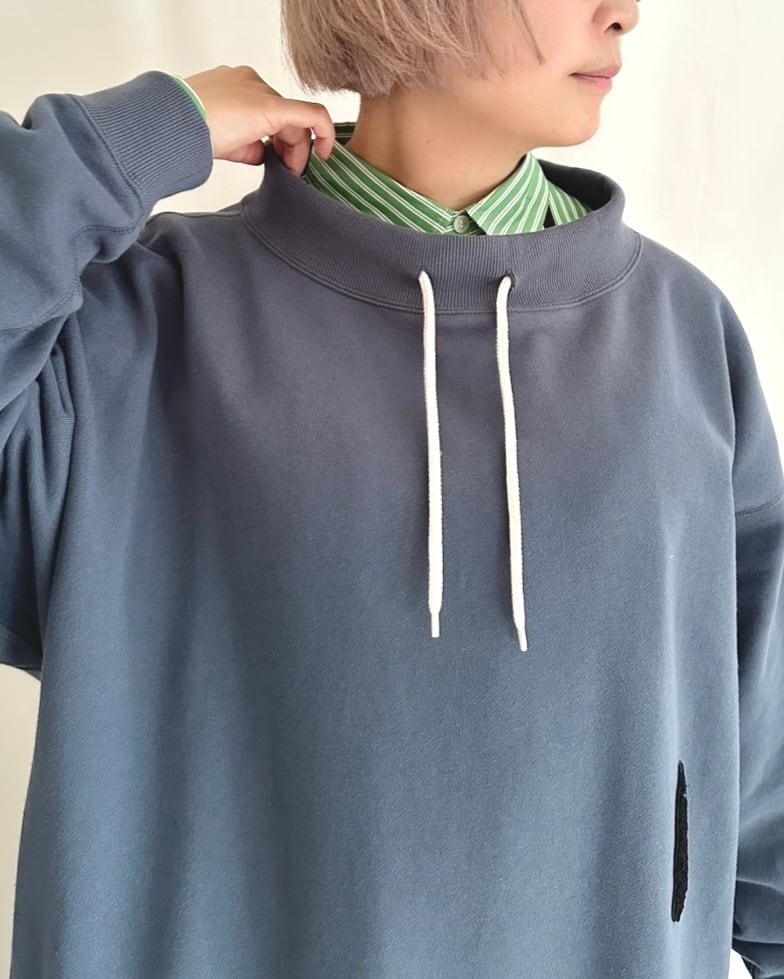 ・広い襟ぐりを生かして、中にシャツを合わせて襟元を見せるスタイリングがおすすめ。「MOJA STRIPE DOCKING SHIRT」のようなカラーシャツも好相性です。