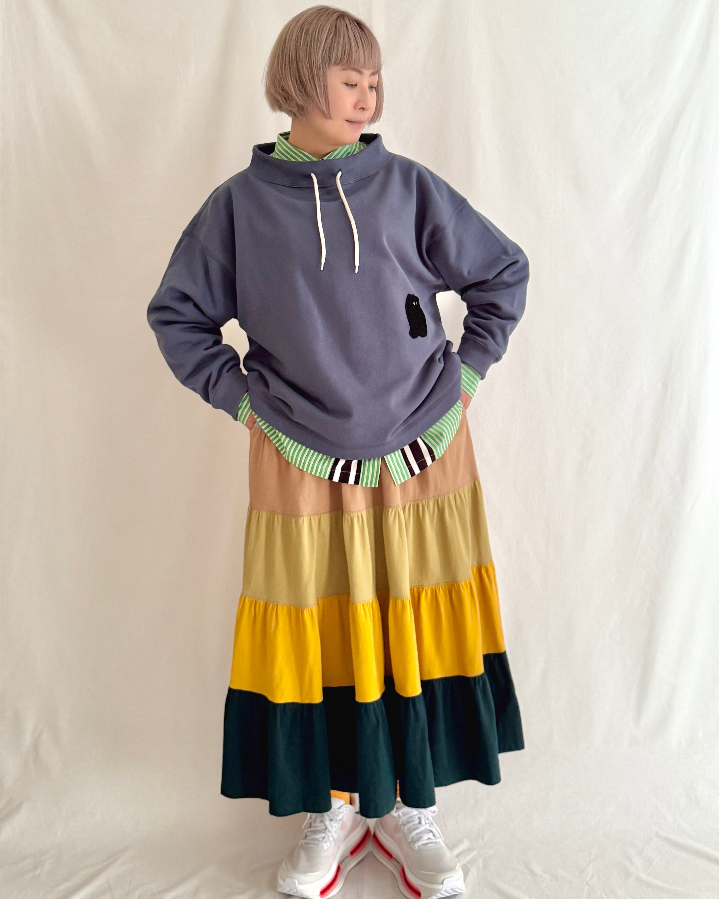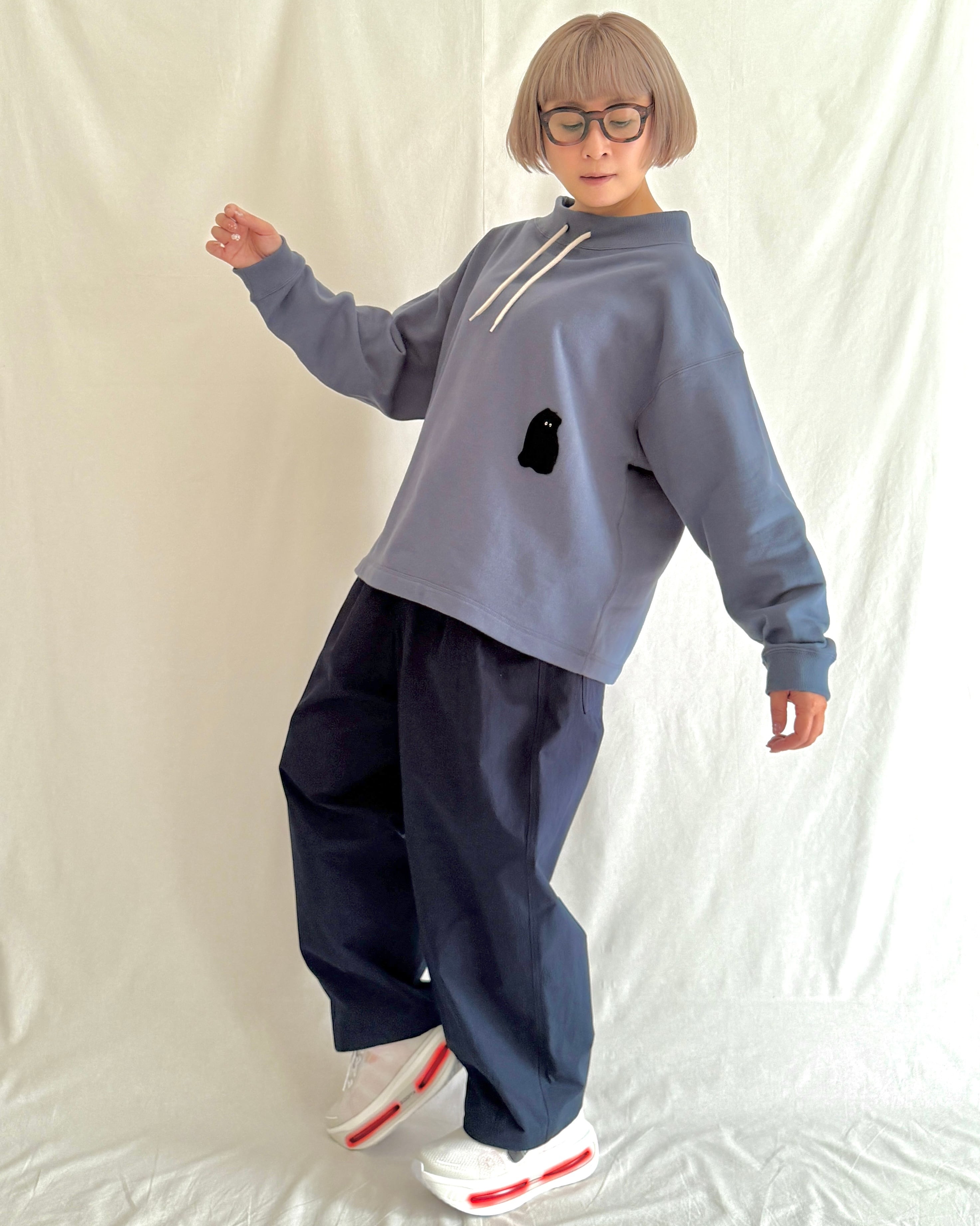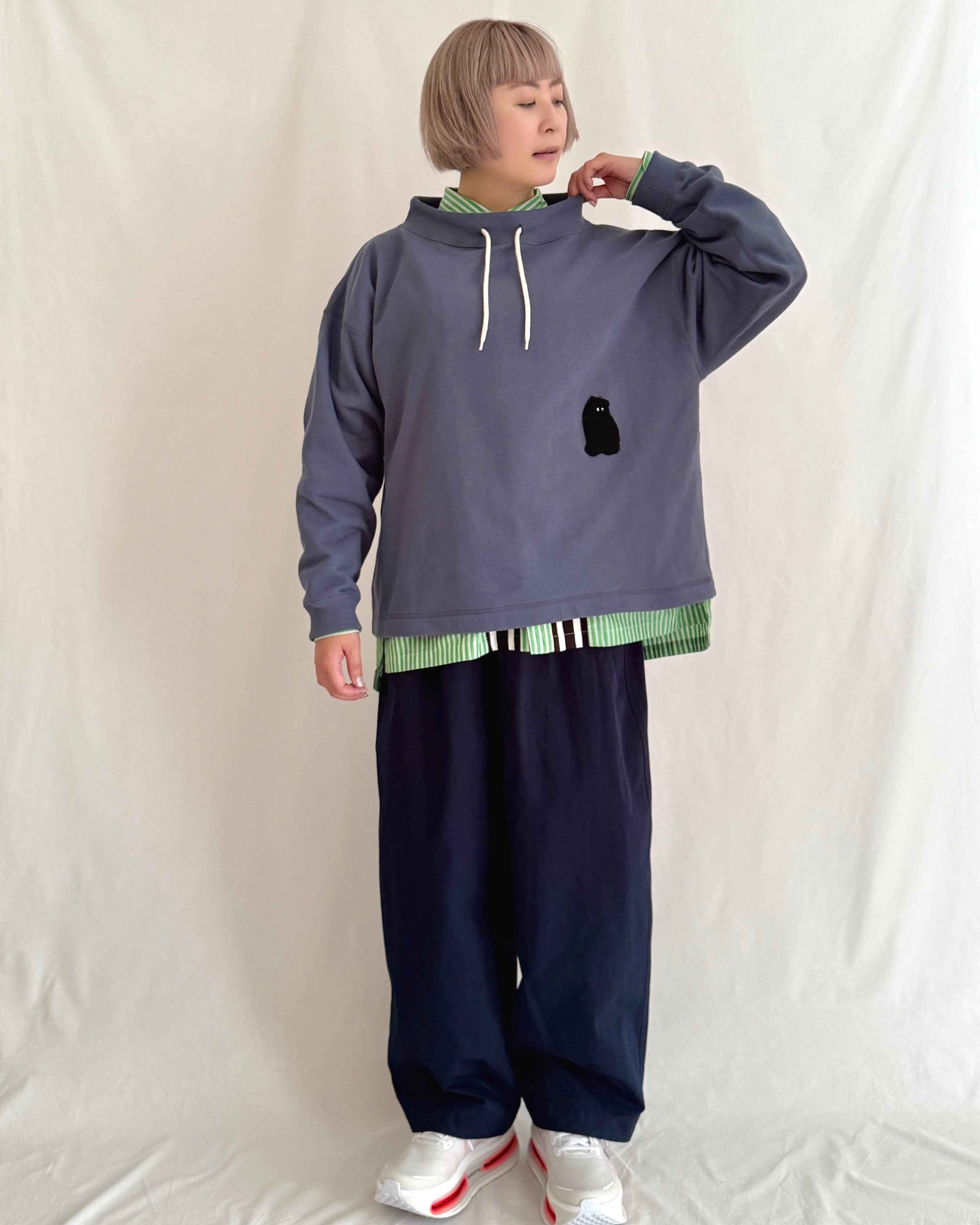 ・正方形に近いスクエアなシルエット。身幅をたっぷりとることで、着丈がややコンパクトに見えるバランスに。ストンと落ちるボックス型は、重ね着にもなじみやすく、立ち上がりのあるワイドなネックが全体のシルエットにメリハリをプラスしています。
