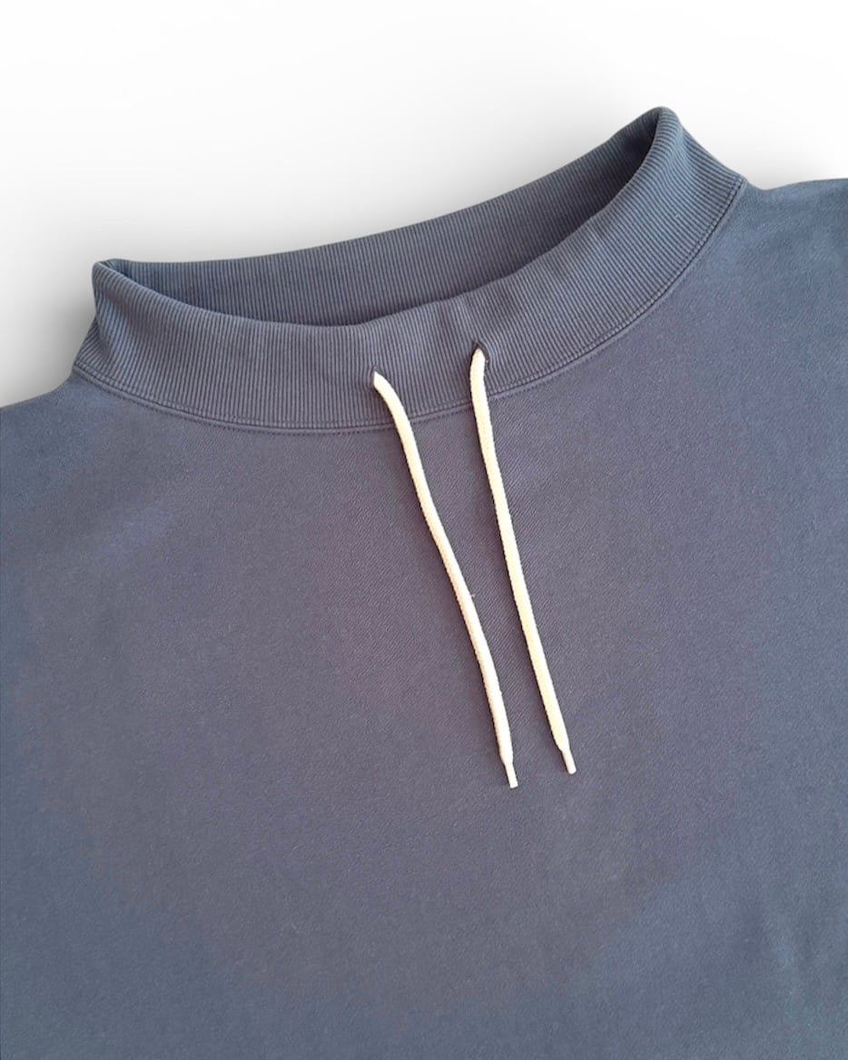 ・ネックにはドローコードを通し、分量感のある無地アイテムに表情をつけるアクセントに。