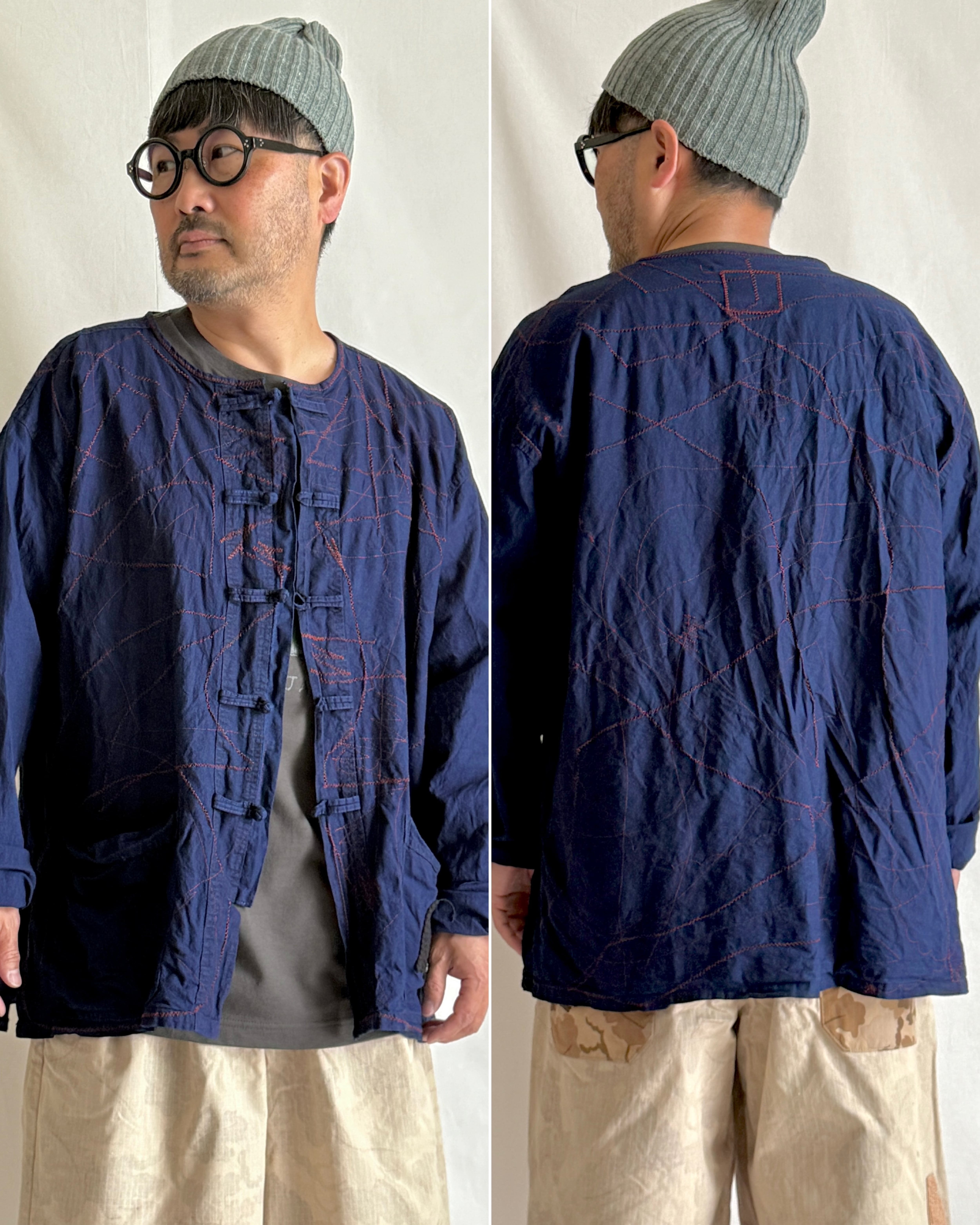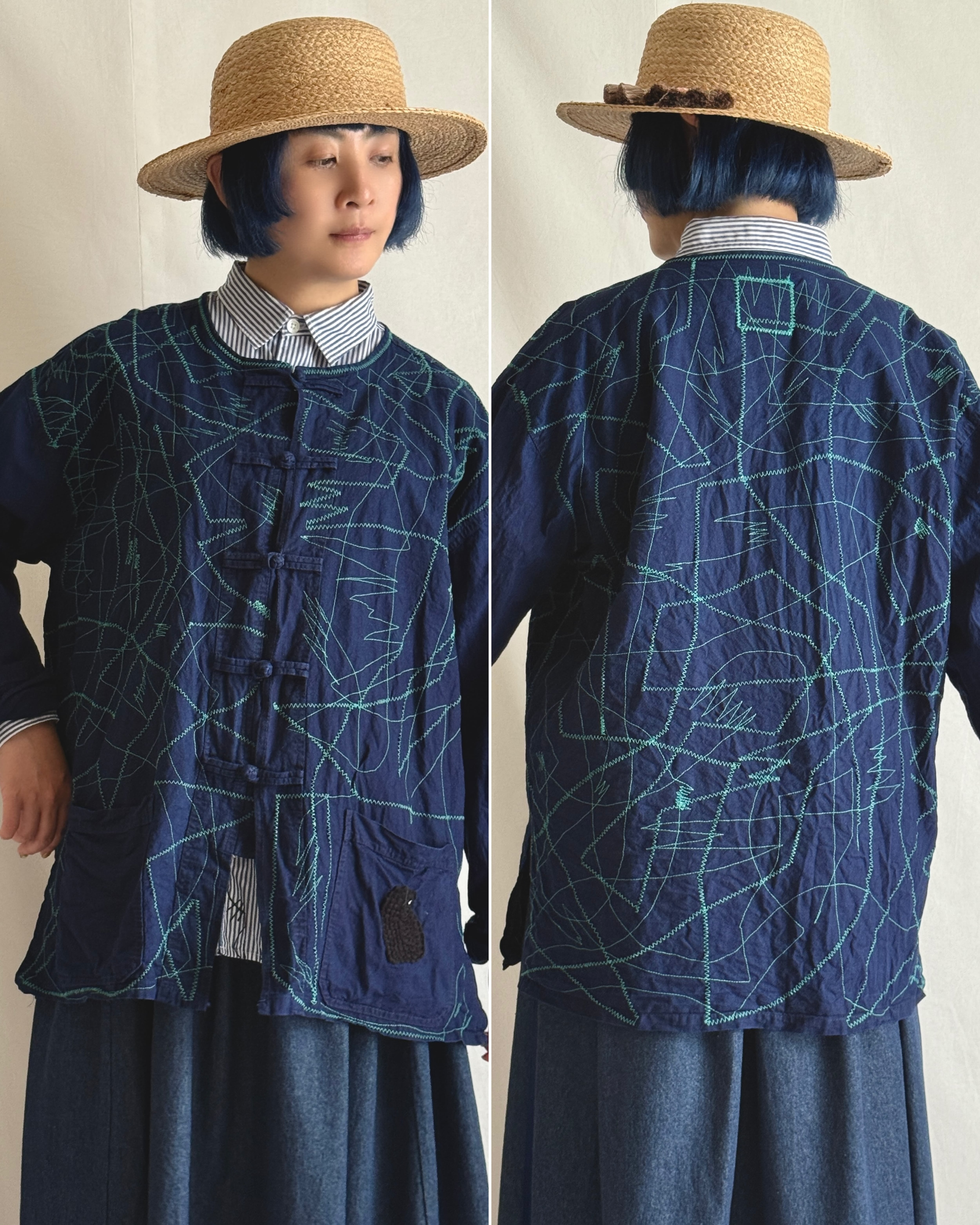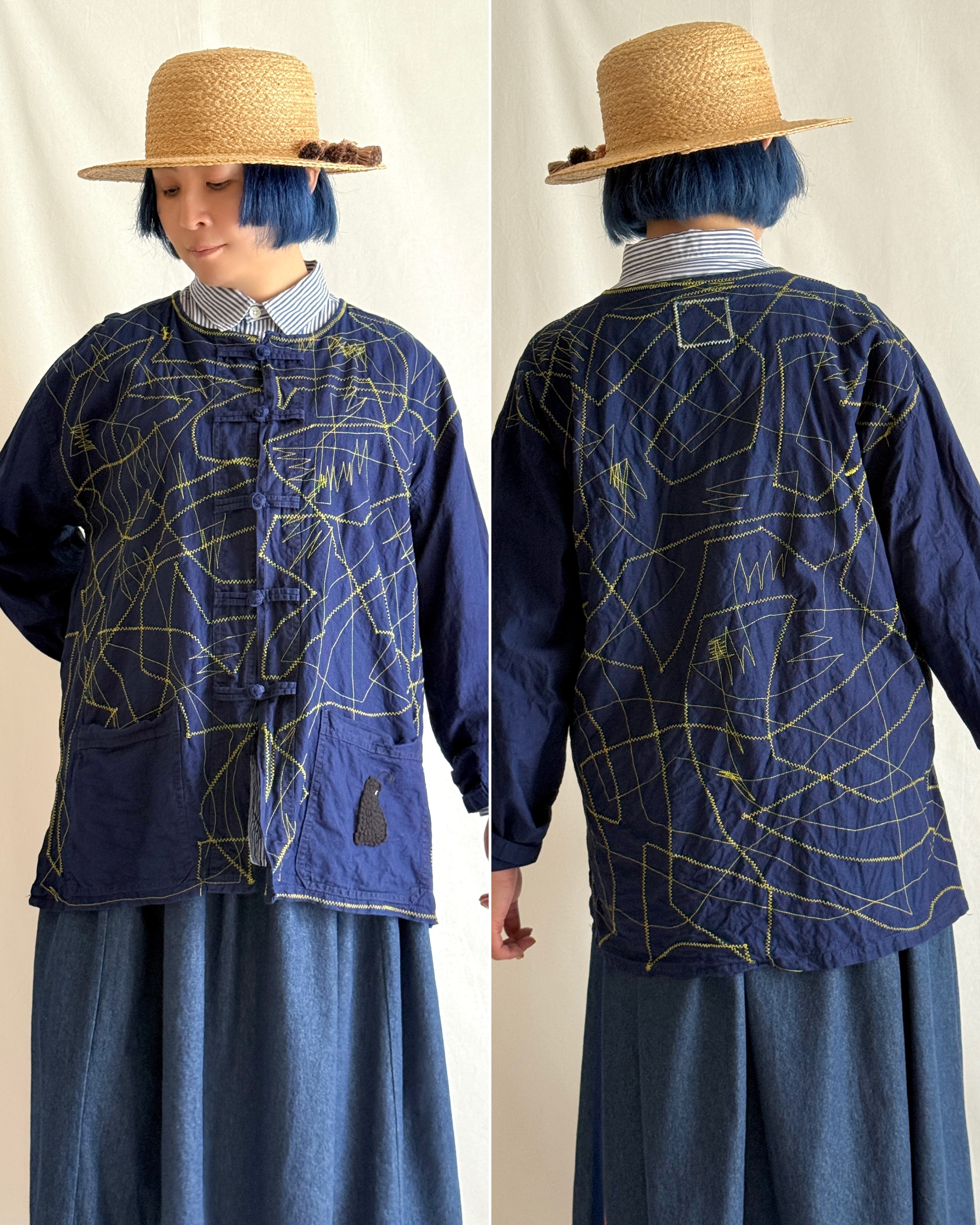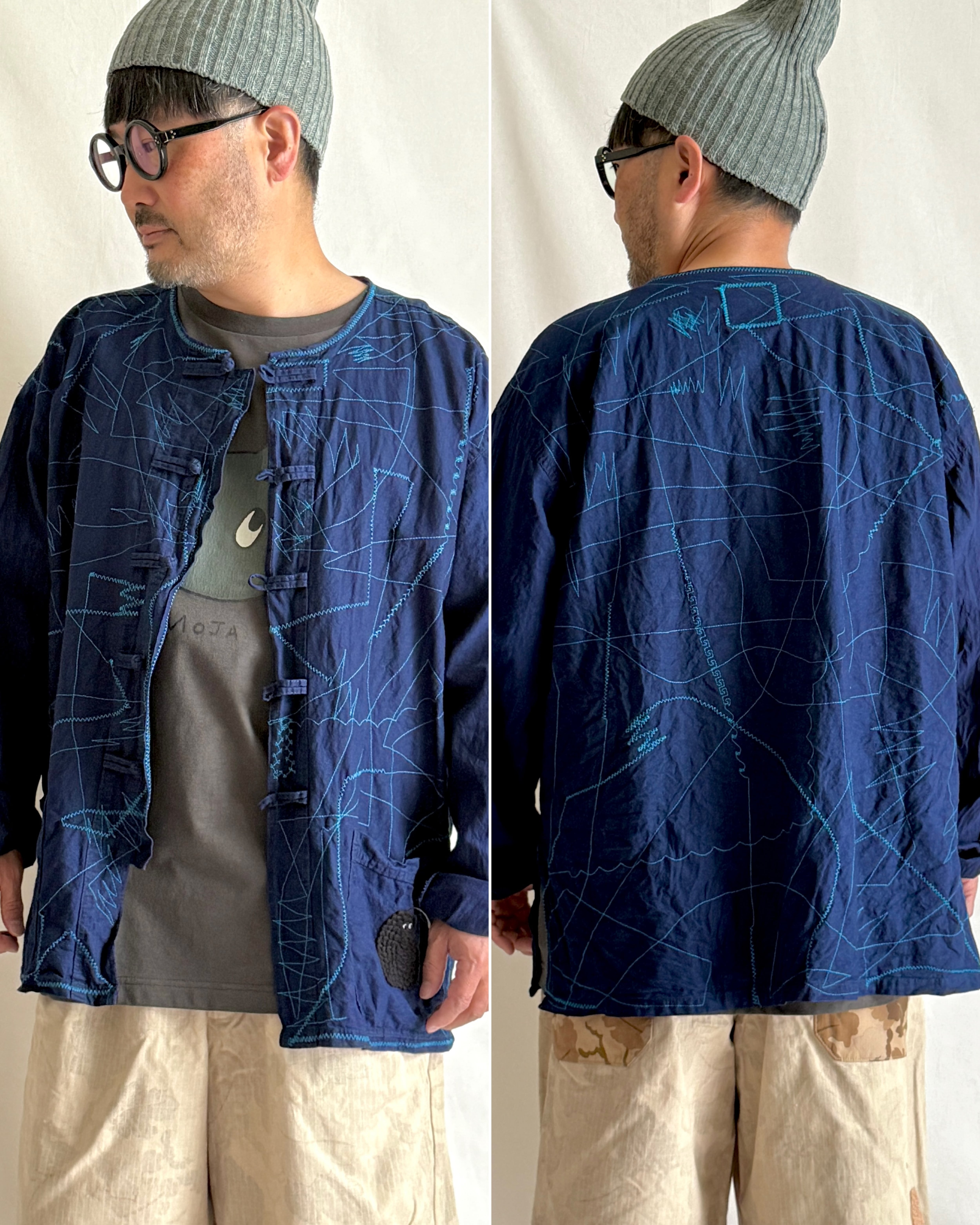 ・古着好きなたかしまが、Vintage Shopでセレクトしたヴィンテージシャツに、1点1点即興のステッチをミシンで施しました。それはまるで、インディゴの夜をさまよう「モジャ」の足跡のようです。ステッチのカラーと柄は1点1点異なる、オンリー1のアイテムに仕上げました。