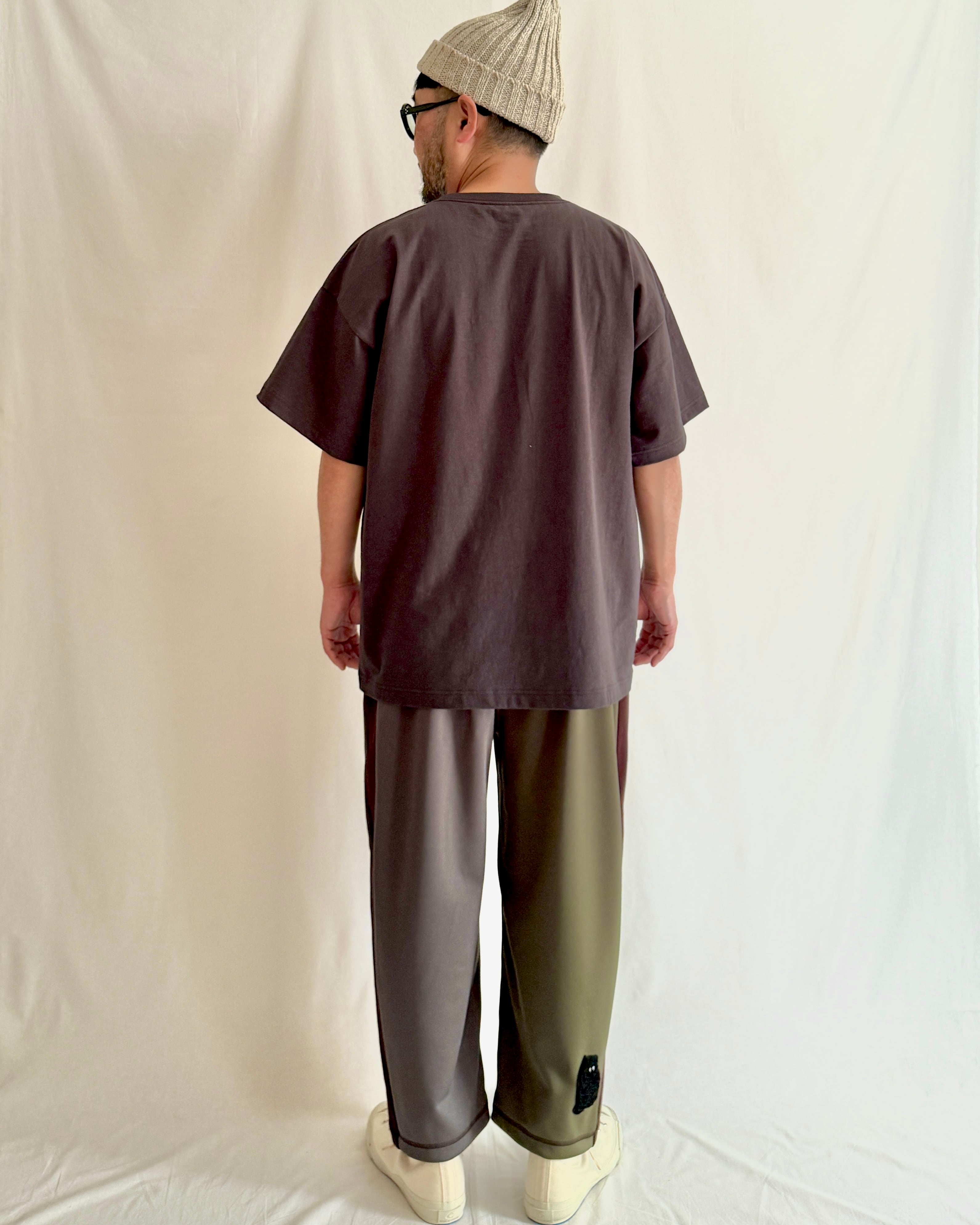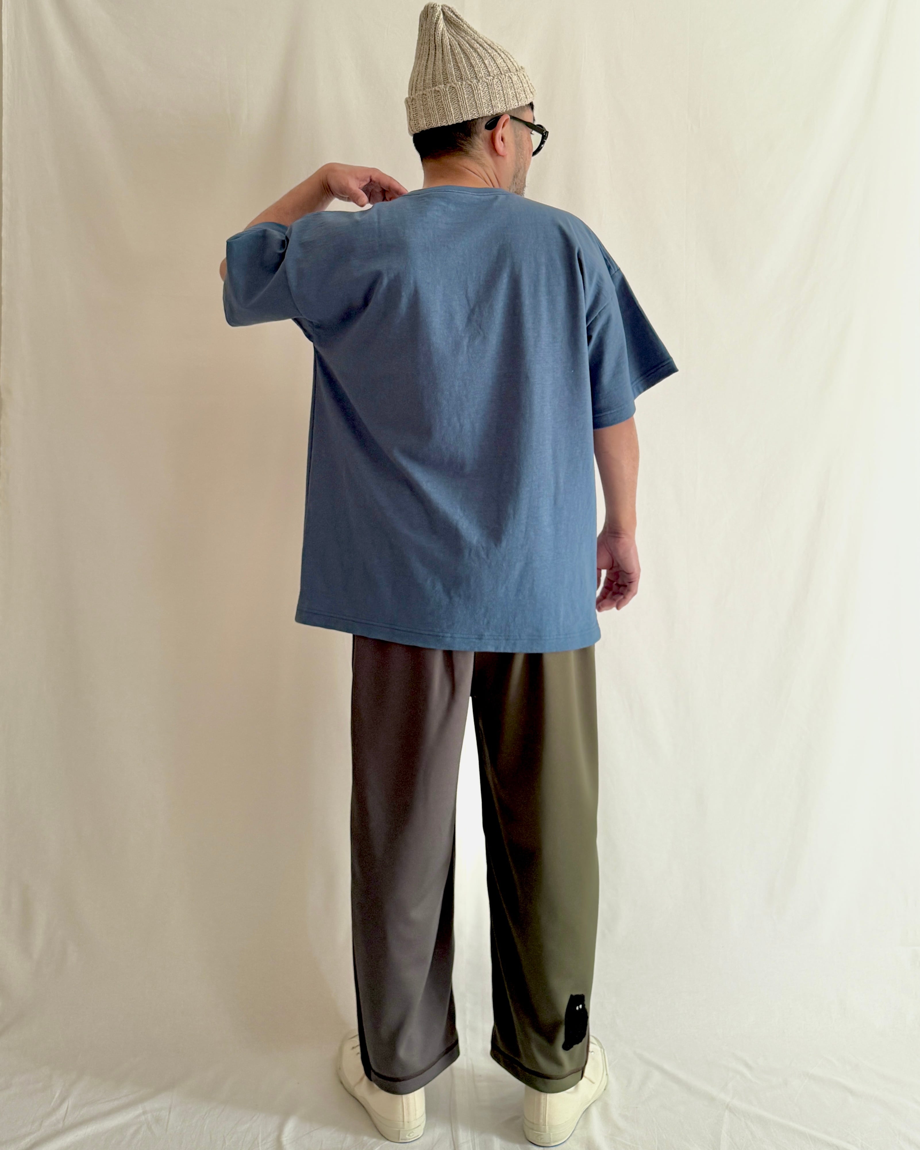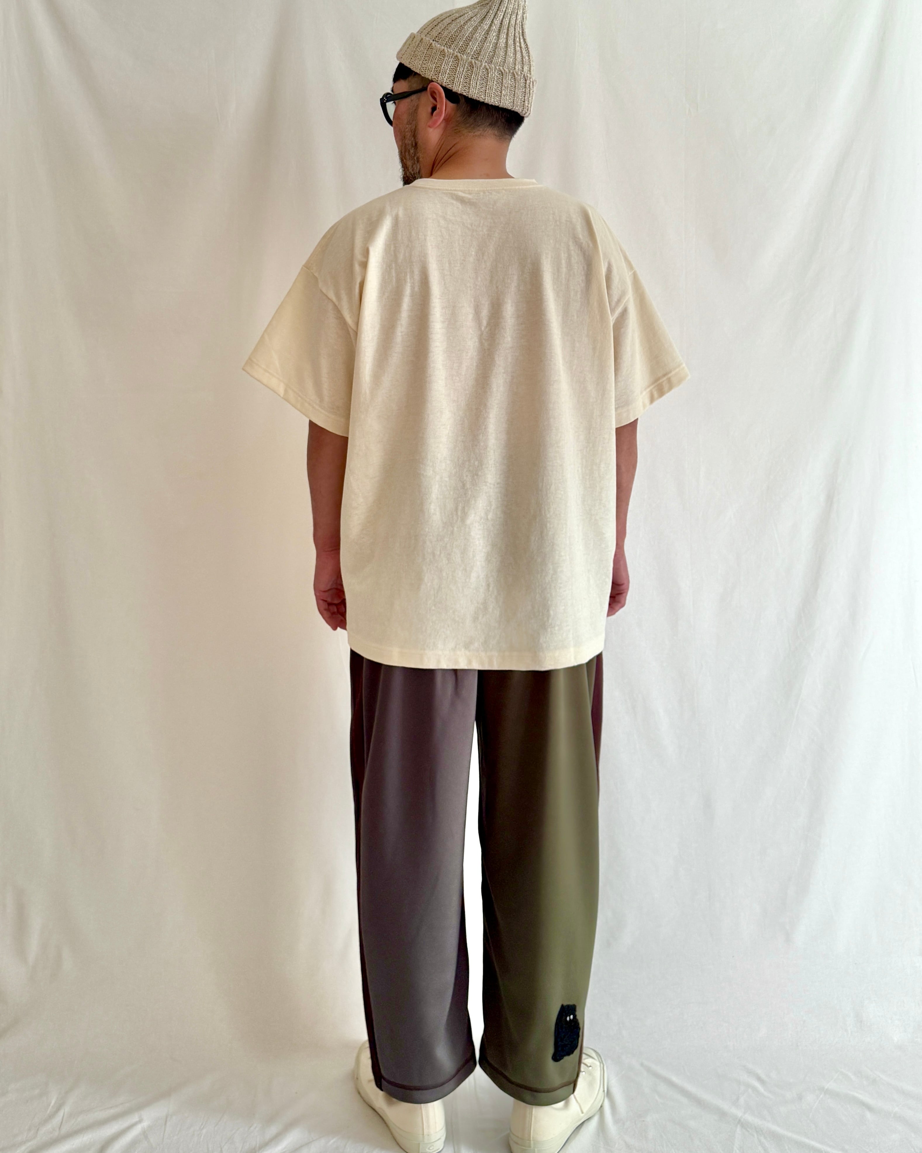 ・ボディには、落ち綿(わた)を再利用した、ラフィー素材のコットン天竺を使用。自然なムラ感と、程よいシャリ感が特徴。使い込んだようなヴィンテージ感がありつつも、厳選された上質な原料を丁寧に紡いだ、奥行きのある風合いが魅力です。