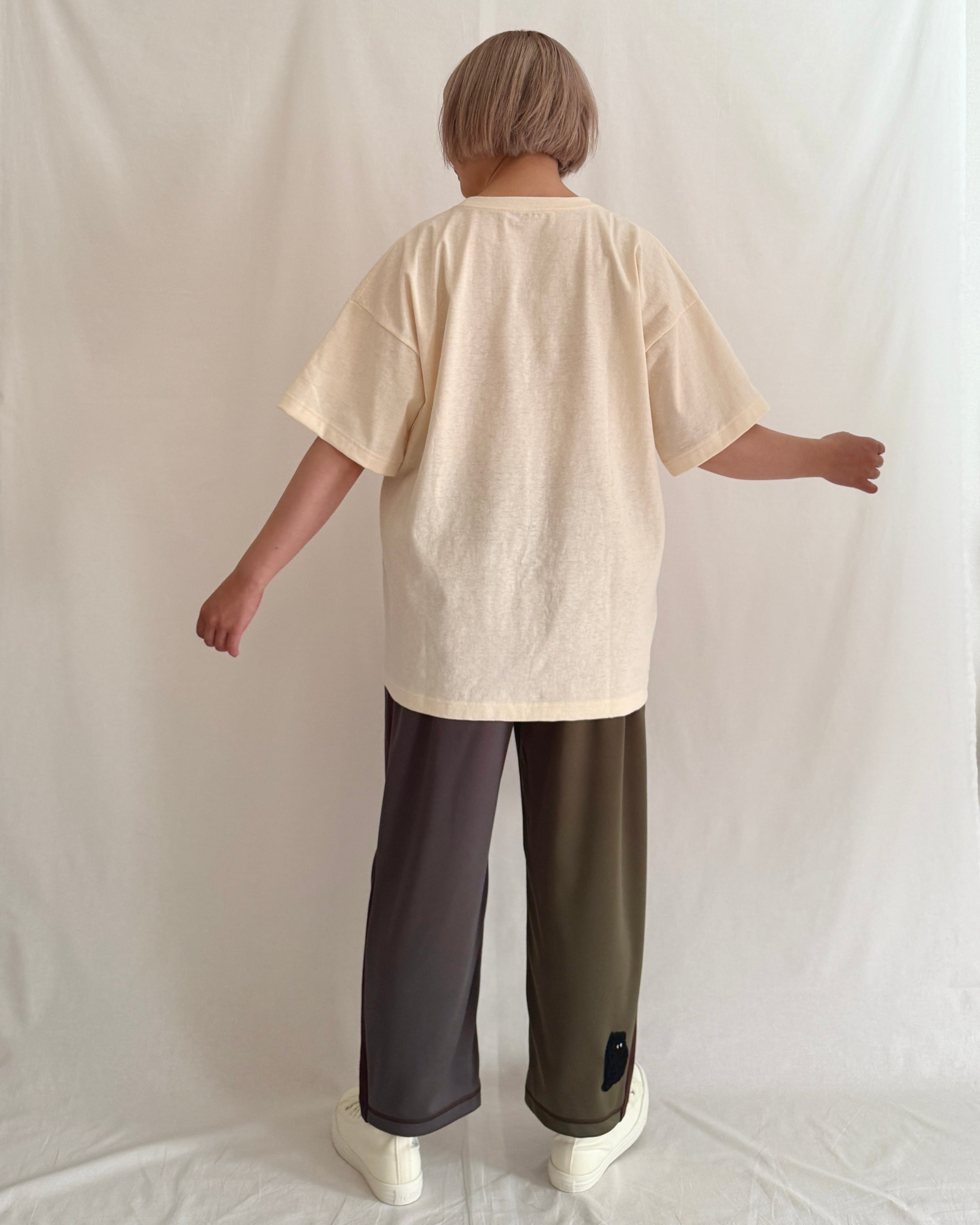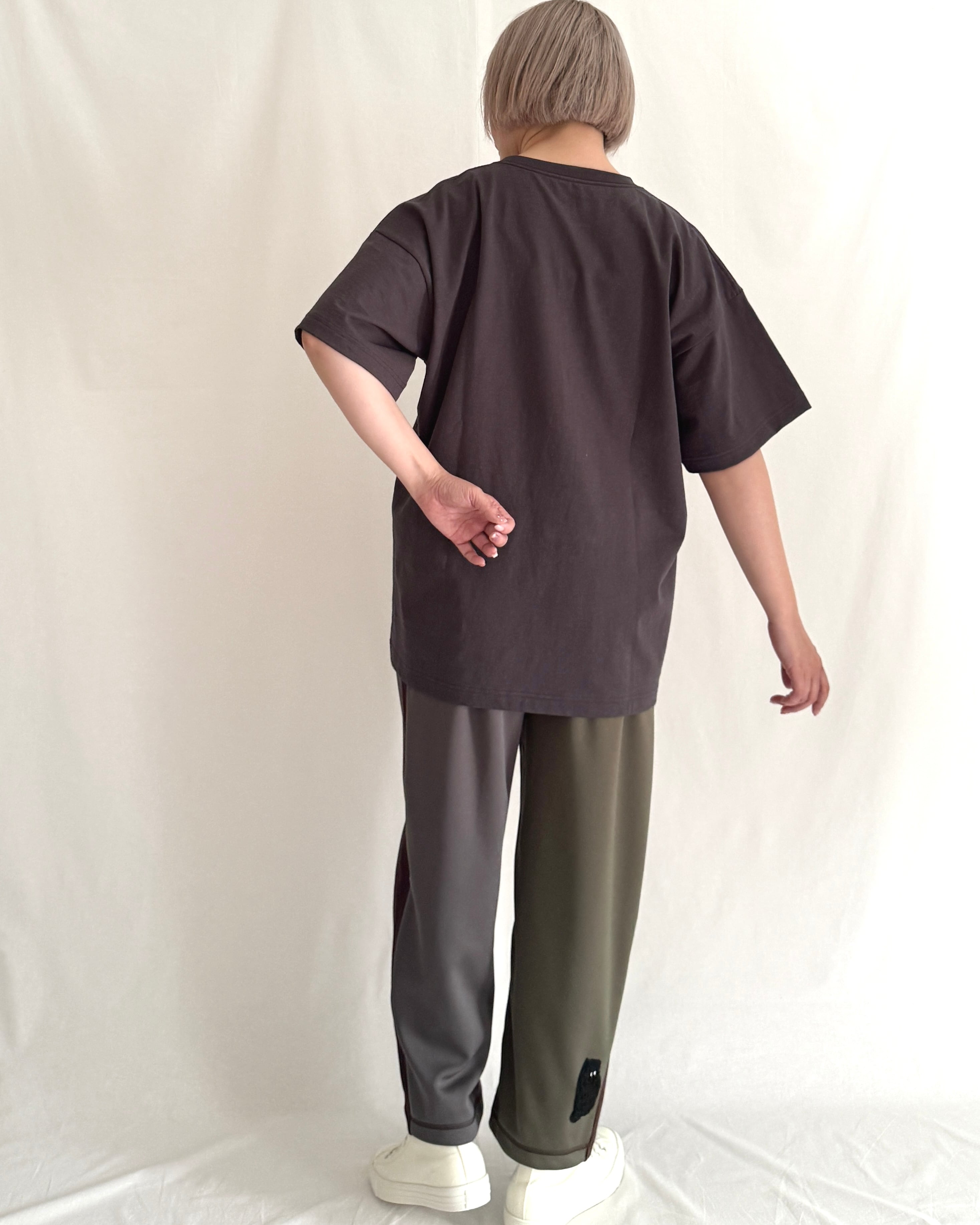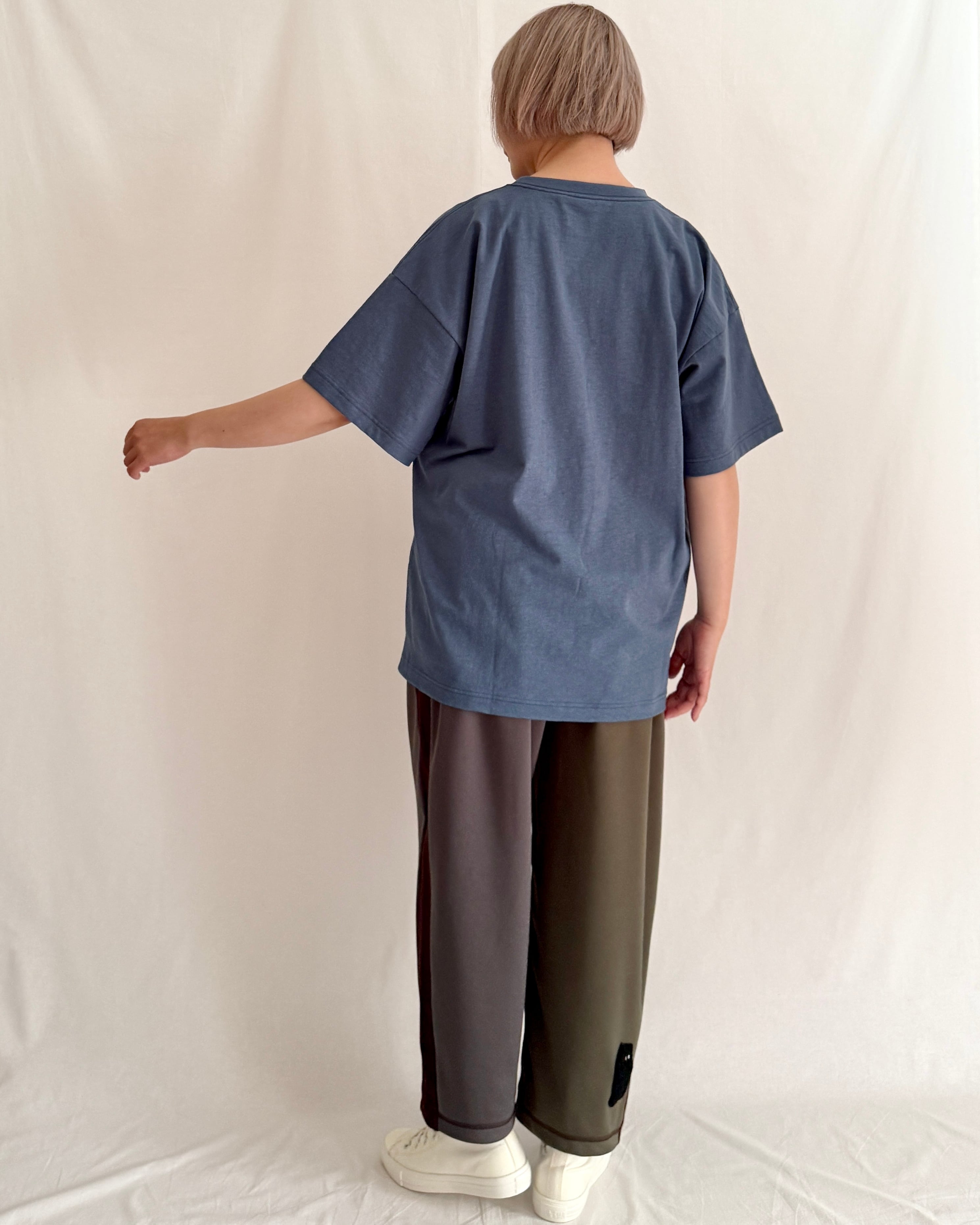 身幅にゆとりを持たせた、ドロップショルダーのビッグシルエット。袖幅も広めで、リラックス感のあるバランスに仕上げています。1枚で着ても着映えする存在感がある、男女で共有できるサイズ感です。