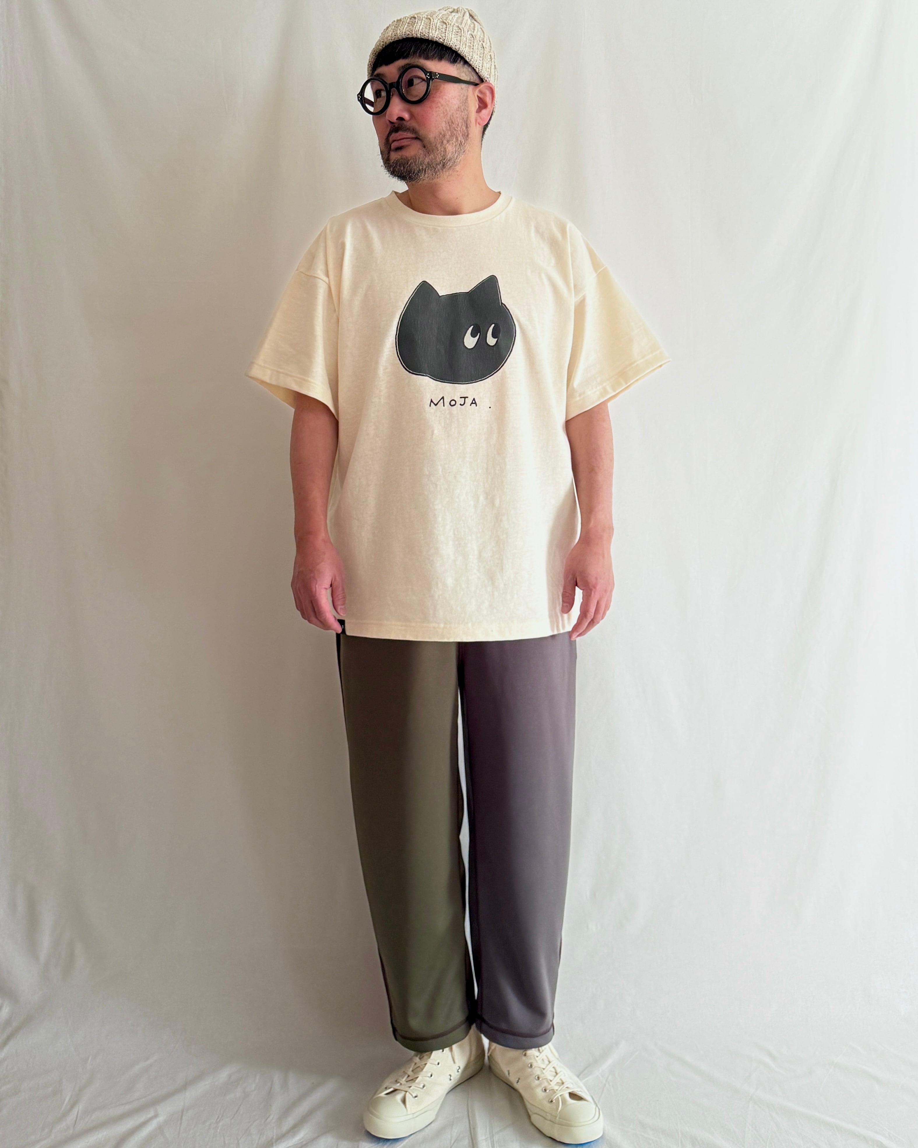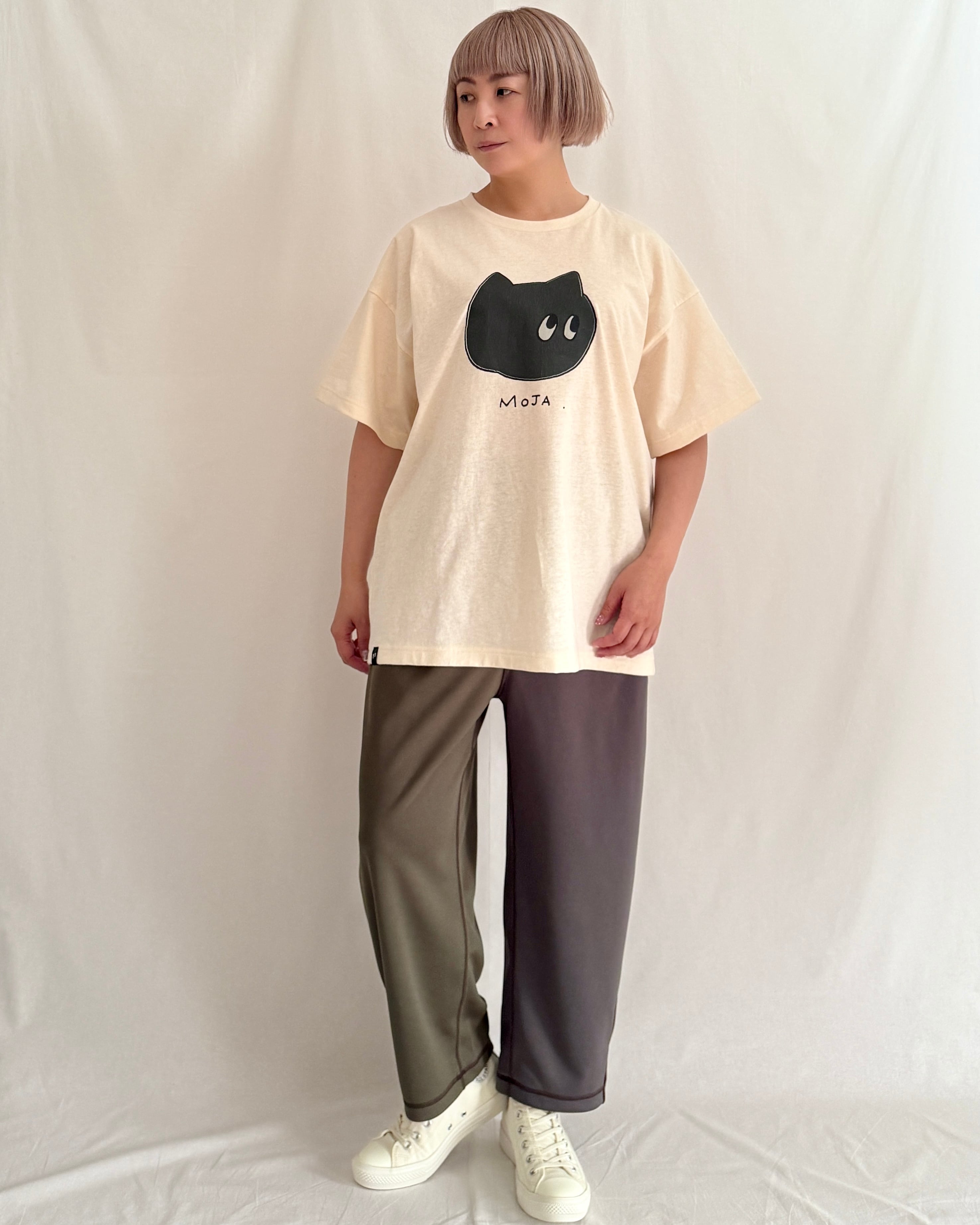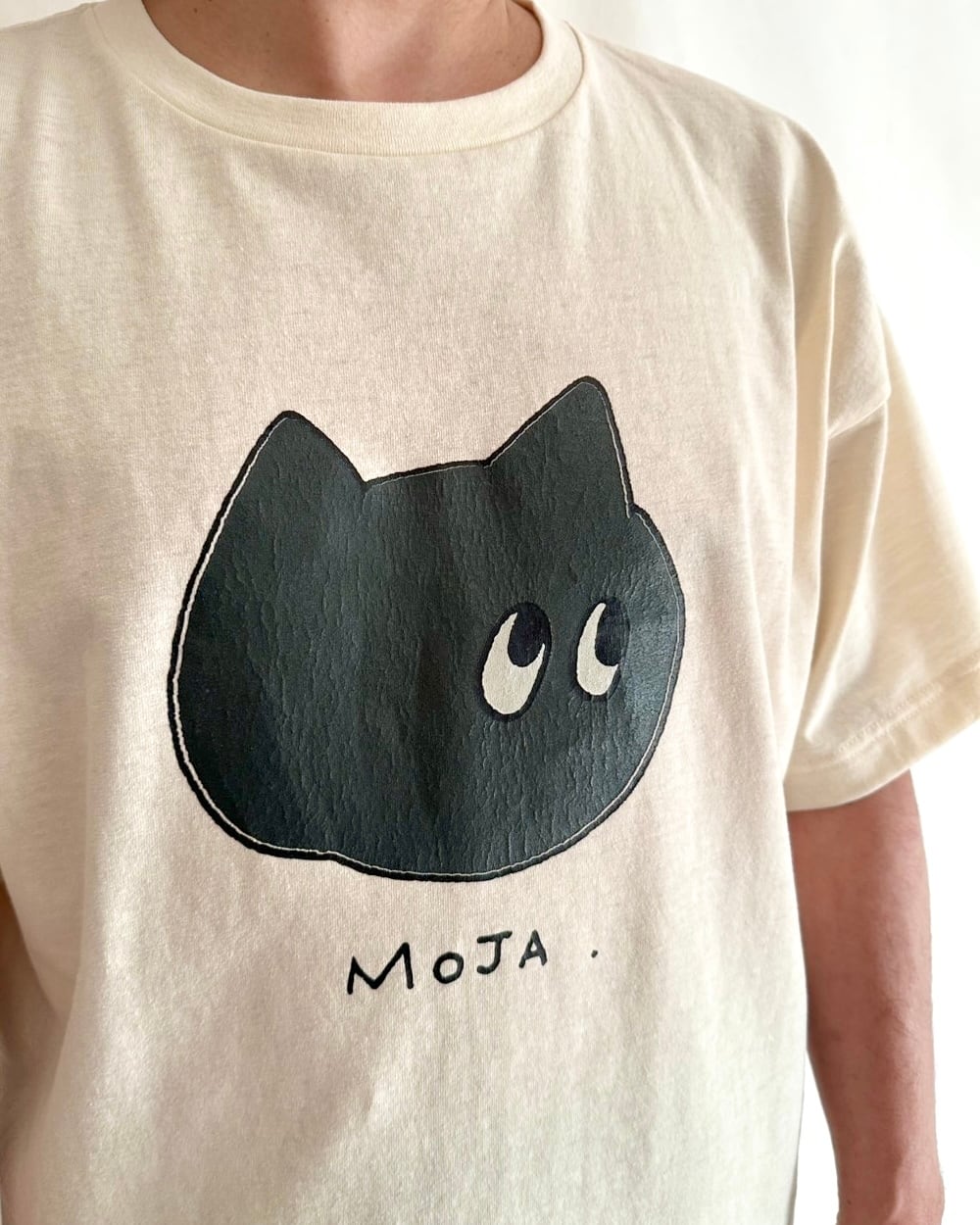 コミック風の「モジャ」をクラックプリントしたヴィンテージ感たっぷりのリラックスTシャツ。