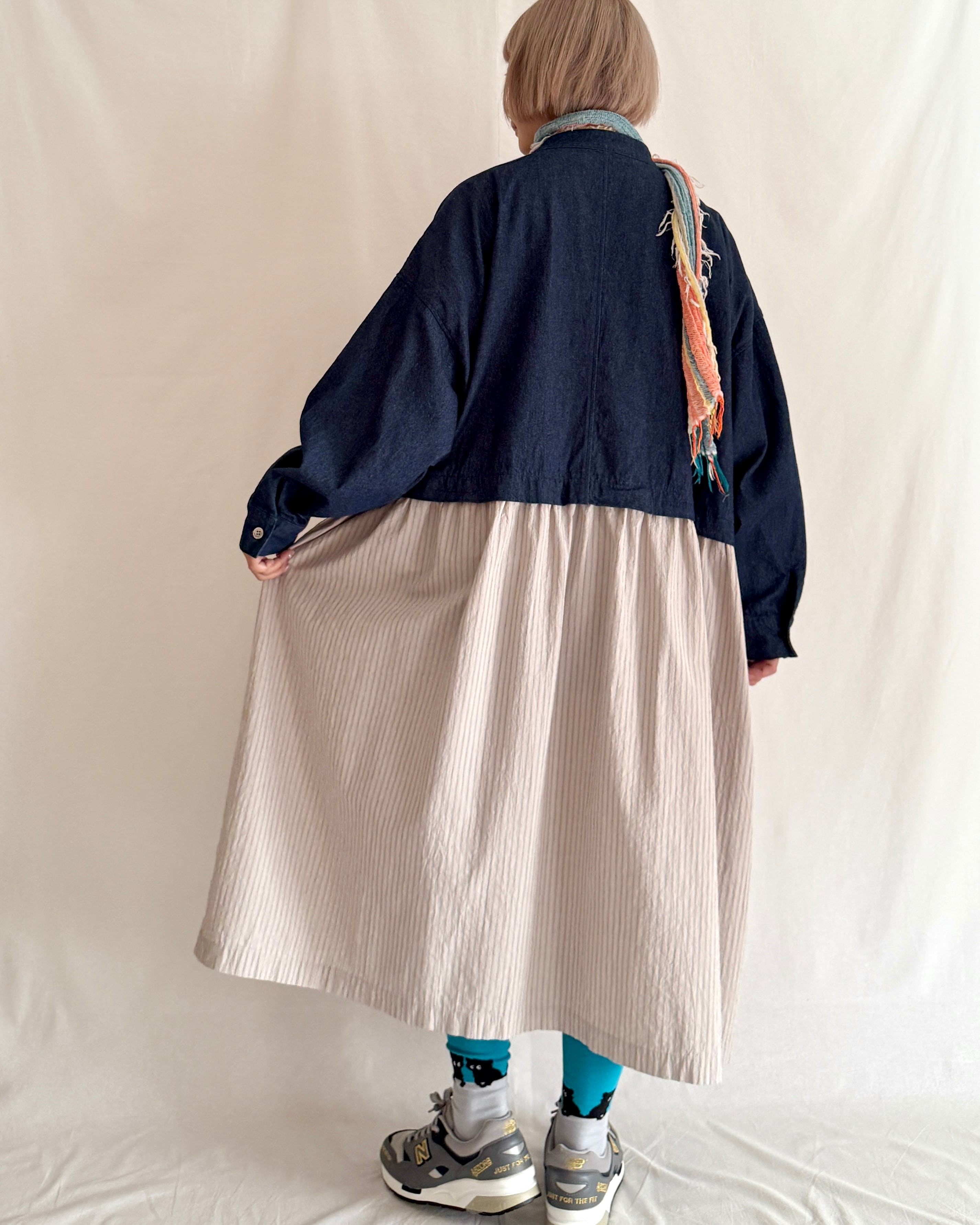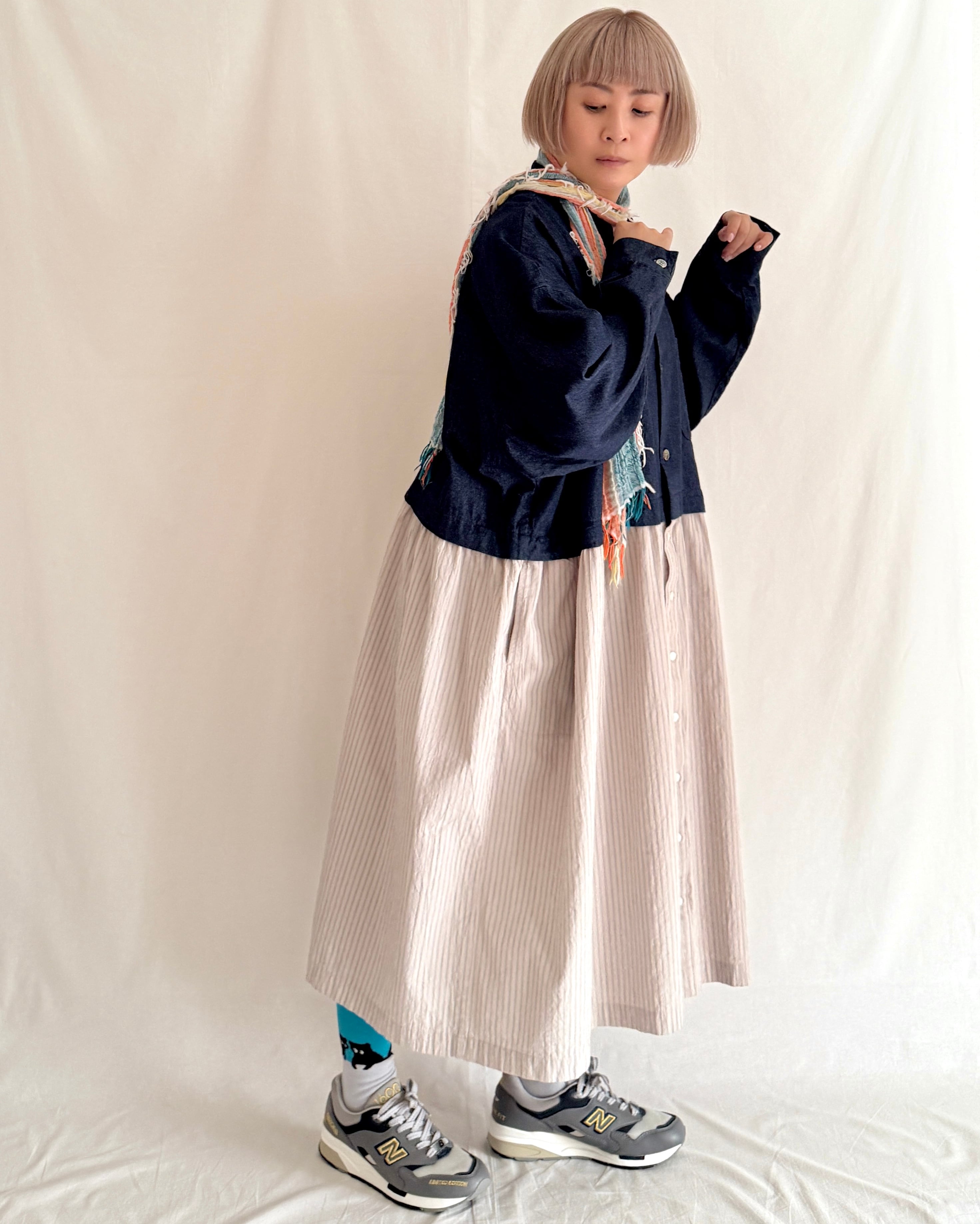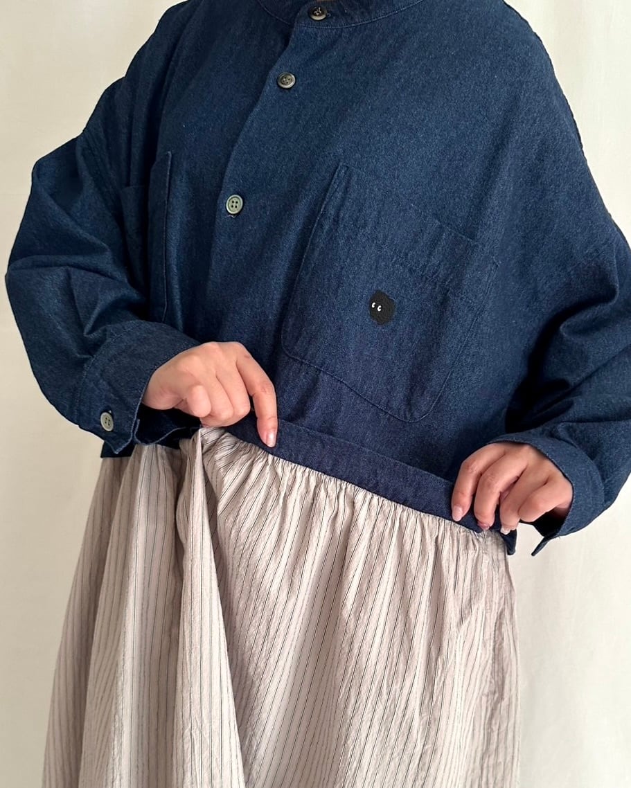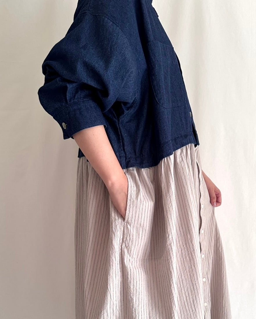 ・デニム部分には大きめの黒蝶貝ボタン、ストライプ部分には小さめのタカセ貝ボタンを使用。ボタンの色とサイズをあえて変えることで、シャツジャケットとスカートを合わせているようなデザインにこだわりました。