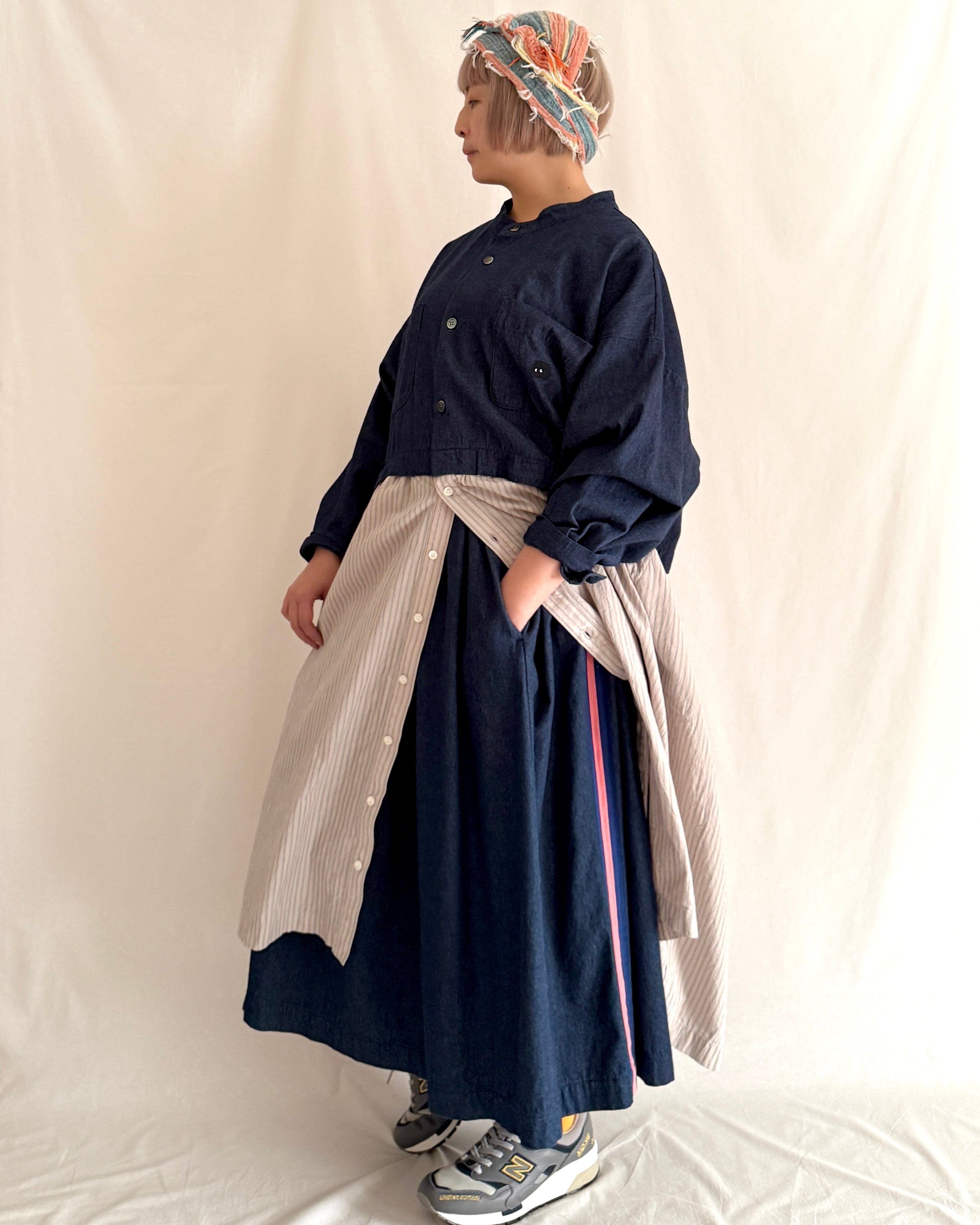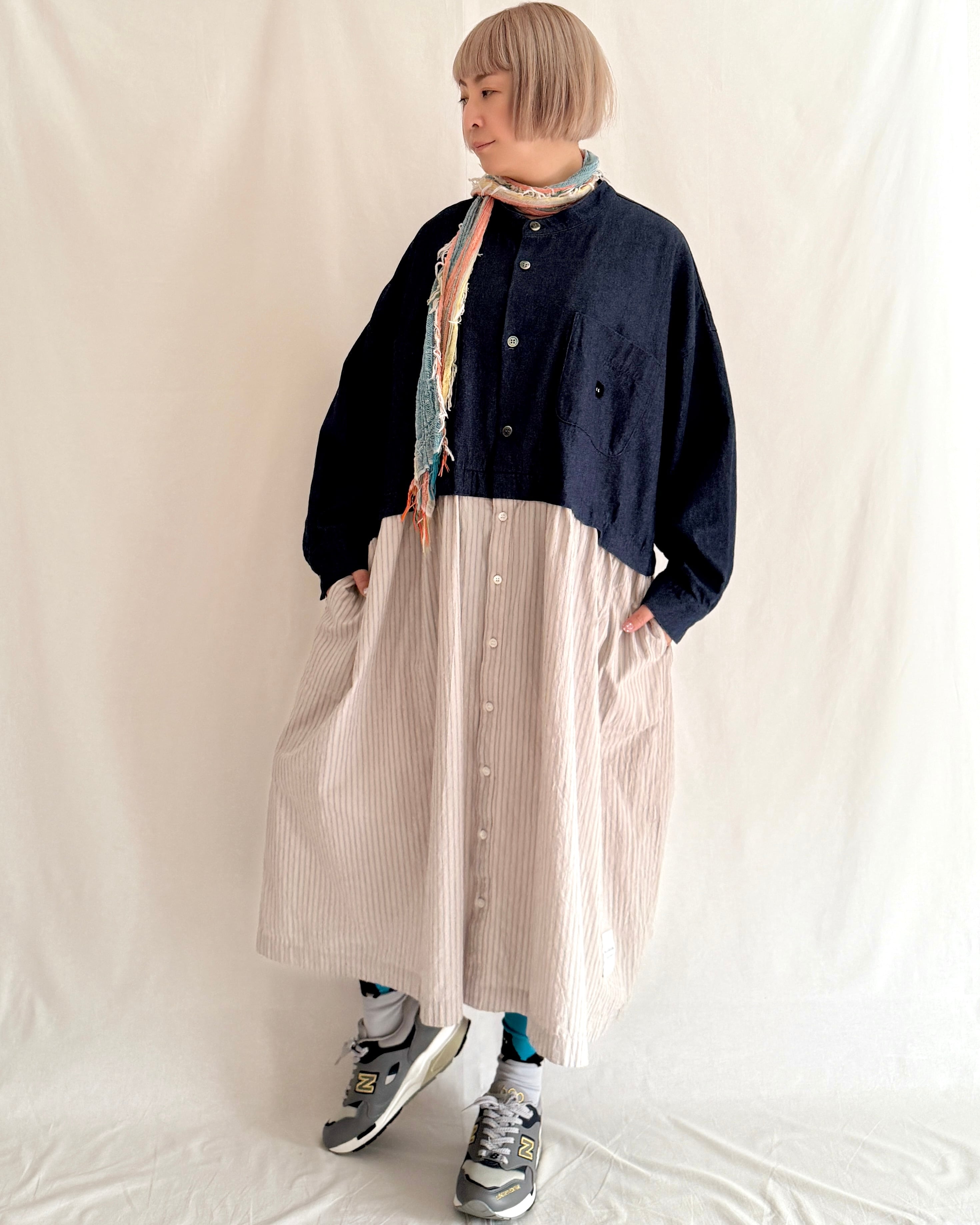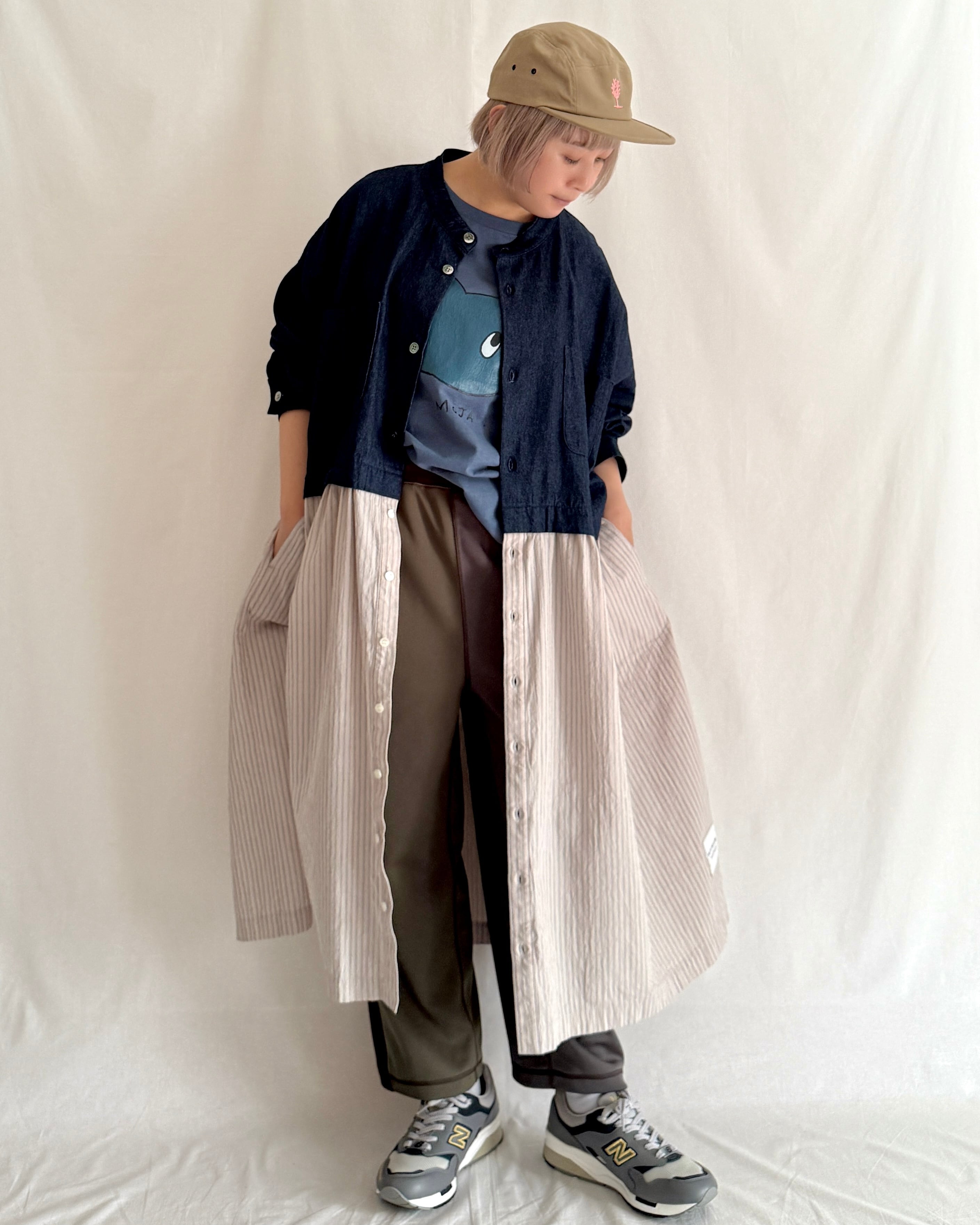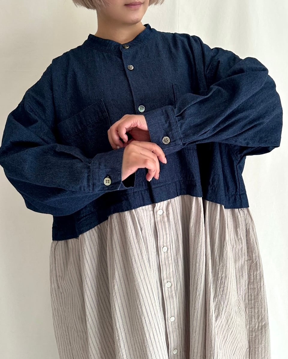 ・デニム部分には大きめの黒蝶貝ボタン、ストライプ部分には小さめのタカセ貝ボタンを使用。ボタンの色とサイズをあえて変えることで、シャツジャケットとスカートを合わせているようなデザインにこだわりました。