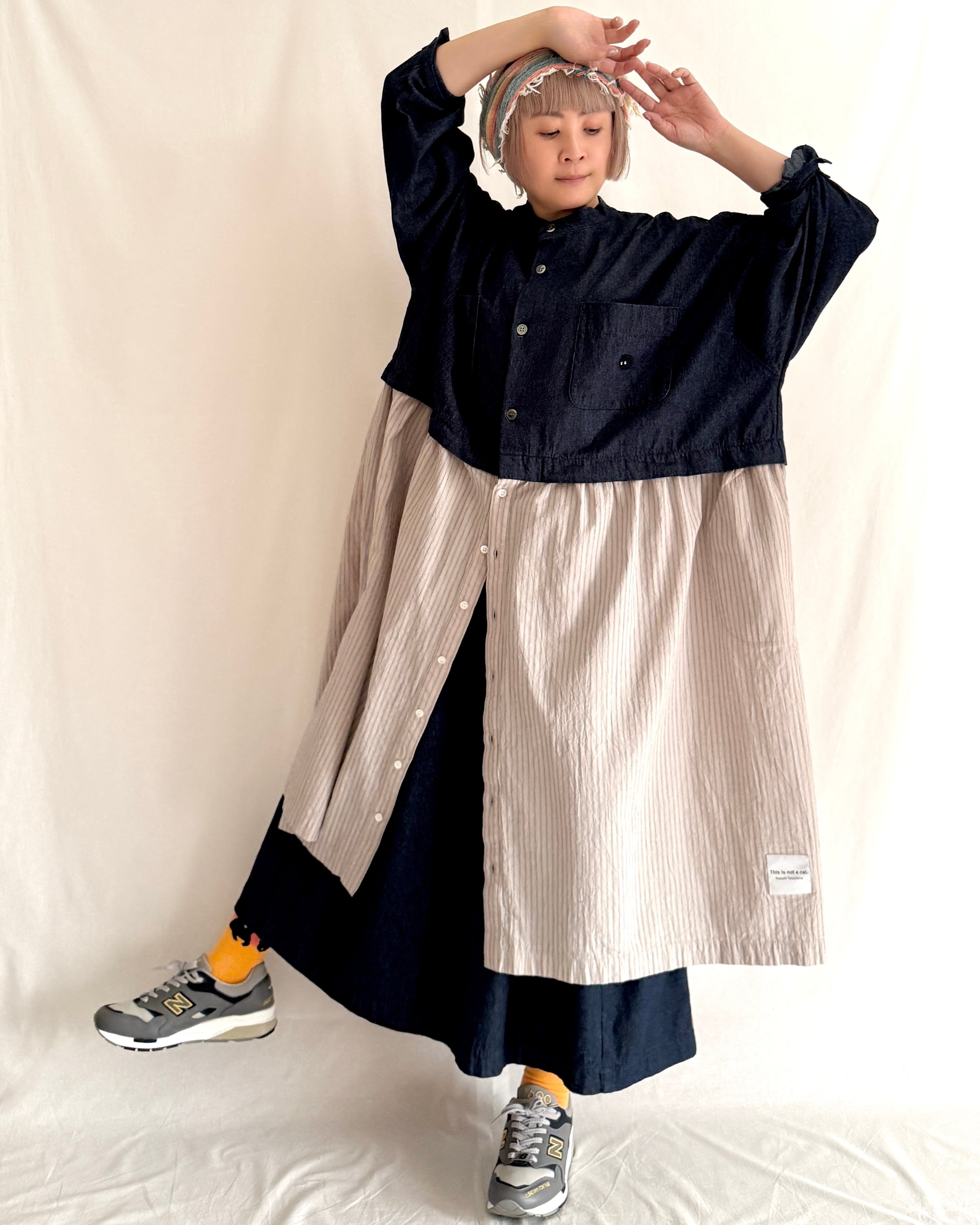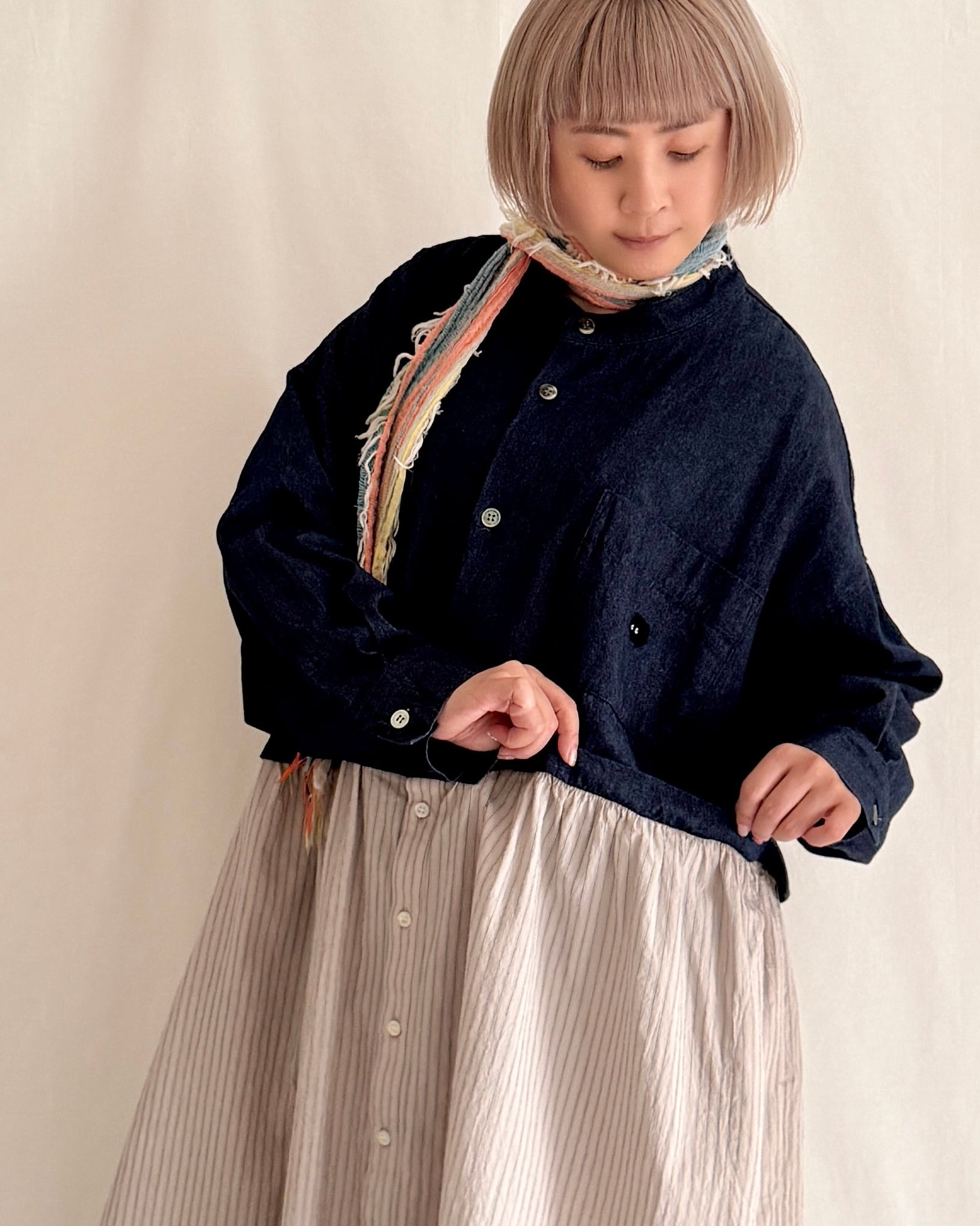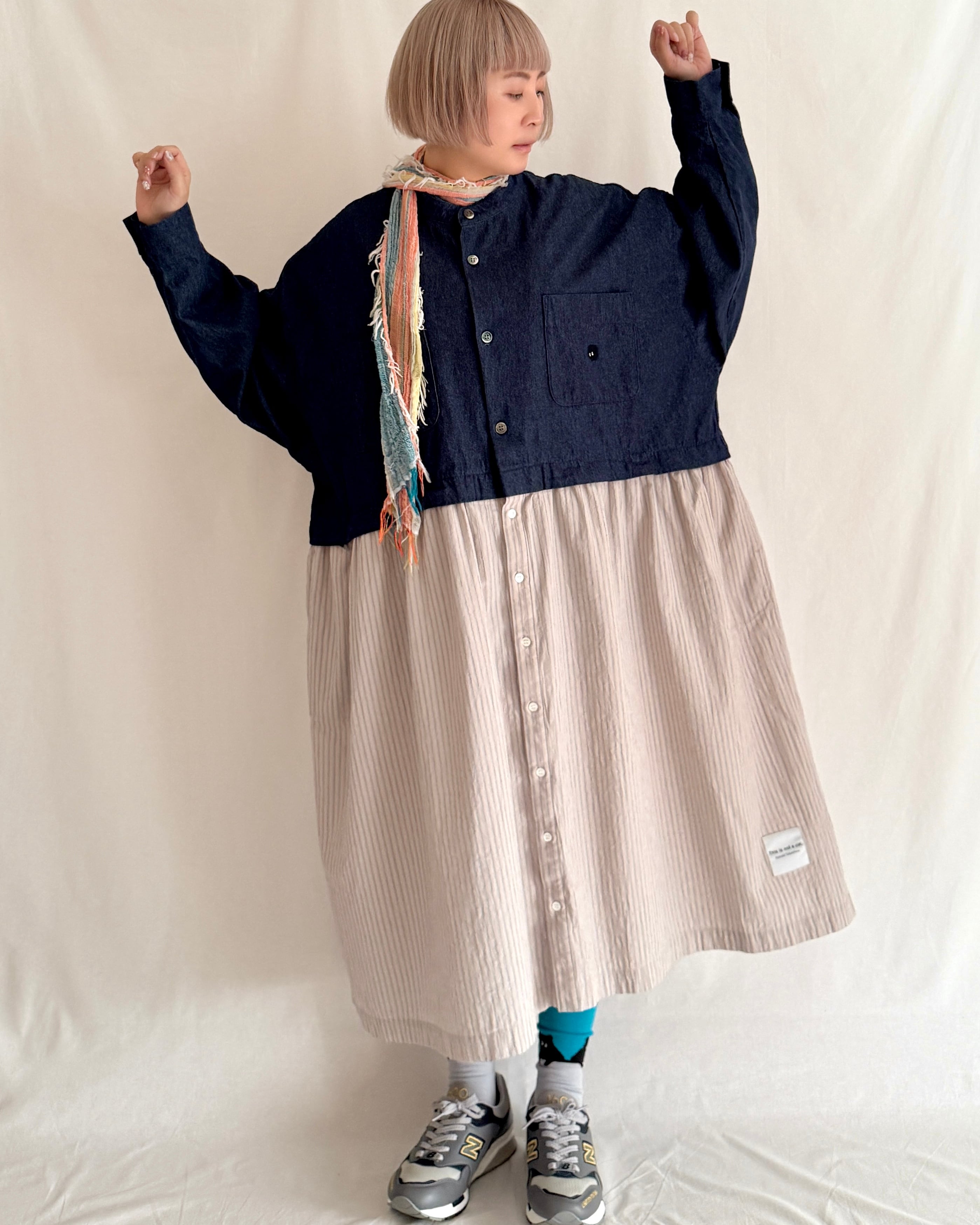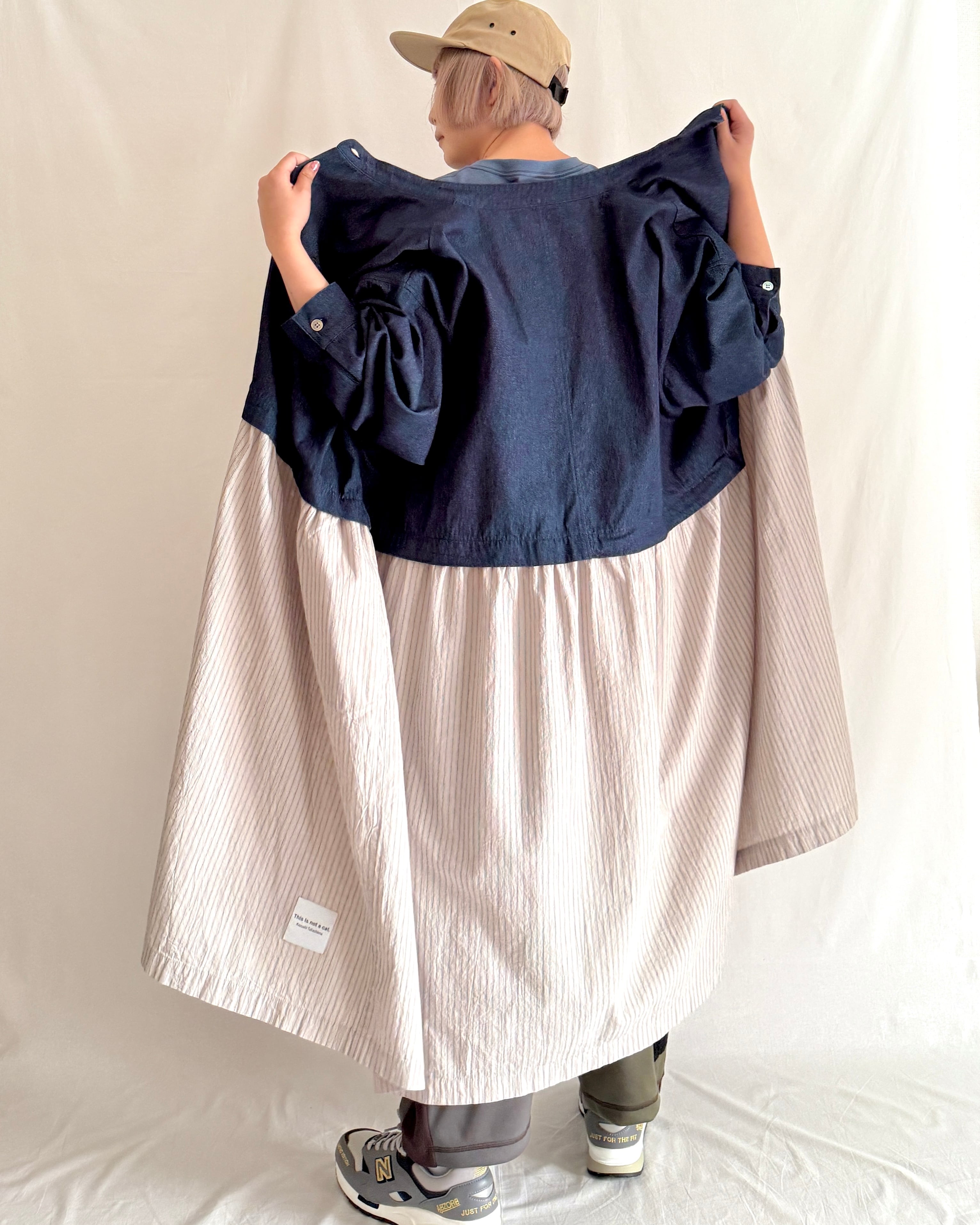 ・デニム部分には大きめの黒蝶貝ボタン、ストライプ部分には小さめのタカセ貝ボタンを使用。ボタンの色とサイズをあえて変えることで、シャツジャケットとスカートを合わせているようなデザインにこだわりました。