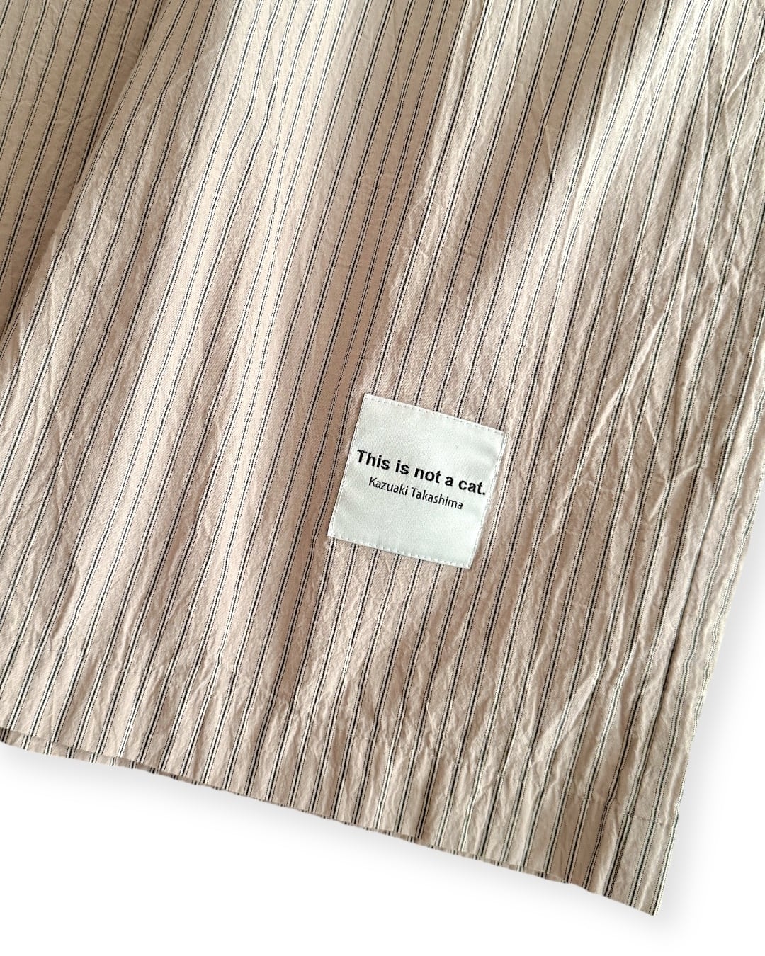 ・仕上げに製品洗い加工を施し、シャツ部分のインディゴをストライプ生地やネームにほんのり移すことで、全体のトーンを自然に調和させました。よりやわらかく、ヴィンテージ感のある表情にしています。