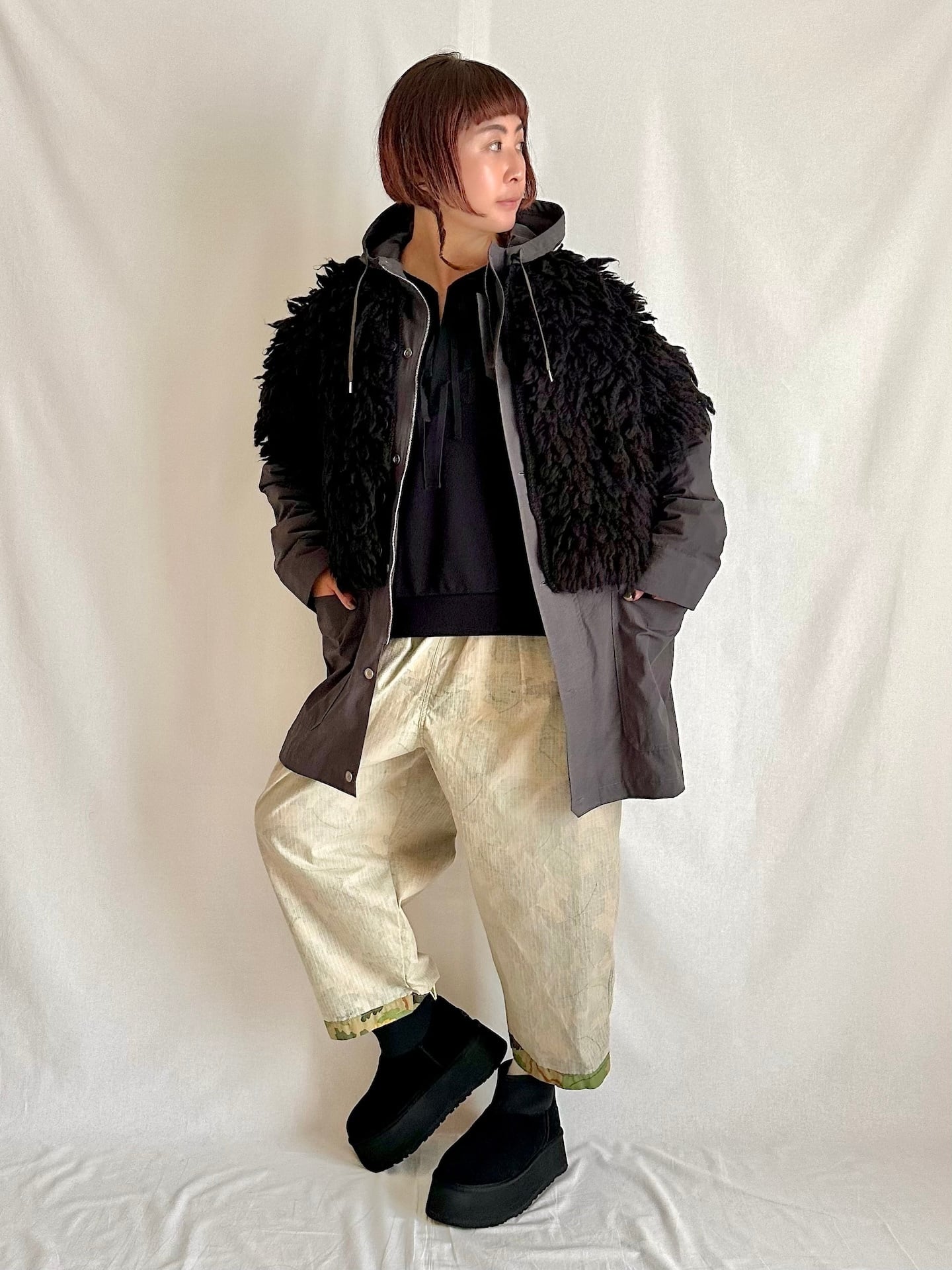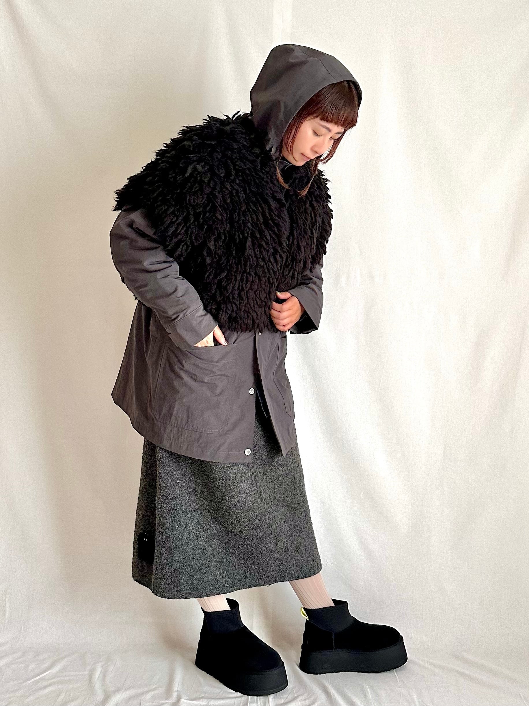 ・上質のウールをベースに、ふわふわとした弾力性をもたせるためにバルキーアクリルを一緒に紡績した紡毛糸を使用。撚りを極力少なくして、コットンに近い状態に仕上げることで、高い保温性とやさしい肌触りを兼ね備えた風合いに。