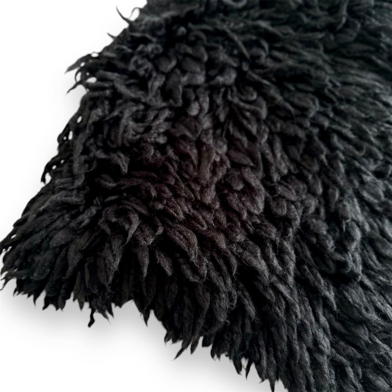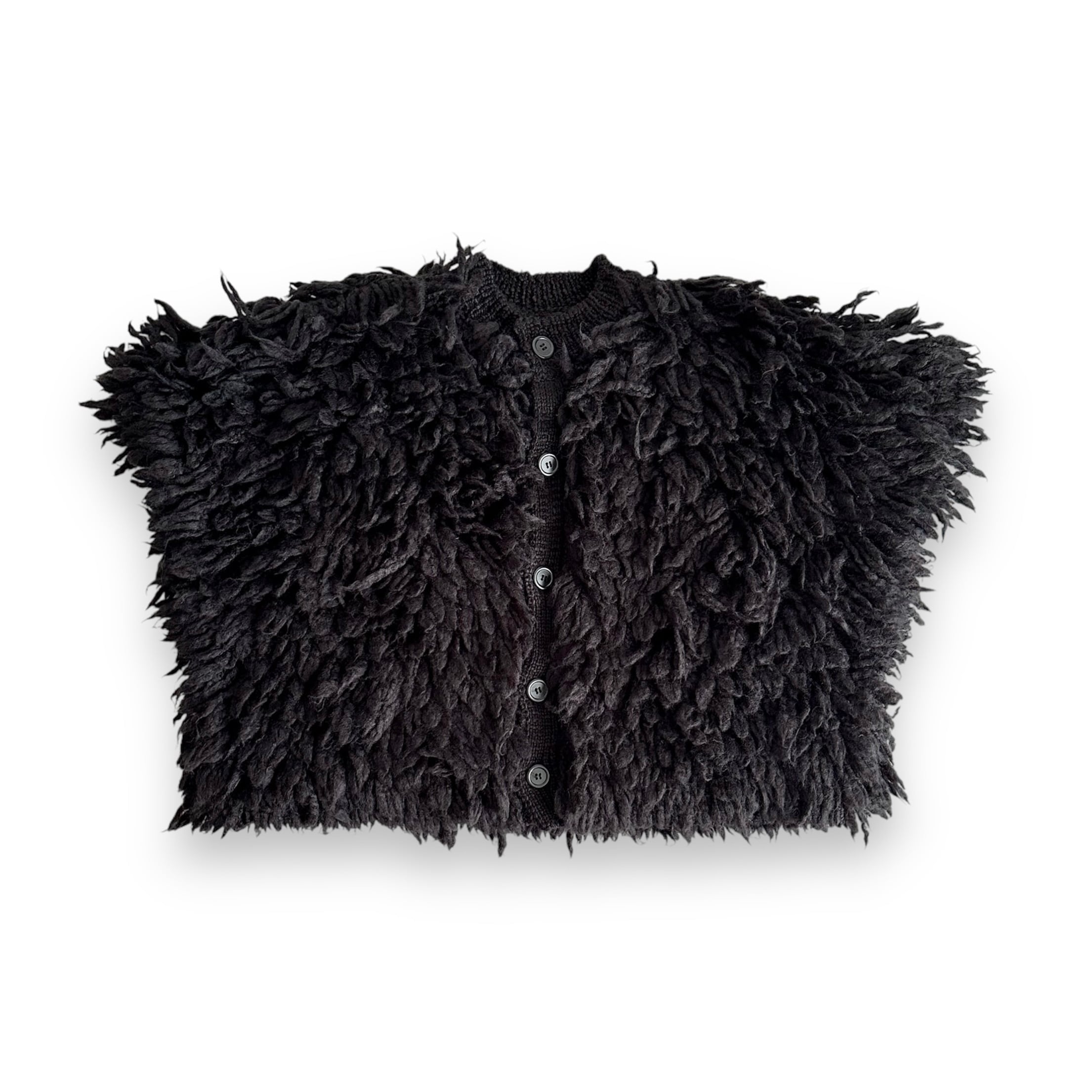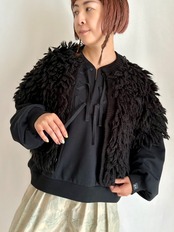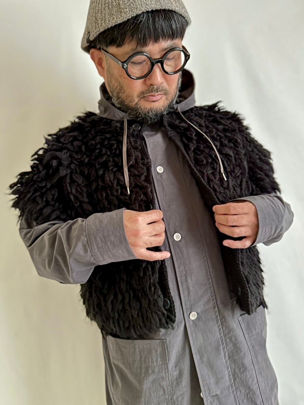 ・モジャモジャとしたルックスにこだわり、ループ編みという特殊な編み方でMOJAの毛並みを表現。編みでつくったループの先端を手作業で丁寧にカットすることで、糸端が色々な方向に向き、ユニークな表情に。襟ぐり、前立て、裾をリブ編みにすることで全体を引き締め、メリハリがあって着やすいアイテムに仕上げています。
